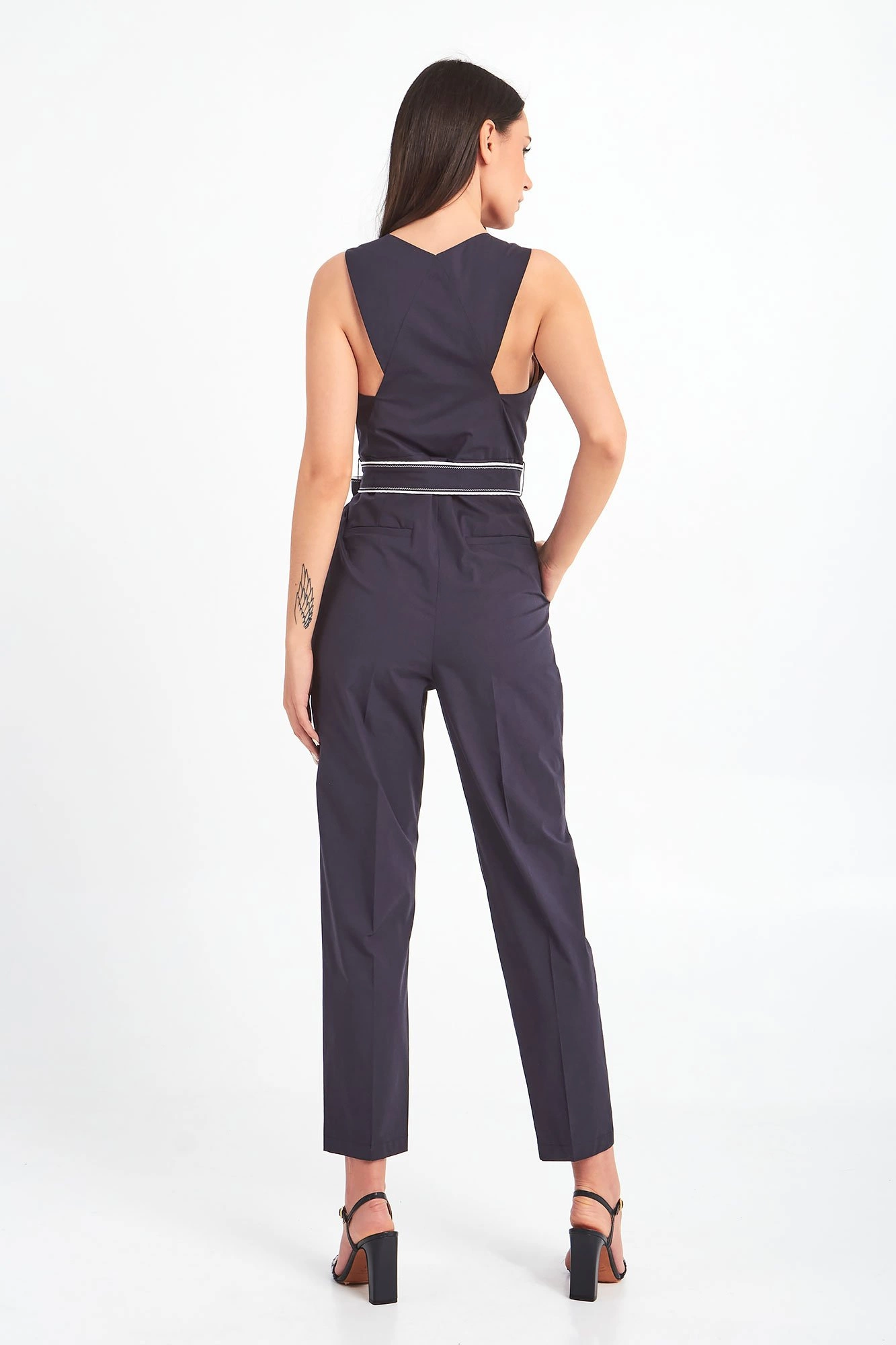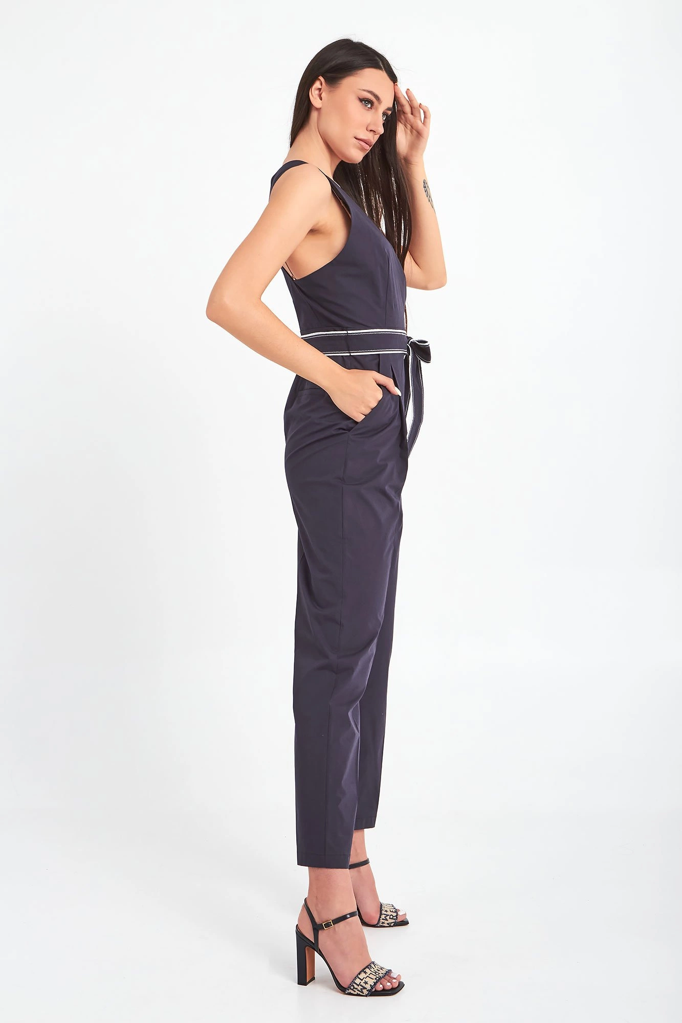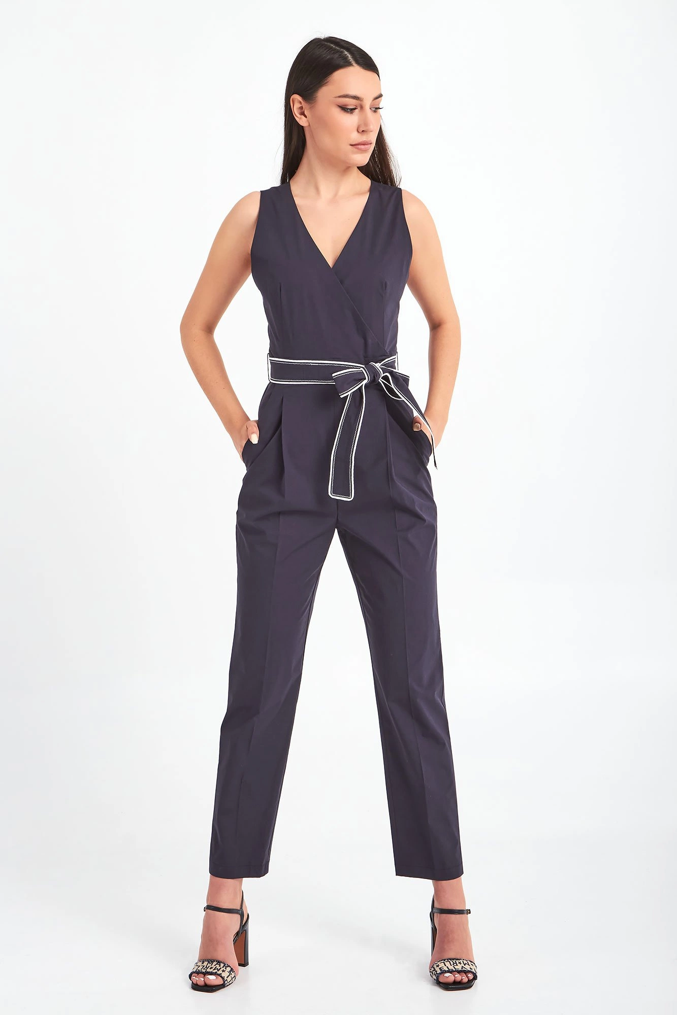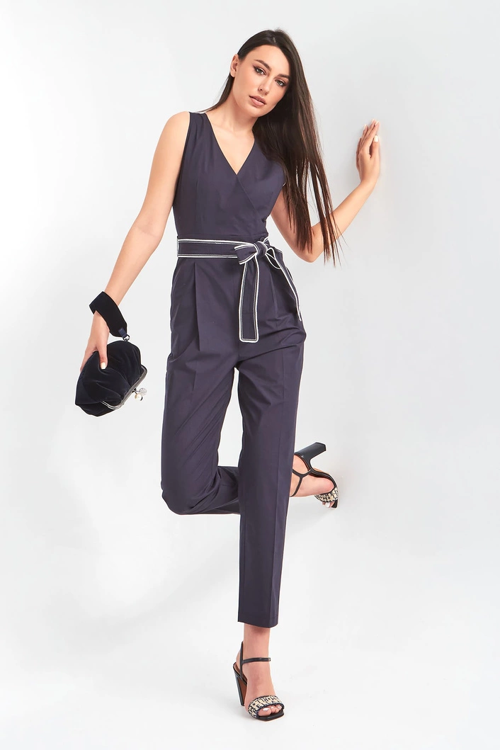 Kombinezon marki Marella. Granatowy, bez ramion. Kopertowy dekolt typu v-neck. Zapinany za pomocą guzika. W komplecie granatowo-biały pasek pozwalający lepiej dopasować kombinezon oraz podkreślić talię. Model z czterema niezapinanymi kieszeniami. Proste nogawki w kant, wykończone lamówką. Wykonany z miękkiej, przyjemnej w dotyku, bawełnianej tkaniny. Nada każdej stylizacji ponadczasowości, kobiecości, elegancji oraz sprawi, że trudno będzie przejść obok niej obojętnie.