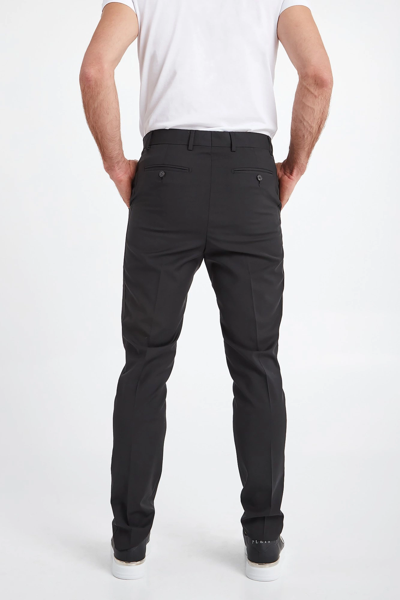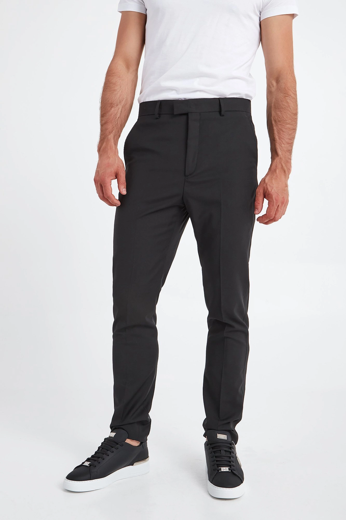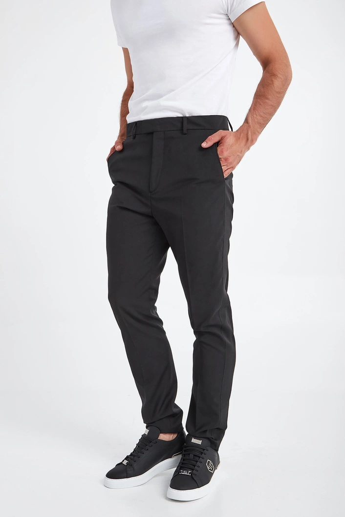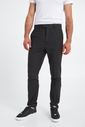 Spodnie marki Les Hommes w czarnym kolorze. Prosty fason regular fit. Zapinane na zamek, haftki i guzik. Z przodu dwie niezapinane kieszenie. Z tyłu dwie zapinane na sygnowane guziki. Nogawki w kant, zwężające się ku dołowi. Po bokach lampasy. Spodnie wykonane z połączenia najwyższej jakości wełny z włóknami innych materiałów. Idealne jako element stylizacji nowoczesnego i eleganckiego mężczyzny.