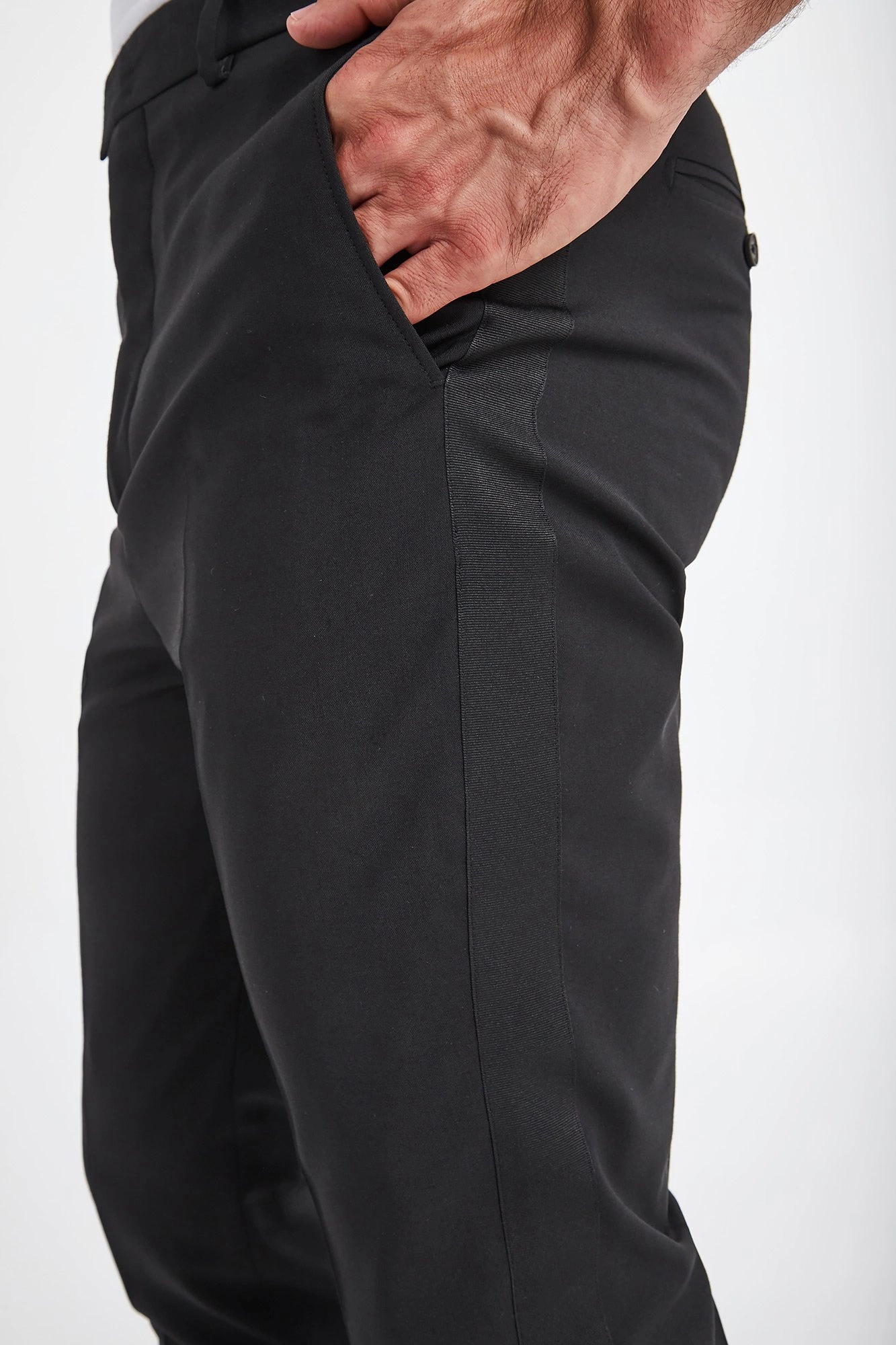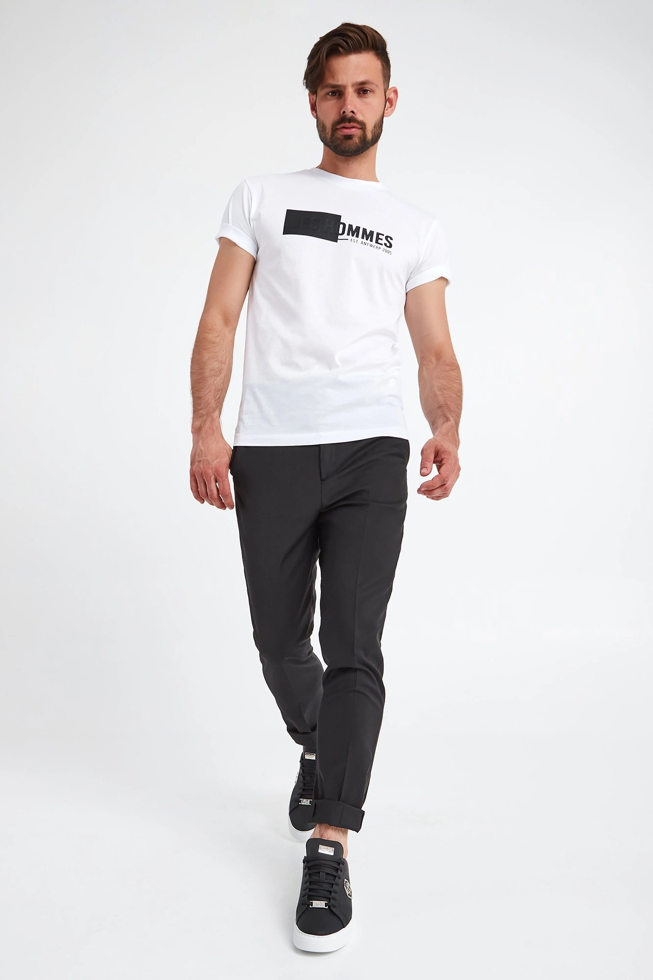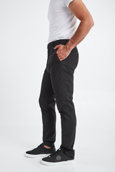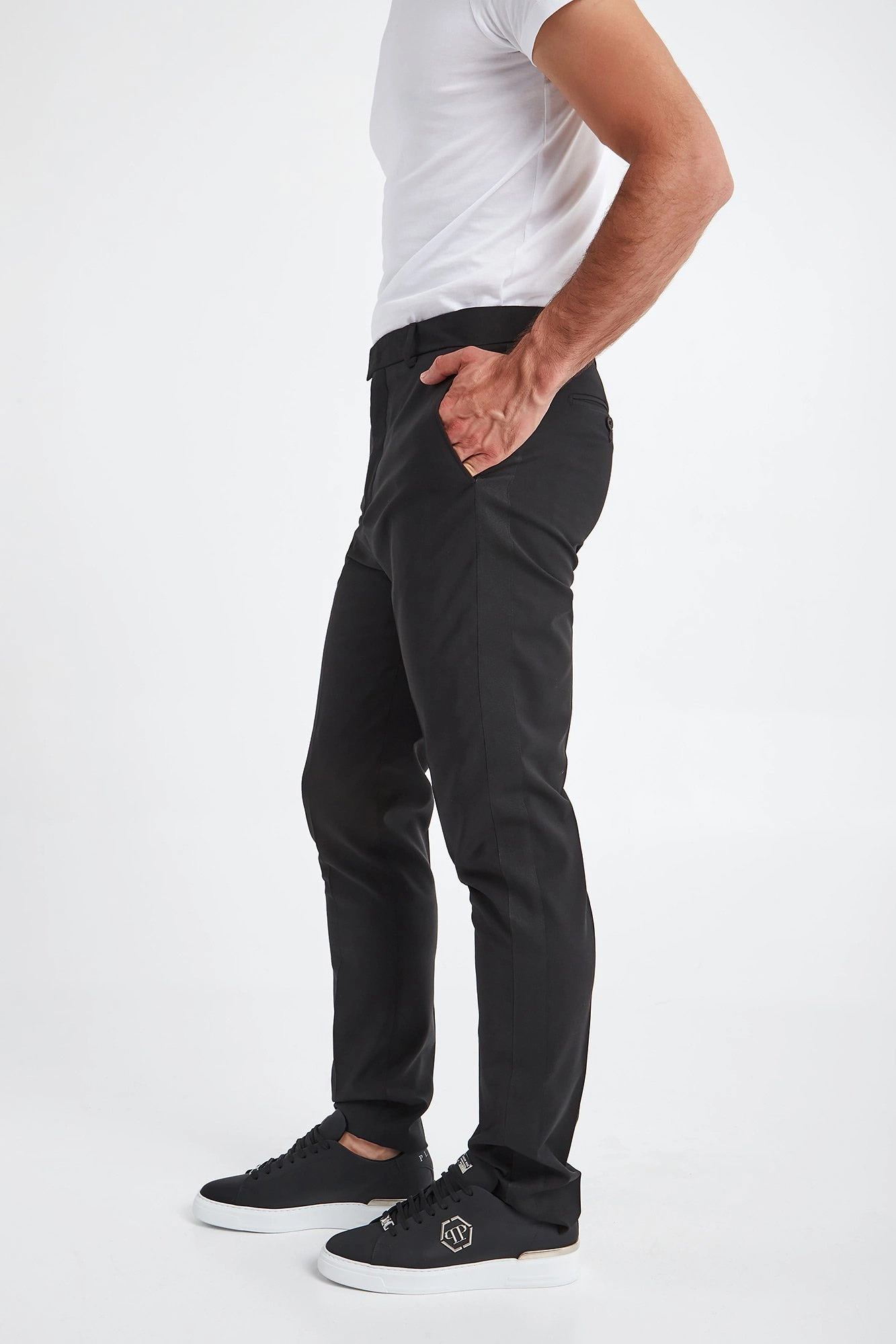 Spodnie marki Les Hommes w czarnym kolorze. Prosty fason regular fit. Zapinane na zamek, haftki i guzik. Z przodu dwie niezapinane kieszenie. Z tyłu dwie zapinane na sygnowane guziki. Nogawki w kant, zwężające się ku dołowi. Po bokach lampasy. Spodnie wykonane z połączenia najwyższej jakości wełny z włóknami innych materiałów. Idealne jako element stylizacji nowoczesnego i eleganckiego mężczyzny.