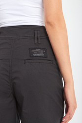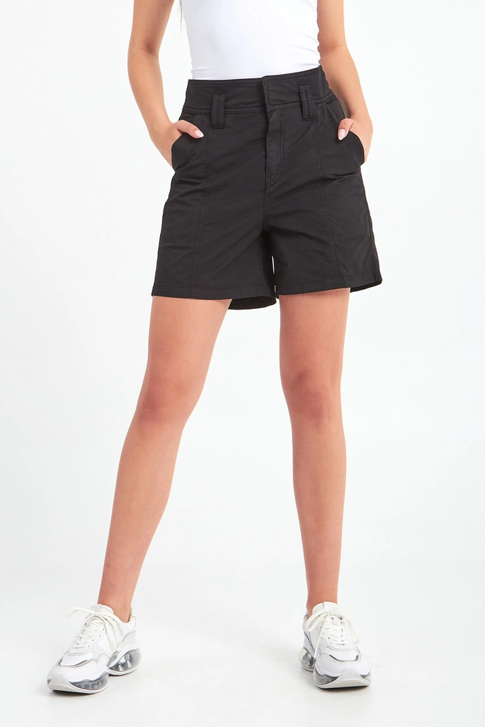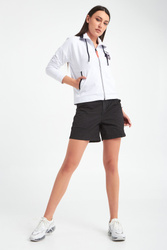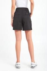 Spodenki marki Aeronautica Militare w czarnym kolorze. Modny fason paperbag. Zapinane na zamek i haftki. Model z czterema kieszeniami. Na prawą tylną tłoczona aplikacja z nazwą marki, zdobiona brokatem. Spodenki wykonane z wysokiej jakości bawełny z dodatkiem elastanu. Seria Iconic Flight, charakteryzująca się zbalansowanym połączeniem militariów i mody, podkreślająca wyjątkowy i wyrazisty styl.