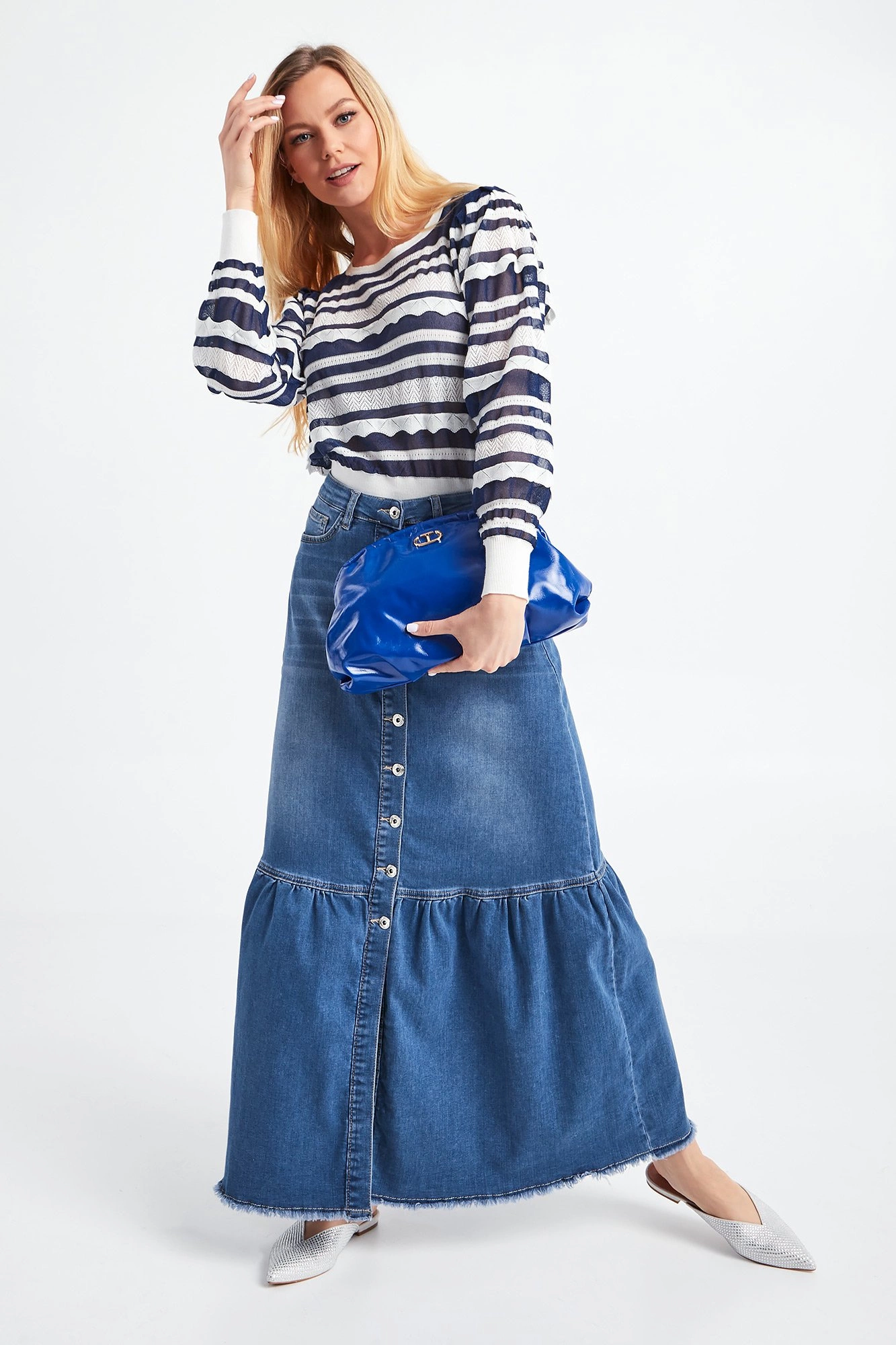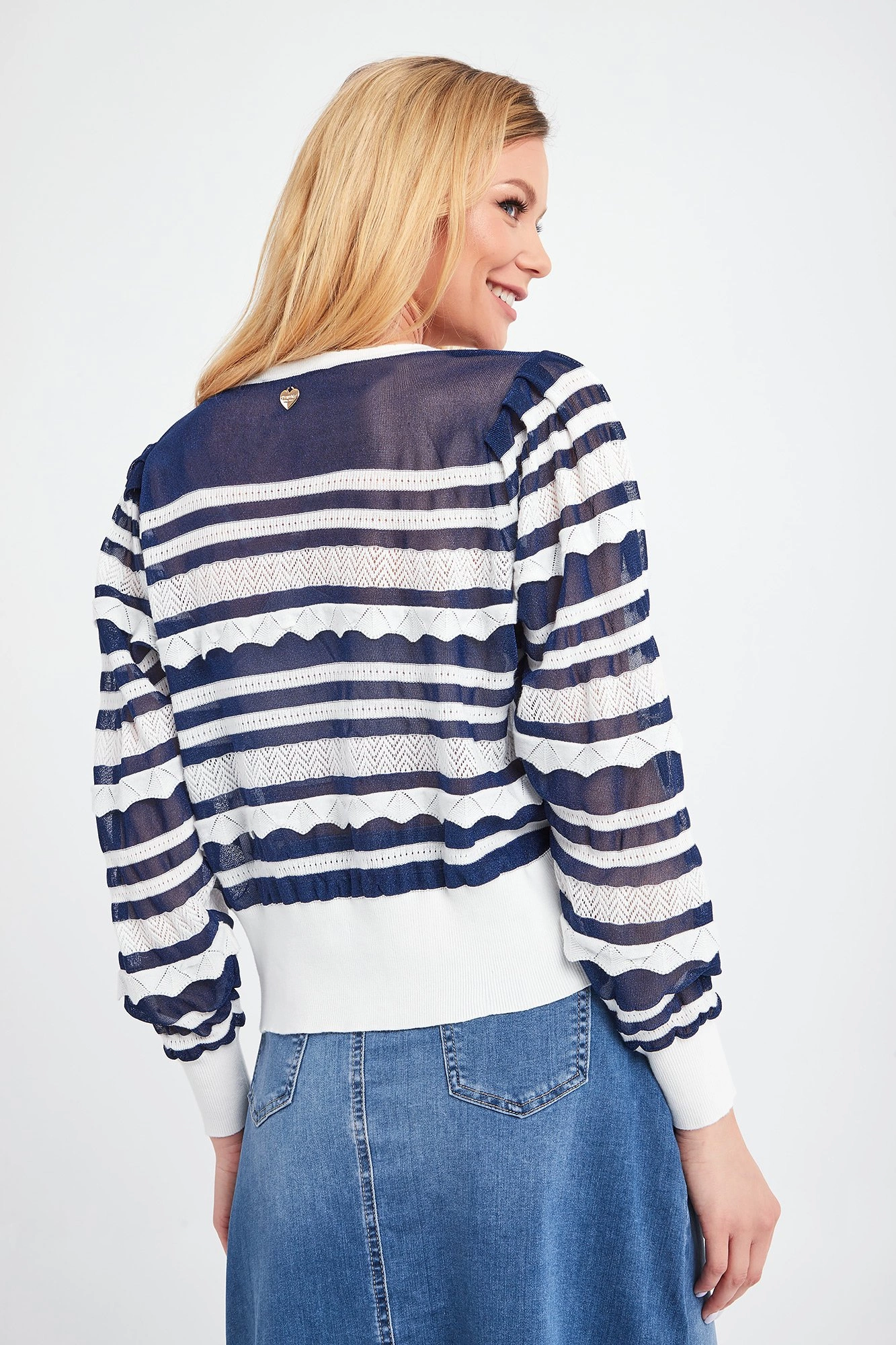 Sweter marki Twinset. Delikatnie luźniejszy krój. W biało-granatowe paski. Białe paski ażurowe, granatowe z połyskującej nici. Dekolt o-neck wykończony ozdobnie wykrajaną lamówką. Długie, szersze rękawy oraz dół swetra zakończone ściągaczami. Z tyłu, na linii karku złota, sygnowana logo marki zawieszka w kształcie serca. Wykonany z lekkiej, bawełnianej tkaniny. Idealna, ponadczasowa, kobieca baza każdej stylizacji.