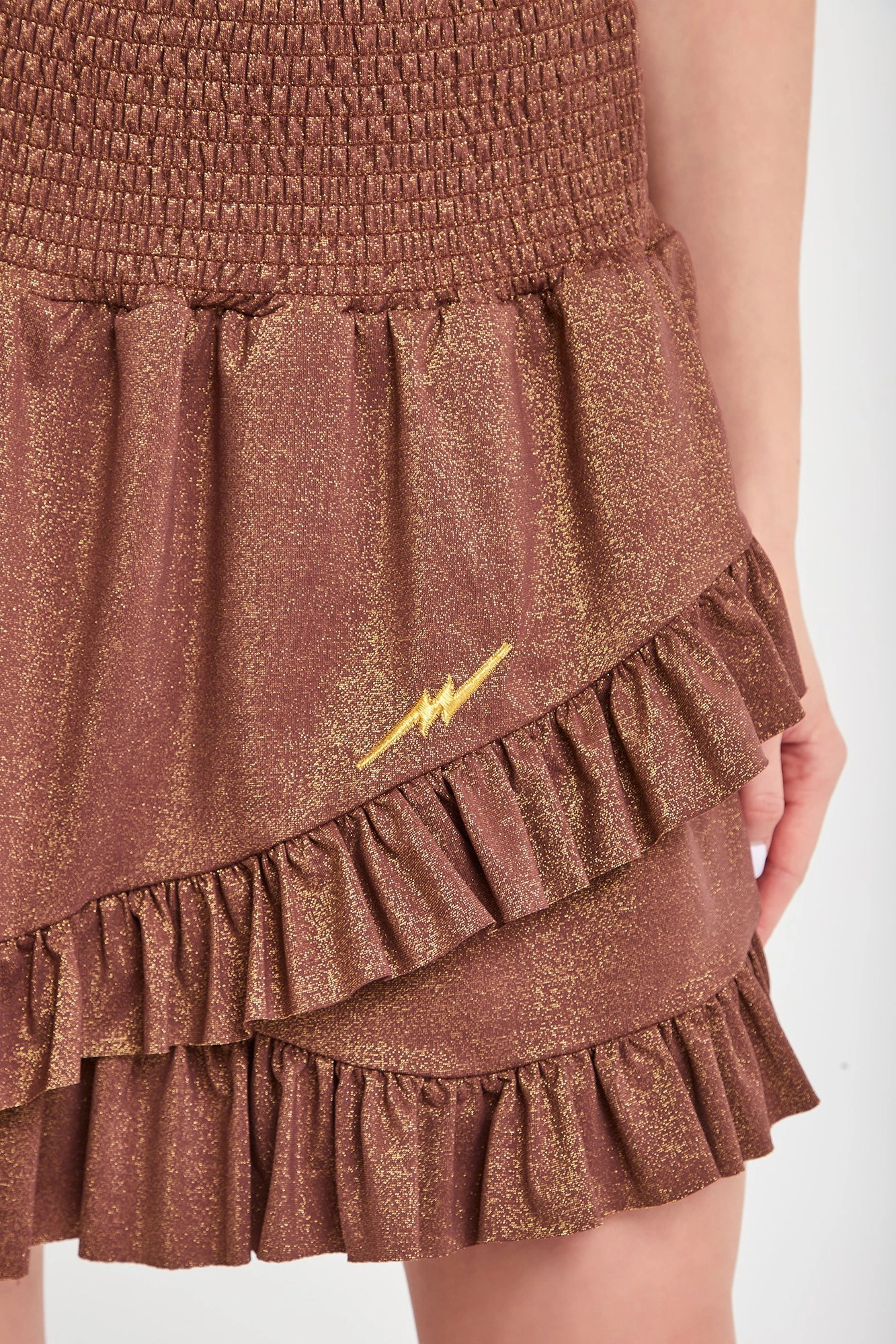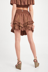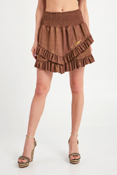 Spódnica marki Twinset U&B. Brązowa, przeszywana złotą nicią, o długości mini. W pasie marszczenie pozwalające lepiej dopasować spódnicę oraz podkreśli talię. U dołu ozdobne falbany. Z lewej strony haftowana, złota błyskawica. Z tyłu złota, sygnowana logo marki zawieszka w kształcie serca. Wykonana z przyjemnego w dotyku, przewiewnego dżerseju lamé. Idealnie sprawdzi się w każdej plażowej, i nie tylko, stylizacji, nadając jej kobiecości oraz nietuzinkowości.