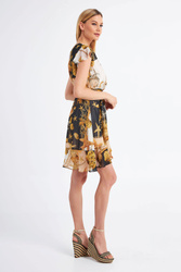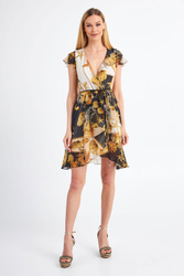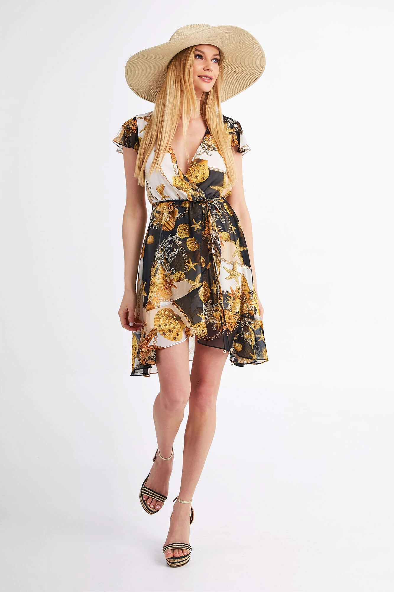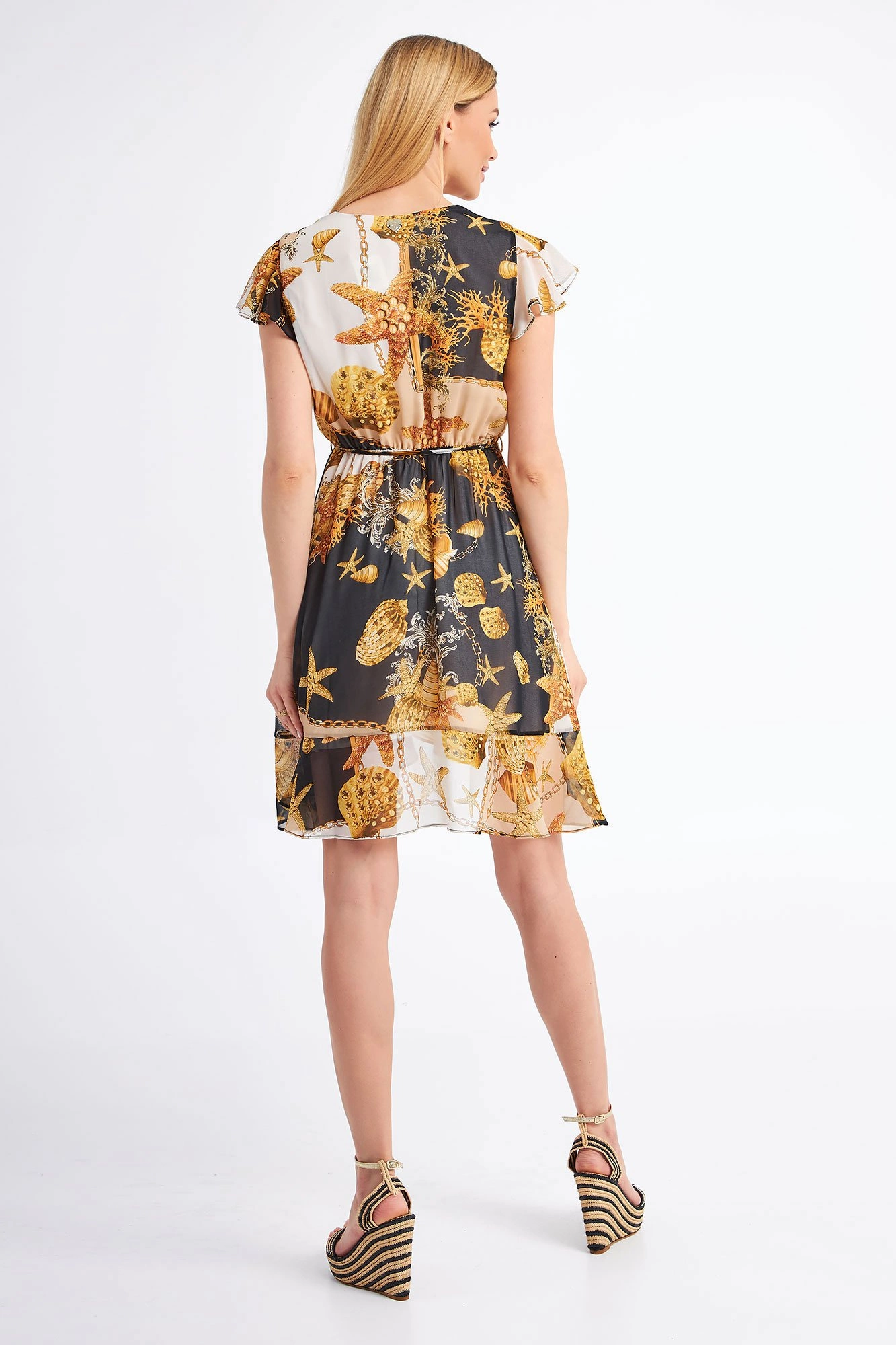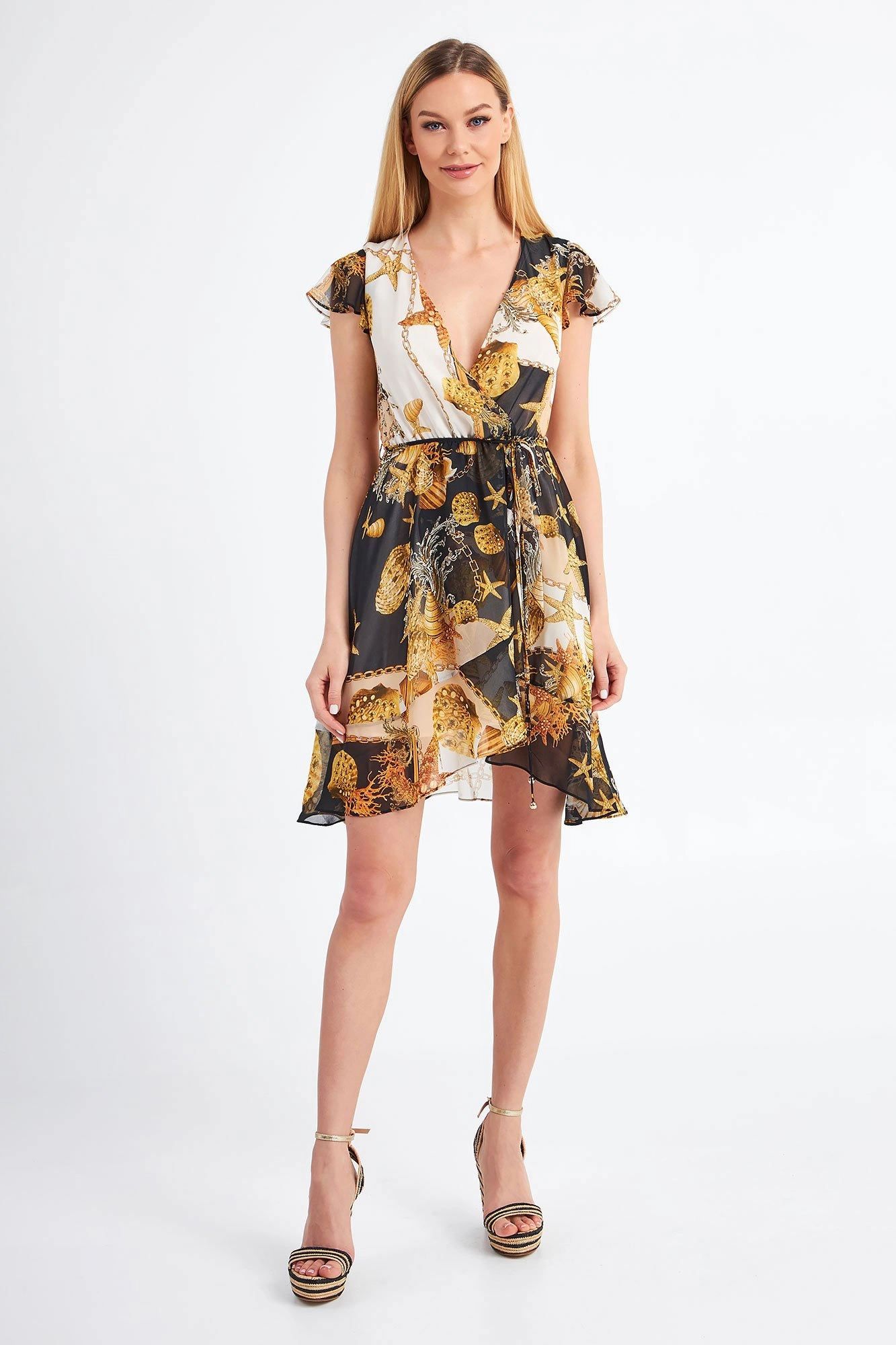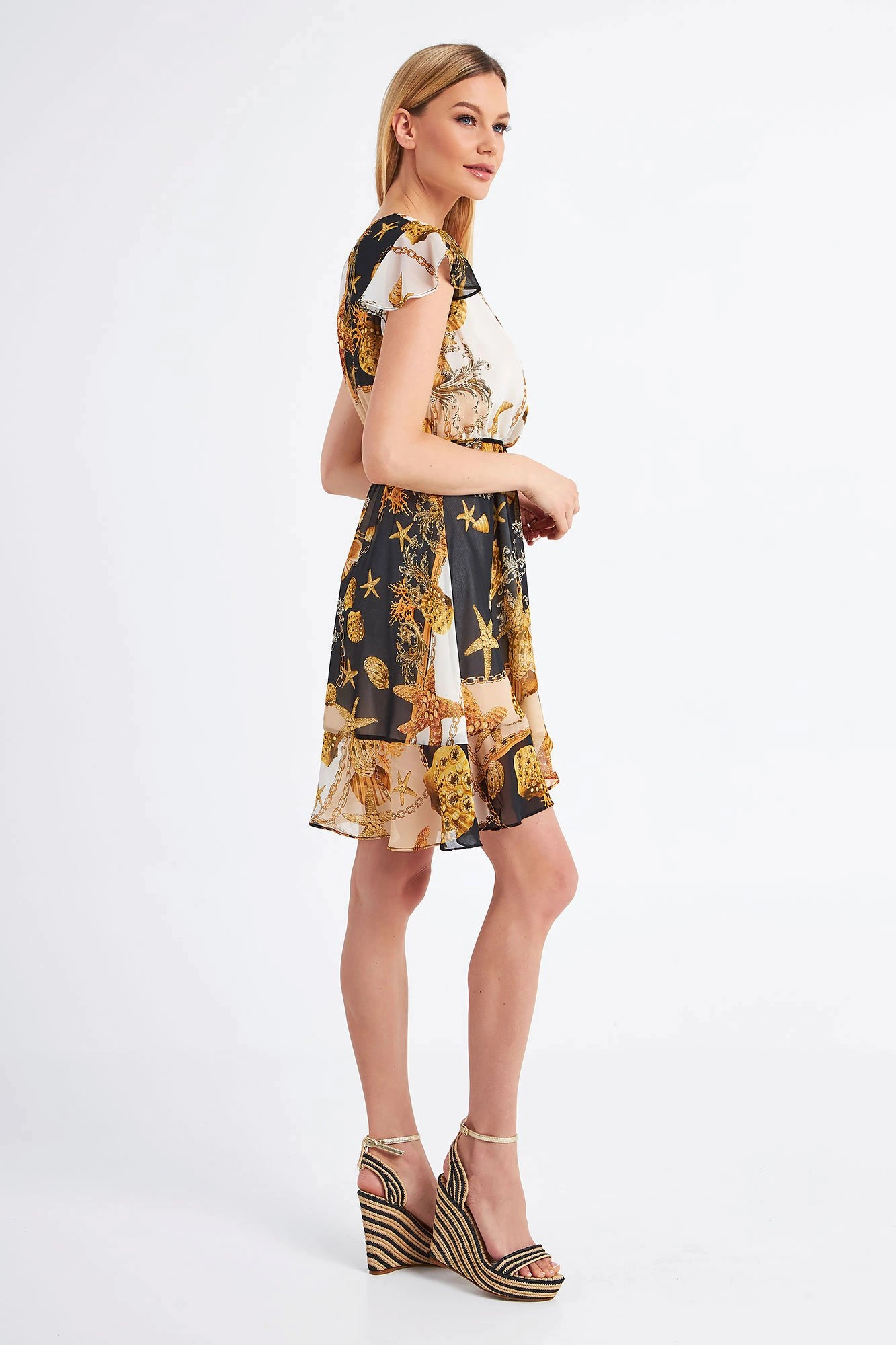 Sukienka marki Twinset U&B. W beżowo-czarnym kolorze. Na całości złoty, barokowy nadruk z motywem oceanu. Regularny krój, długość mini. Kopertowy dekolt typu v-neck. Krótkie rękawy oraz dół wykończone falbanami. W pasie odcięcie podkreślające sylwetkę. W zestawie sznureczek z ozdobnymi, złotymi stoperami. Wykonana z przyjemnej w dotyku, przewiewnej tkaniny. Kobieca, zwiewna i nietuzinkowa. Idealnie sprawdzi się w każdej wiosenno-letniej stylizacji.