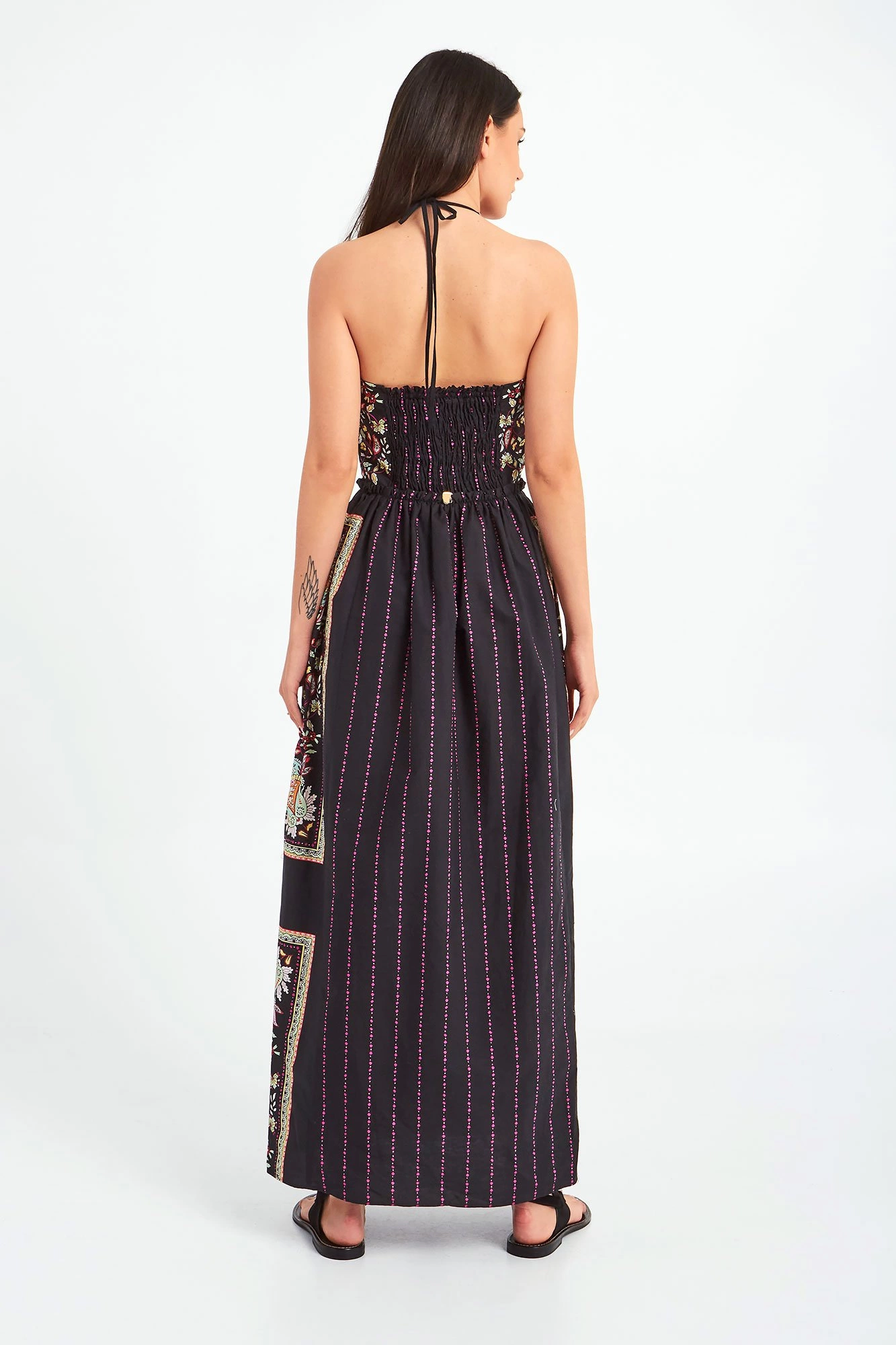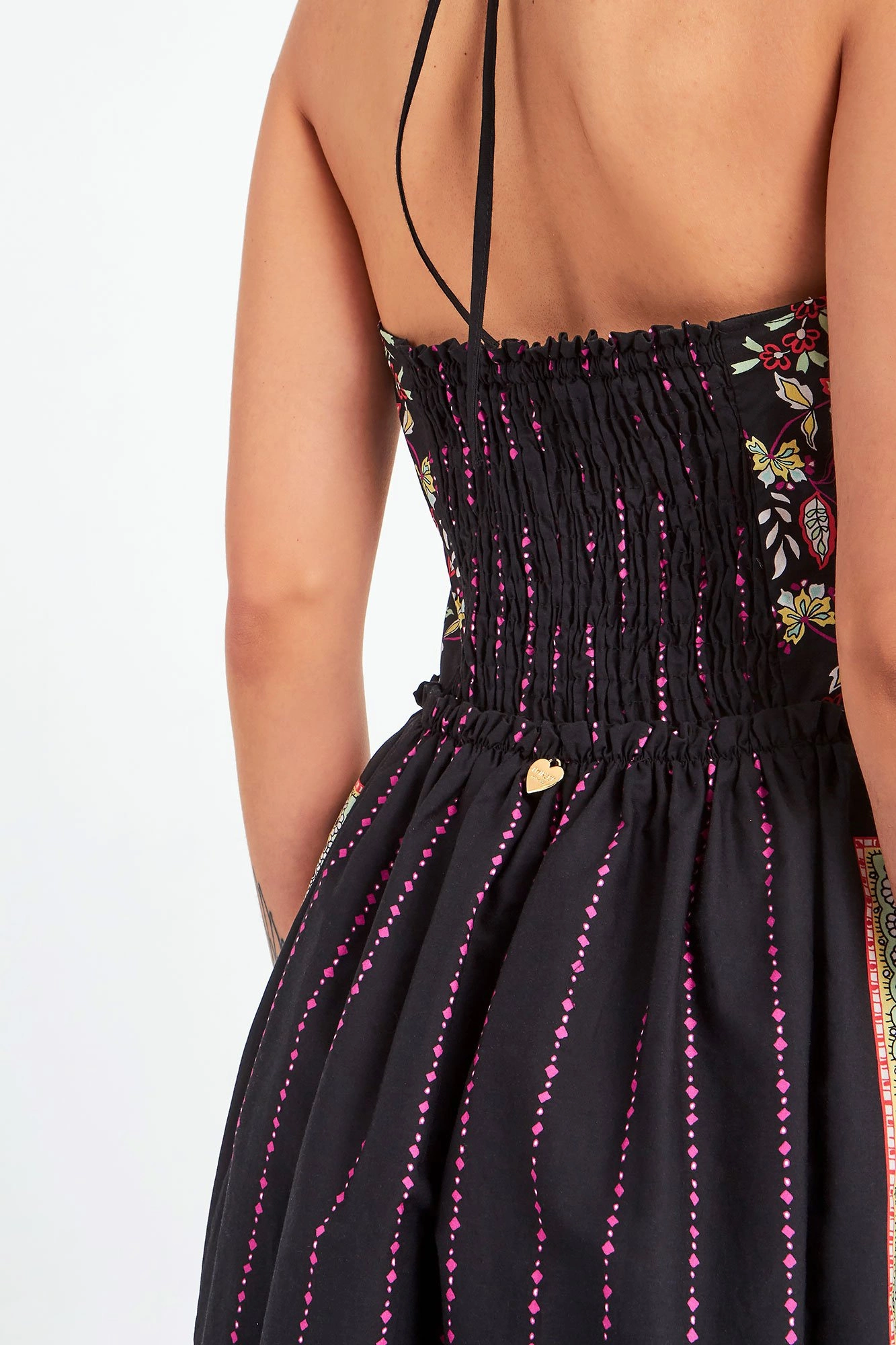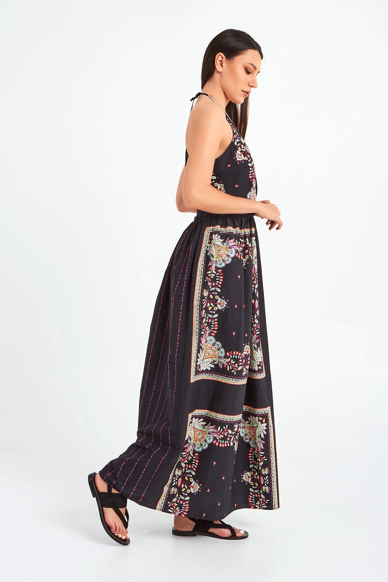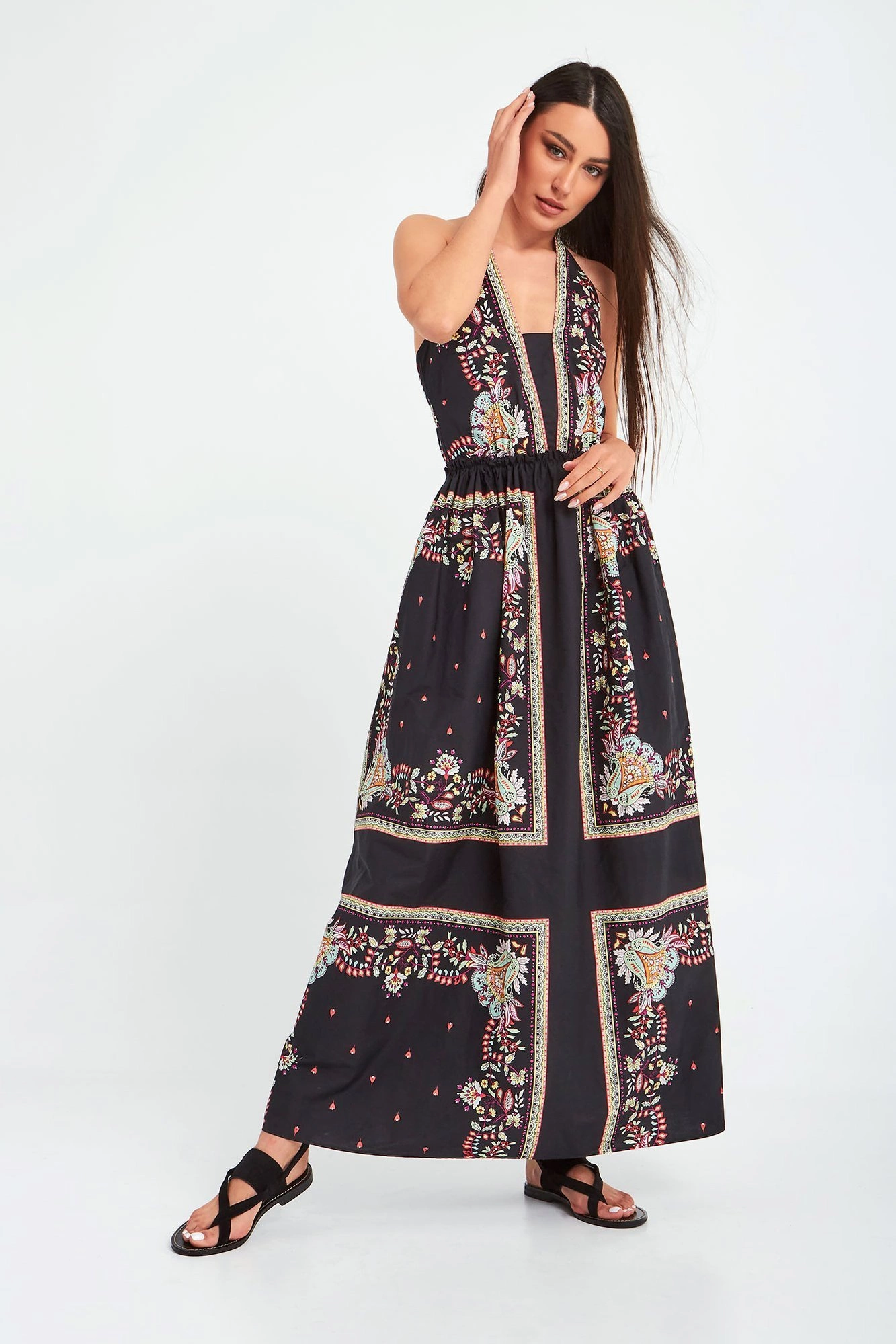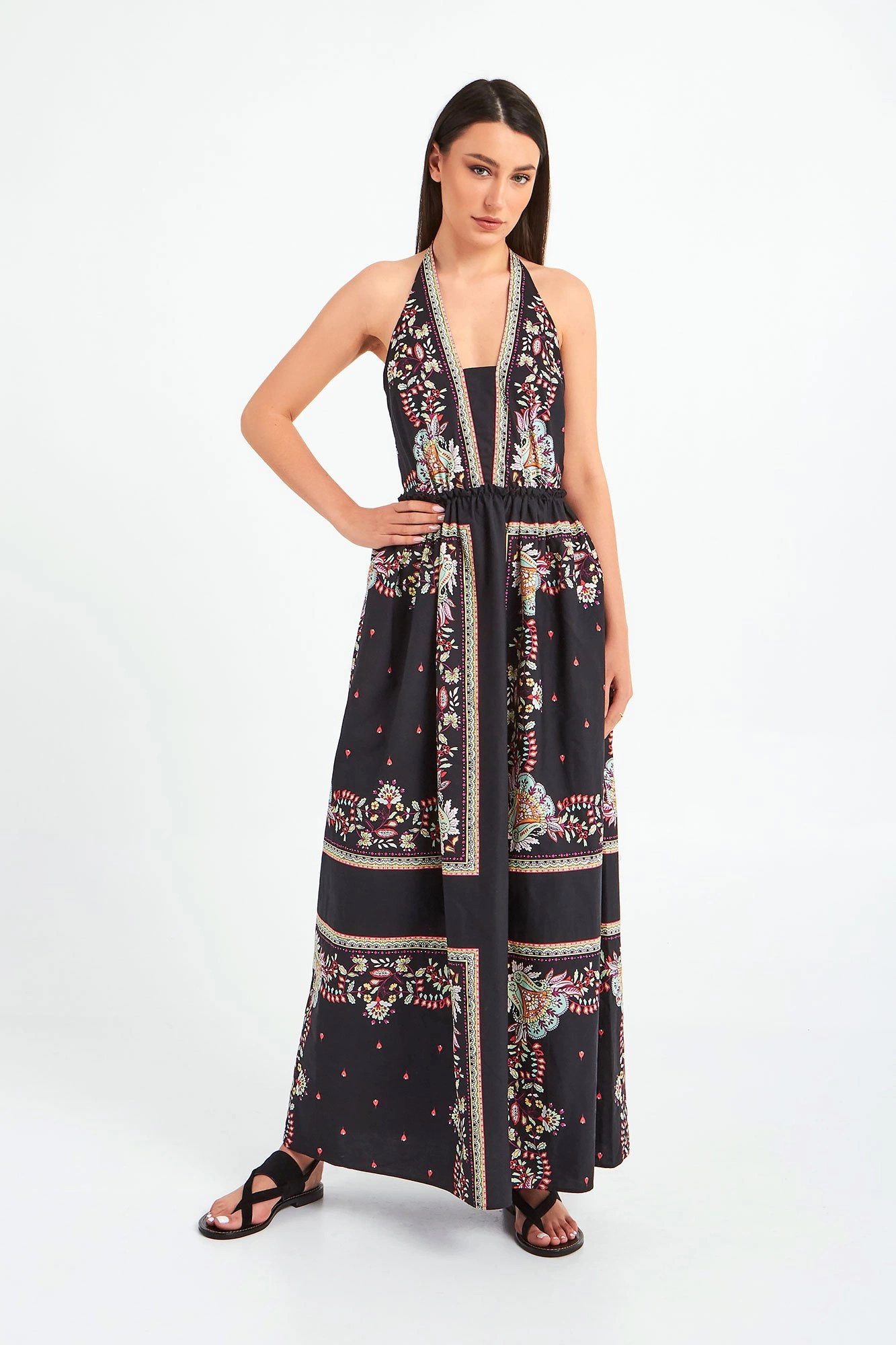 Sukienka marki Twinset. Czarna w wielokolorowy, roślinny wzór. Regularny, rozszerzany krój i długość maxi. Wiązana na szyi. Dekolt typu v-neck. Odcięcie w talii ozdobione marszczeniem. Z tyłu szeroki ściągacz i złota, sygnowana logo marki zawieszka w kształcie serca. Wykonana z czystej, lekkiej bawełny. Idealnie sprawdzi się w każdej kobiecej, wiosenno-letniej, romantycznej stylizacji.