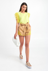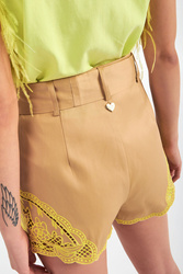Spodenki marki Twinset. Beżowe, z wyższym stanem. Zapinane za pomocą zamka, krytej haftki i guzika. Dwie boczne, niezamykane kieszenie. W talii pasek pozwalający lepiej dopasować spodenki. Boki oraz dół nogawek ozdobione haftem i koronką w limonkowym, energetyzującym kolorze. Z tyłu, przy pasku złota, sygnowana logo marki zawieszka w kształcie serca. Wykonane z przyjemnej w dotyku, czystej bawełny. Idealnie sprawdzą się w każdej wiosenno-letniej stylizacji, nadając jej charakteru oraz kobiecości.