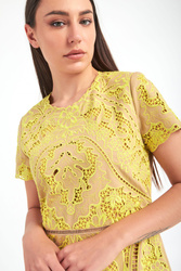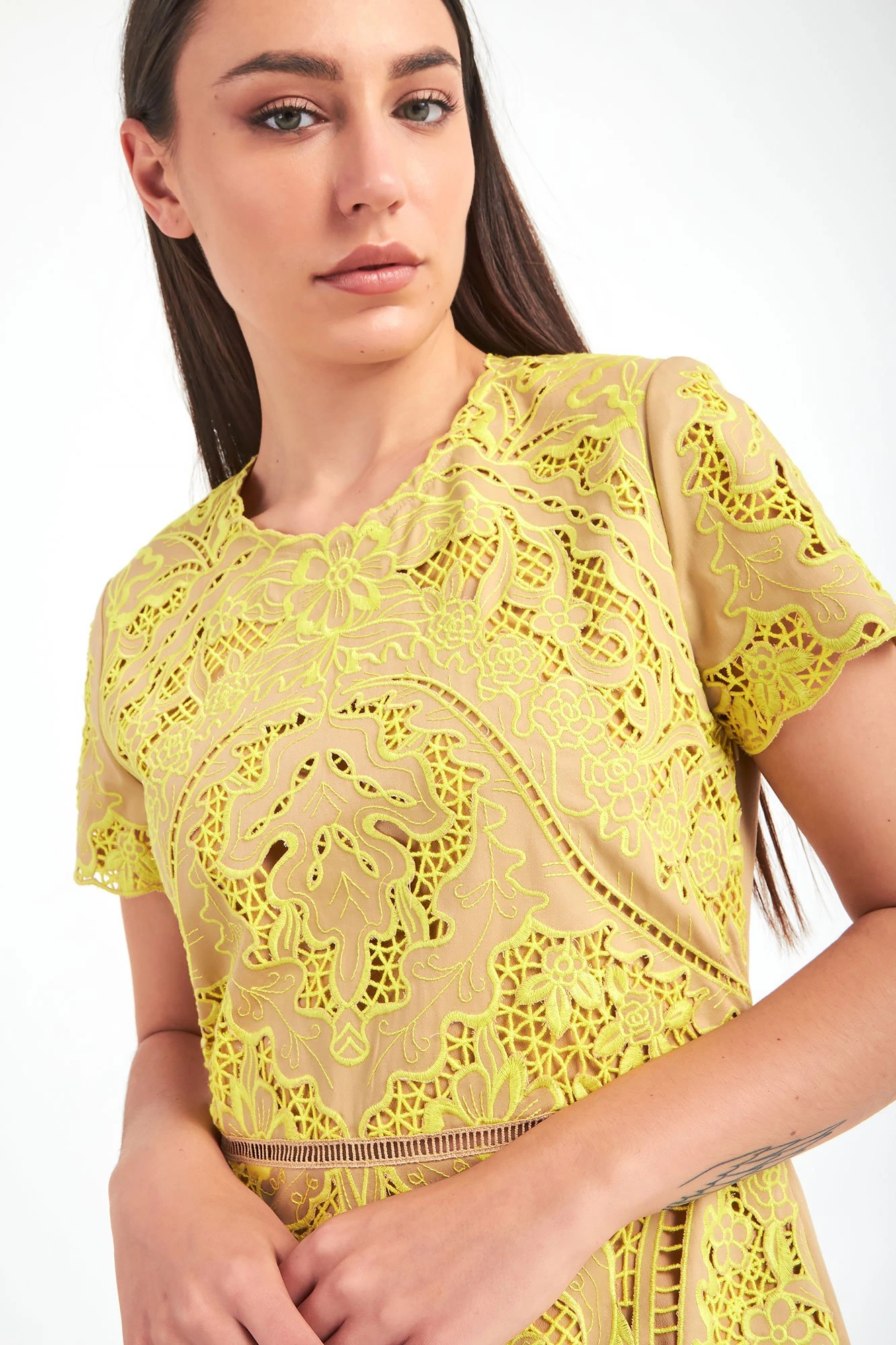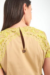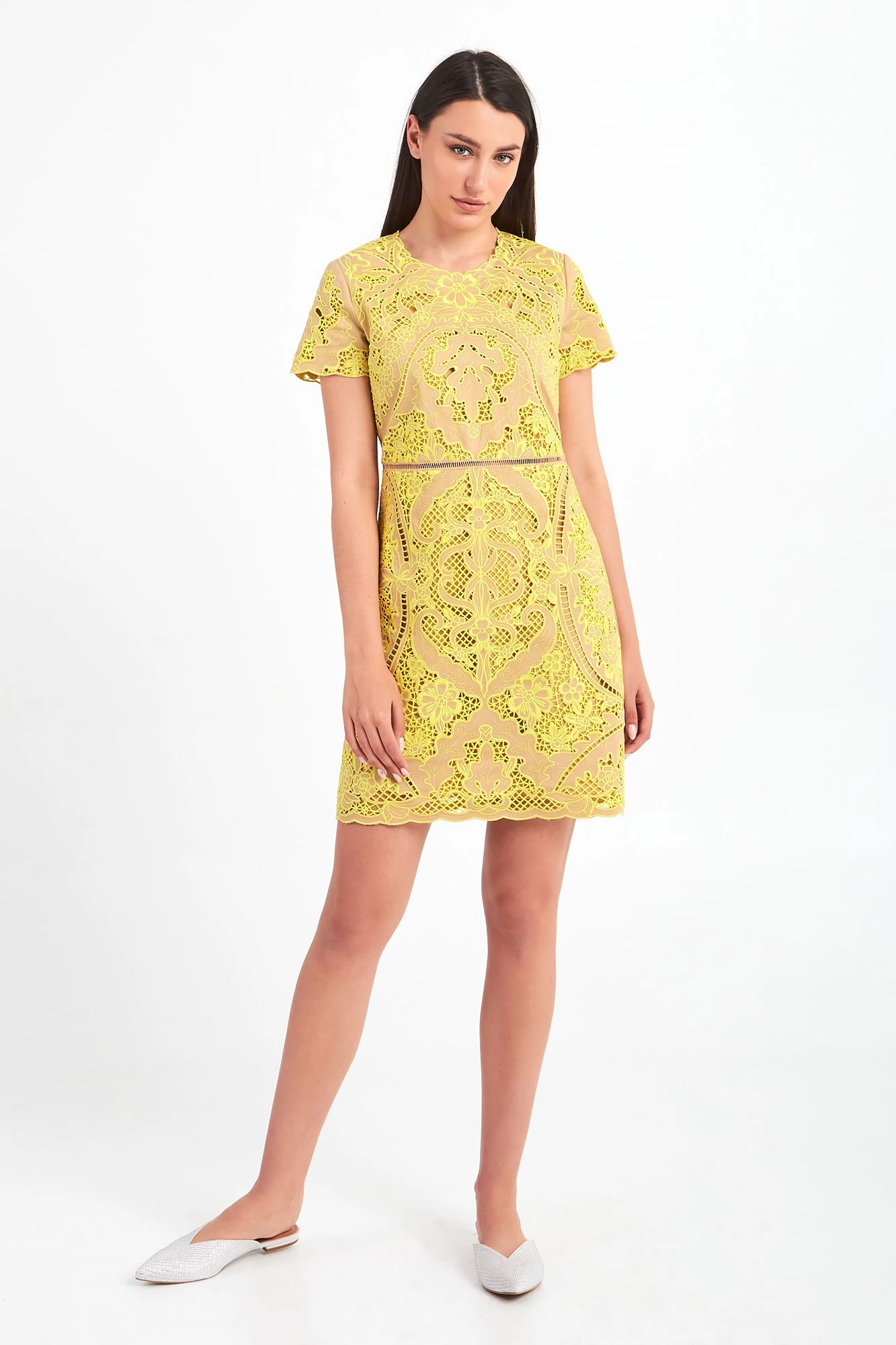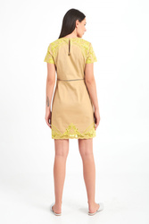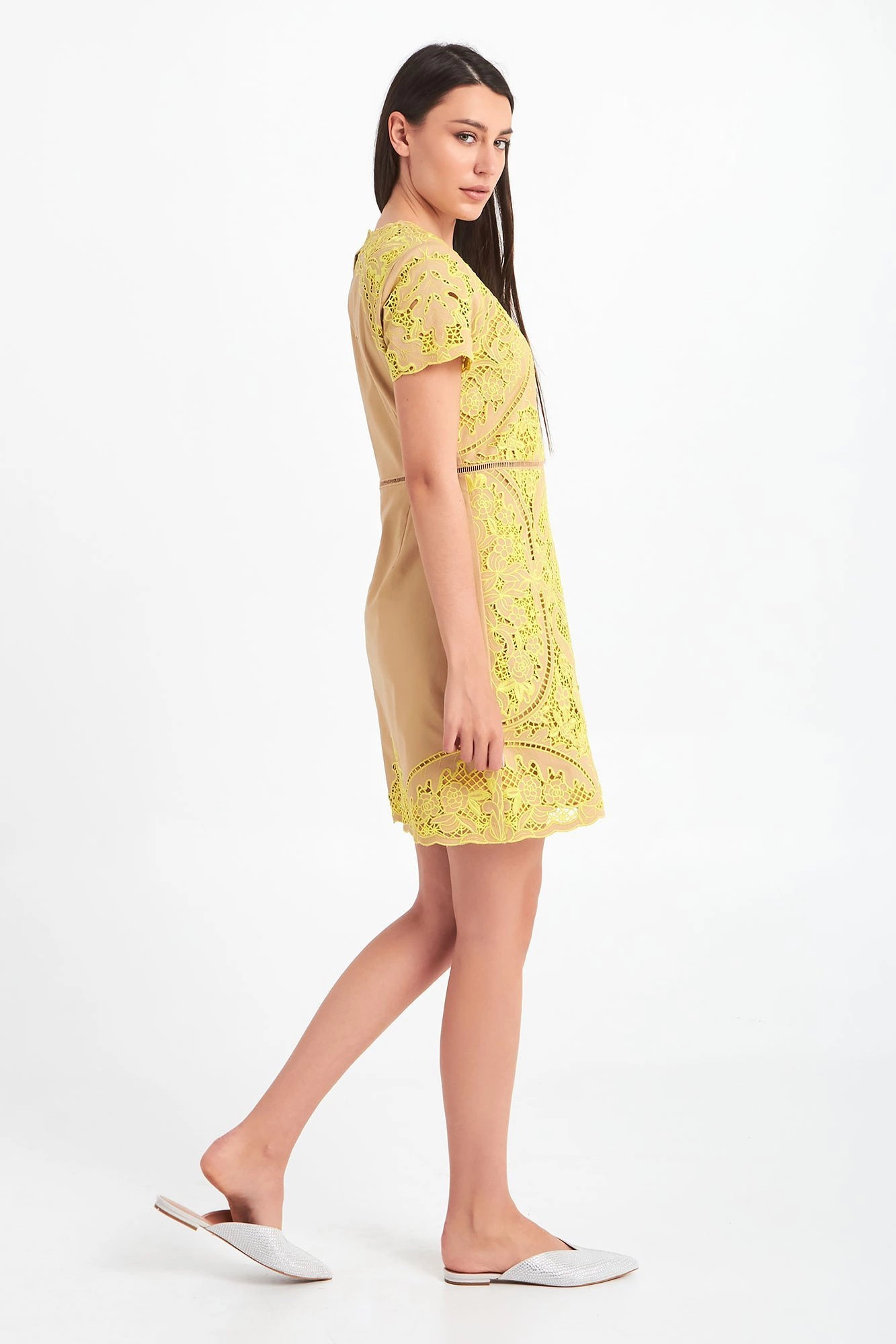 Sukienka marki Twinset. Beżowa, z przodu oraz na ramionach pokryta haftem w energetyzującym, żółtym kolorze. Dopasowany krój, długość mini. Dekolt typu o-neck i krótkie rękawy. Zapinana za pomocą bocznego, krytego zamka. Z tyłu wycięcie w kształcie łezki oraz ozdobna, złota, sygnowana logo marki zawieszka w kształcie serca. Wykonana z przyjemnej w dotyku, bawełnianej tkaniny. Idealnie sprawdzi się w każdej wiosenno-letniej, kobiecej stylizacji, nadając jej nietuzinkowości oraz charakteru.