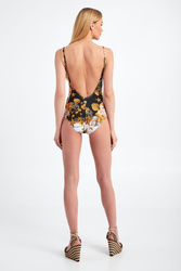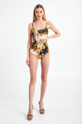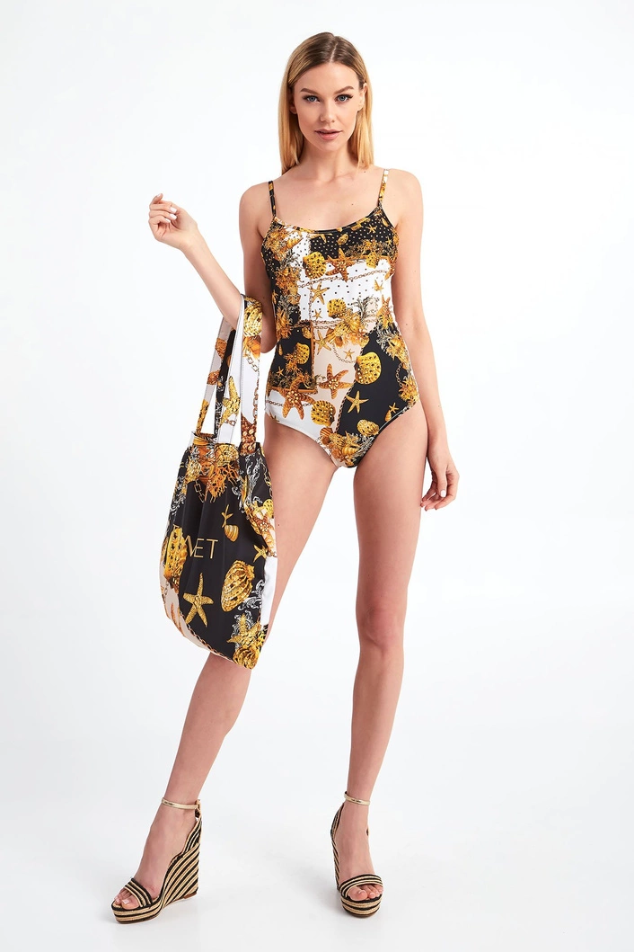 Strój kąpielowy marki Twinset U&B. Biało-beżowo-czarny kolor, na całości złoty, barokowy nadruk z motywem oceanu. Miseczki lekko usztywnione, zdobione kryształkami. Doskonale eksponują biust. Tył stroju głęboko wycięty. Ramiączka regulowane. Wykonany z wysokiej jakości tkaniny. Doskonale eksponuje piękno kobiecej sylwetki. Wyjątkowo elegancki i zmysłowy.