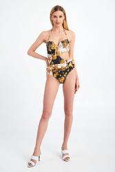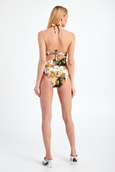 Strój kąpielowy marki Twinset U&B. Biało-czarny kolor. Na całości złoty, barokowy nadruk z motywem oceanu. Miseczki usztywniane, zdobione kryształkami. Doskonale eksponują biust. Tył stroju głęboko wycięty. Wiązany na szyi i z tyłu, z odpinanymi ramiączkami. Z boku detal w postaci efektownego wycięcia i wiązania. Wykonany z wysokiej jakości tkaniny. Doskonale eksponuje piękno kobiecej sylwetki. Wyjątkowo elegancki i zmysłowy.