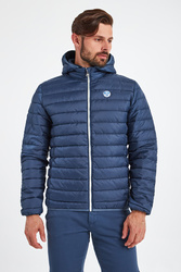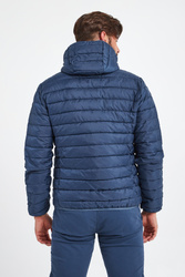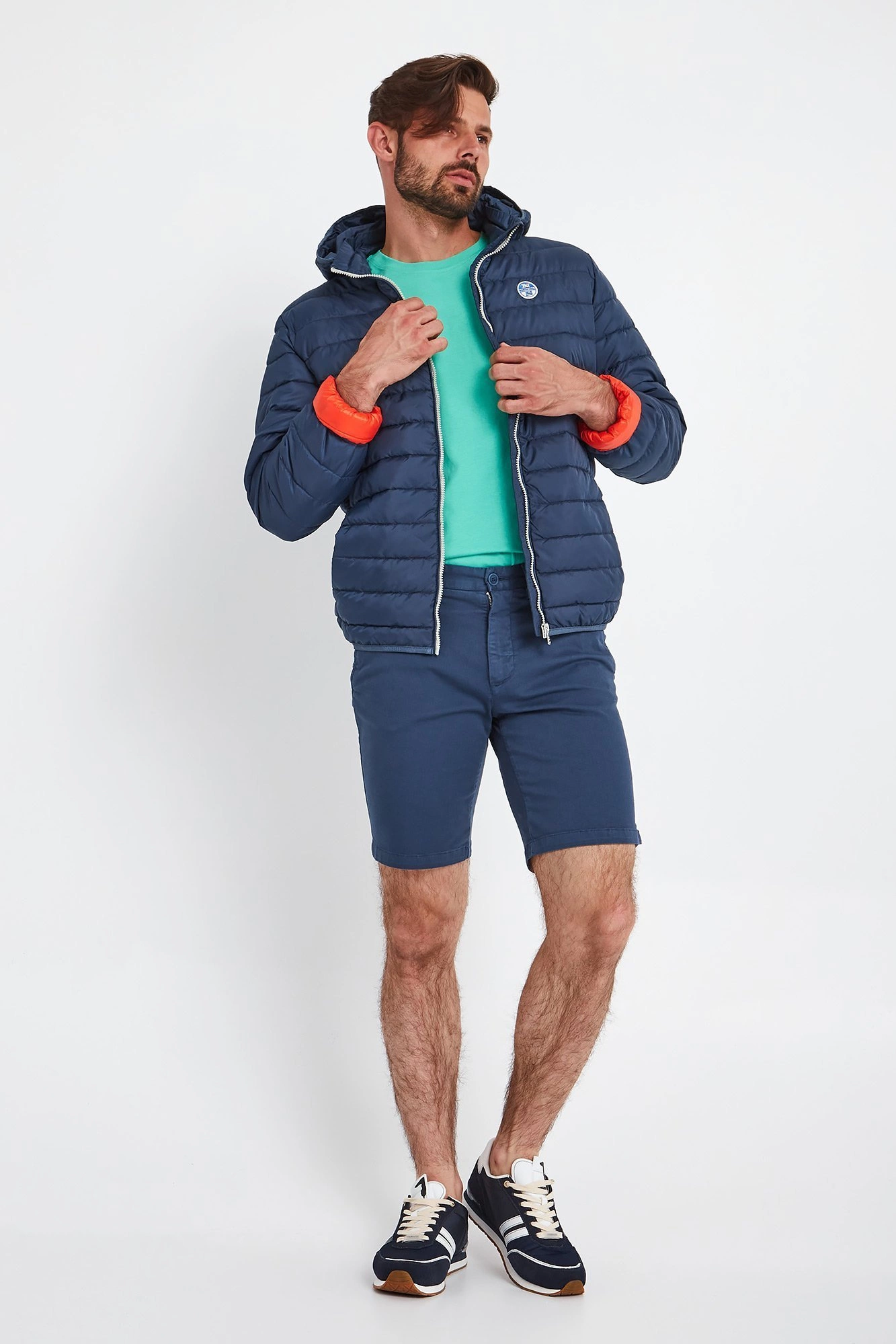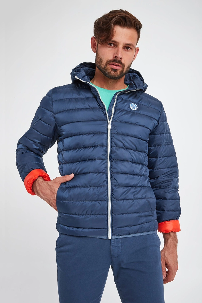 Pikowana kurtka z kapturem marki North Sails w granatowym kolorze, o regularnym kroju. Wodoodporna. Wykonana z materiałów pochodzących z recyklingu. Kołnierz ze stójką. Zapinana na zamek błyskawiczny w kolorze kurtki z białym obszyciem. Wyściółka w kontrastowym pomarańczowym kolorze. Z przodu dwie zapinane na zamek kieszenie. Na piersi naszywka z nazwą marki. Uniwersalna propozycja od marki o żeglarskiej i marynistycznej tradycji, stworzona w duchu zrównoważonego rozwoju i szacunku do planety.
