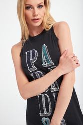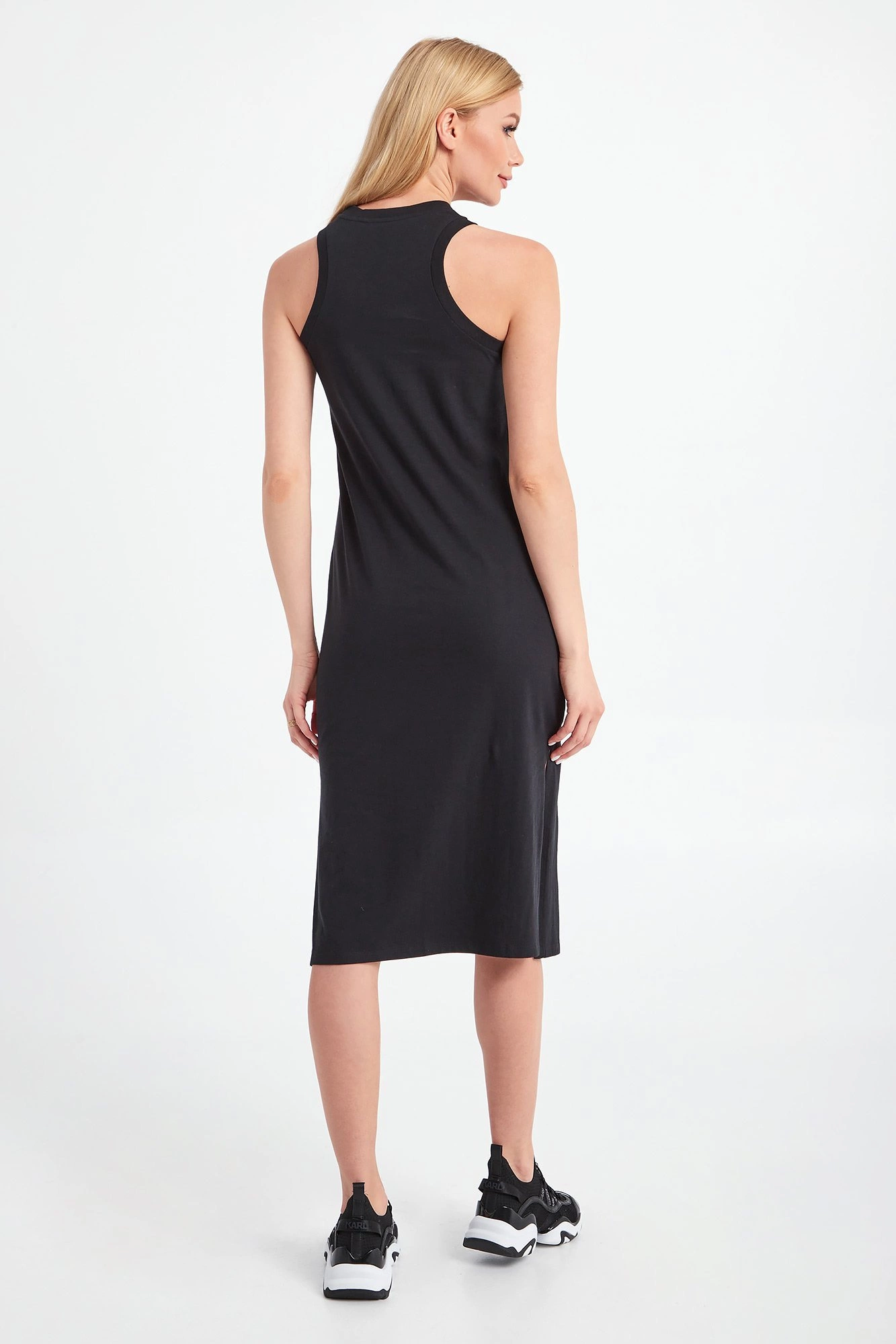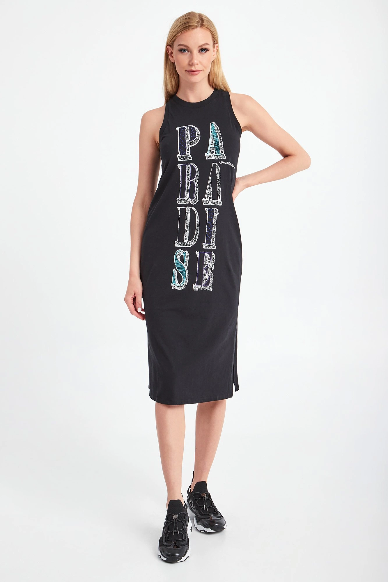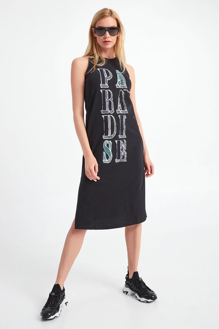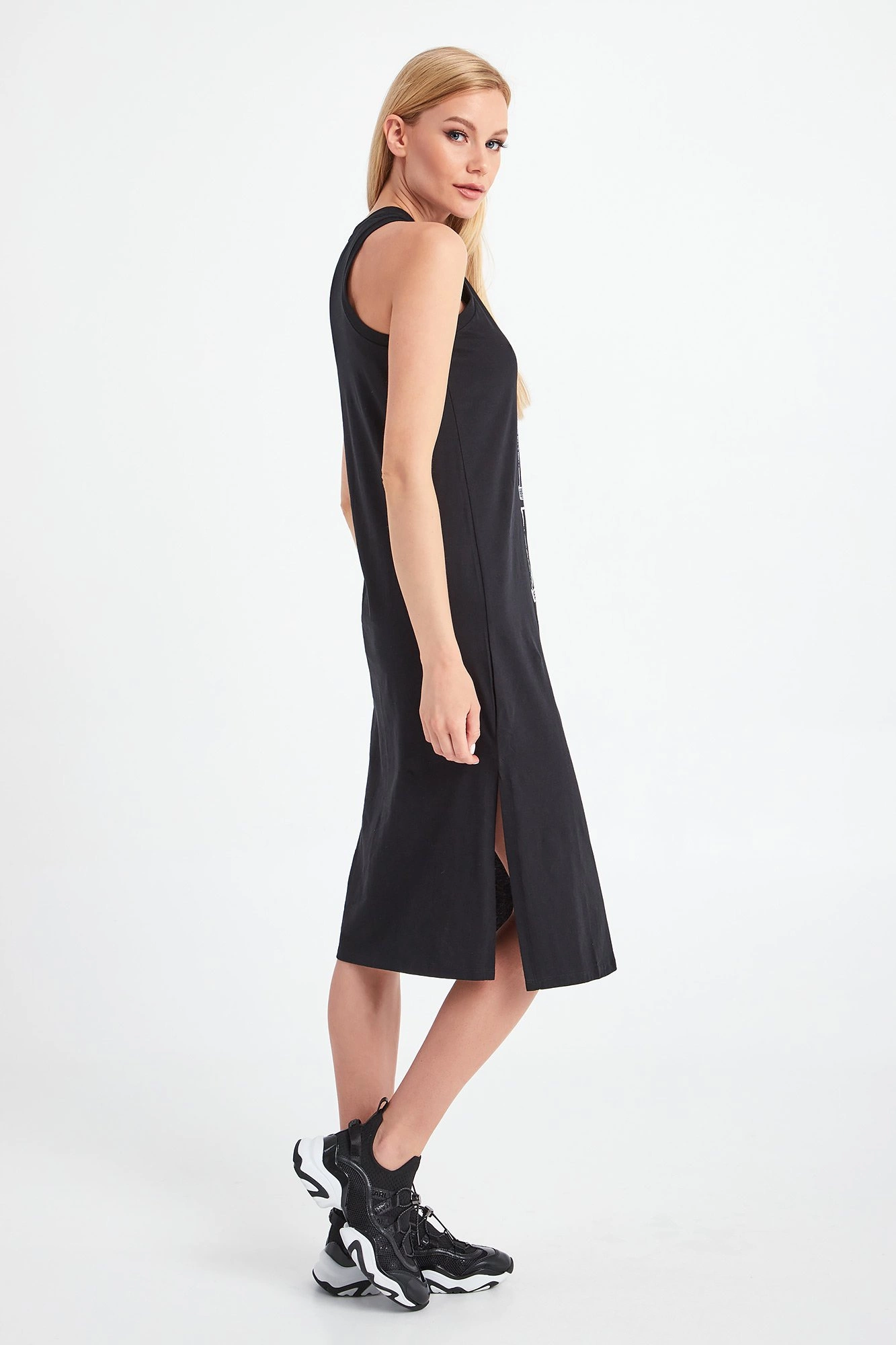 Sukienka marki Armani Exchange w czarnym kolorze. Luźny krój, długość midi. Z przodu duży nadruk. Dekolt typu o-neck zakończony ściągaczem. Bez rękawów. Po bokach rozcięcia. Wykonana z przyjemnej w dotyku, gładkiej organicznej bawełny. Idealnie wpasuje się w letni klimat.