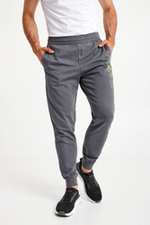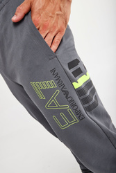 Spodnie dresowe marki EA7 Emporio Armani w grafitowym kolorze. W pasie ściągacz regulowany po wewnętrznej stronie spodni za pomocą troczków. Na lewej nogawce kontrastowe logo marki. U dołu nogawek ściągacze. Dwie boczne, niezapinane kieszenie. Wykonane z czystej bawełny. Komfortowe i stylowe.