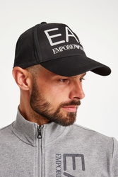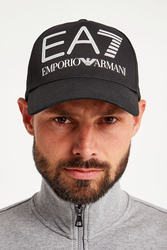 Czarna czapka z daszkiem marki EA7 Emporio Armani. Z przodu duże, widoczne, białe, gumowe logo marki. Regulowana za pomocą metalowego, sygnowanego zapięcia. Na daszku ozdobne przeszycia. Wykonana z przewiewnej tkaniny. Wnętrze z czystej bawełny. Komfortowa i stylowa.