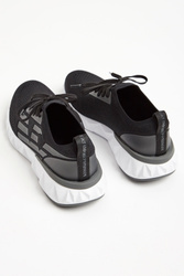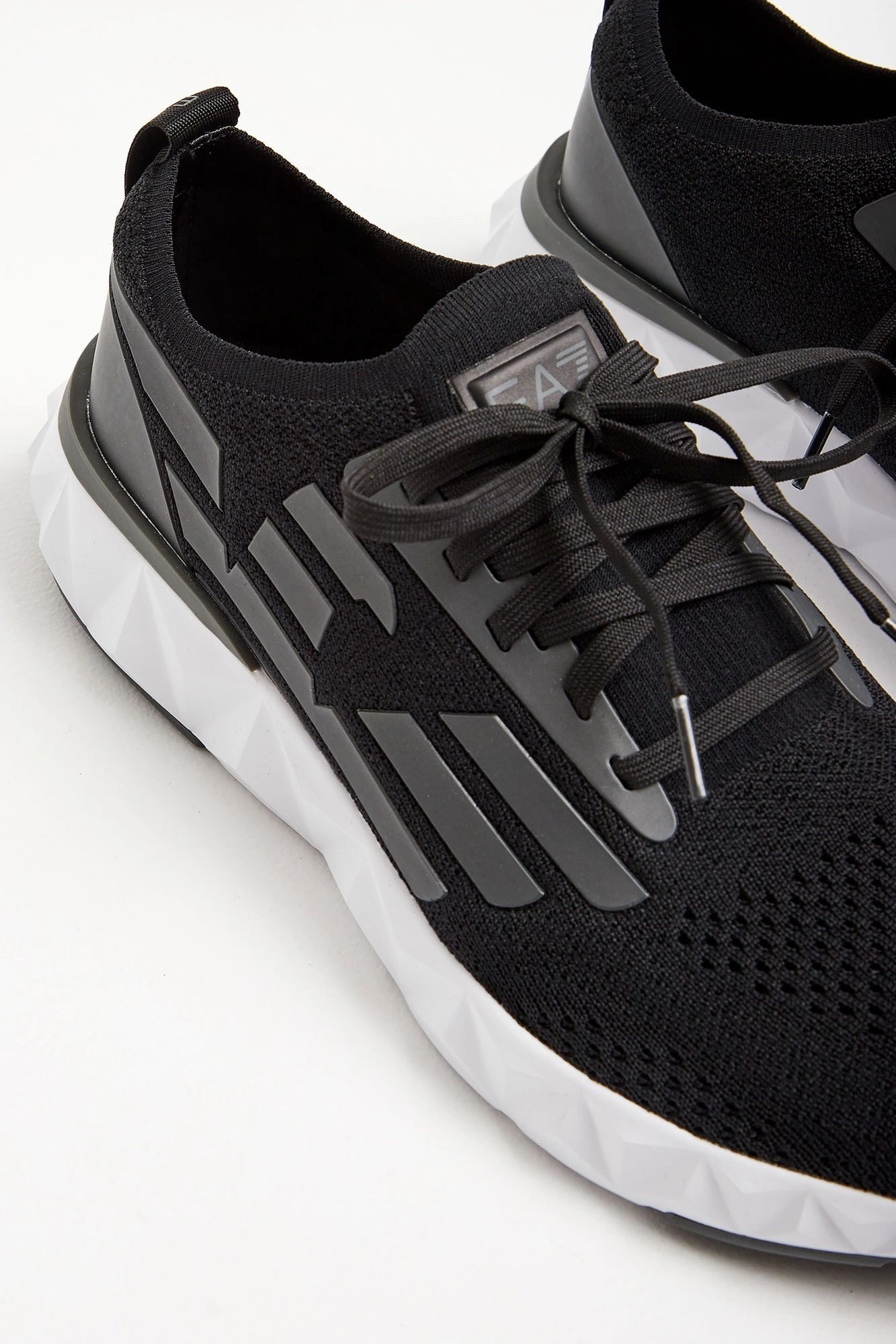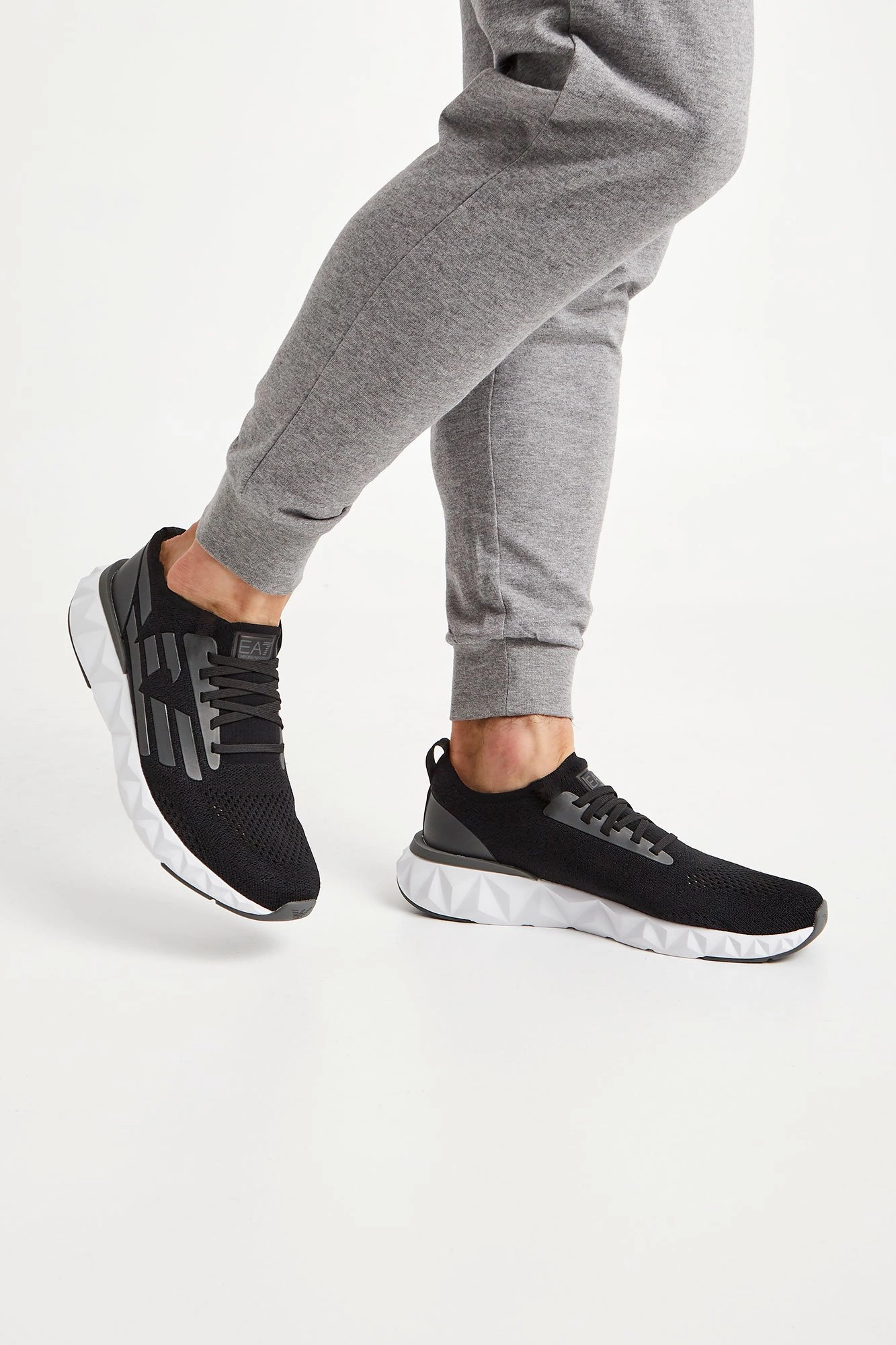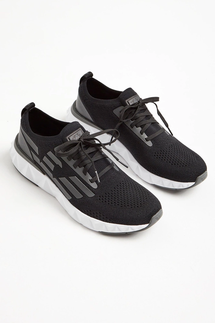 Czarne sneakersy marki EA7 Emporio Armani. Na języku gumowa aplikacja z monogramem marki. Wiązane za pomocą czarnych sznurówek. Po bokach gumowane wstawki. Całości dopełnia wysoka, biała i innowacyjna podeszwa w tłoczone geometryczne wzory, która podnosi komfort noszenia. Przewiewne i wygodne.