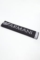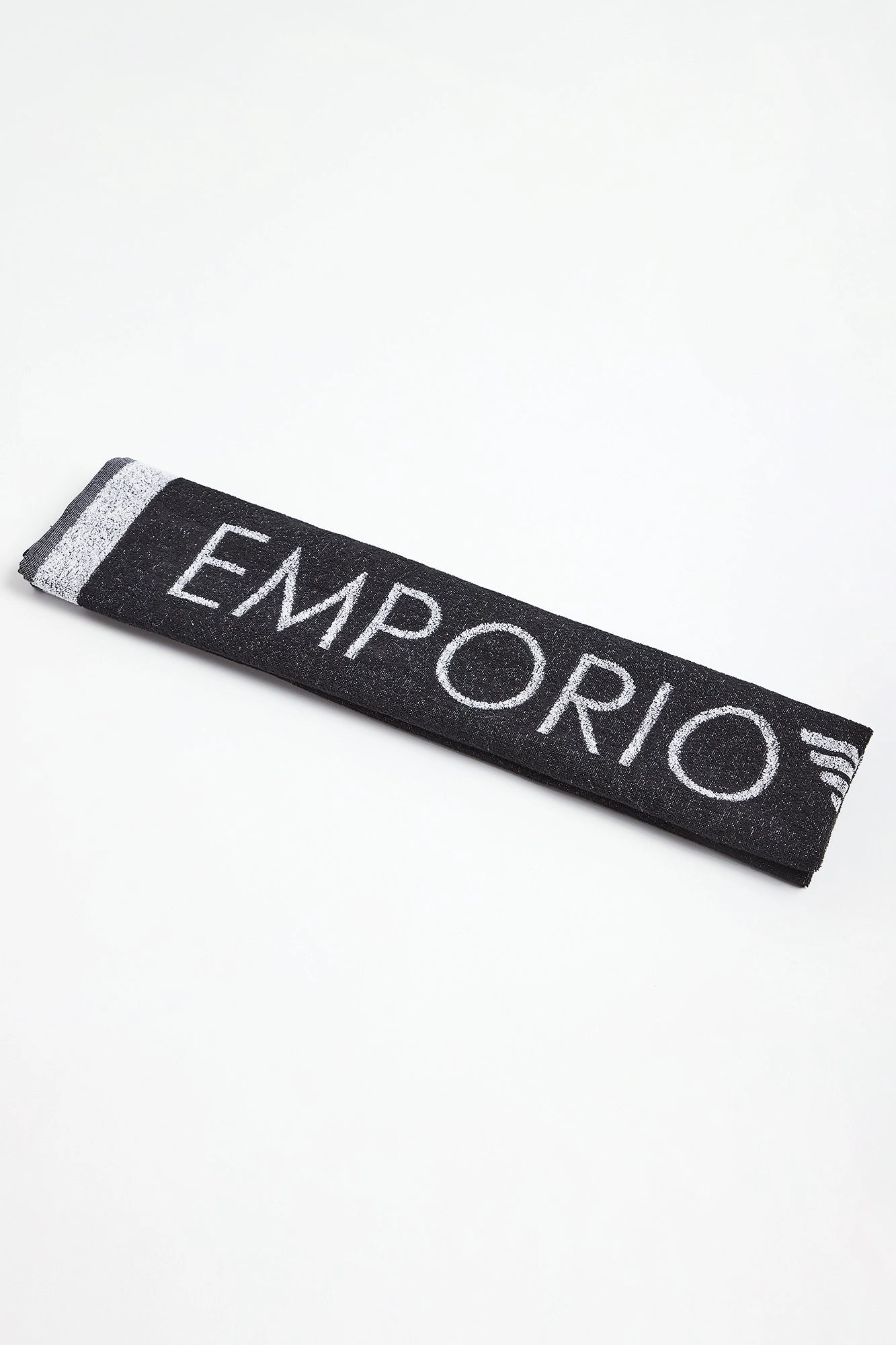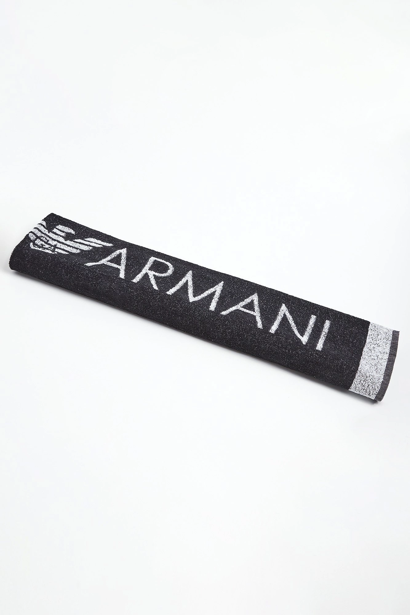Ręcznik marki Emporio Armani Swimwear. Biało-czarny z dużym napisem w postaci nazwy marki oraz logo. Wykonany z czystej, przyjemnej w dotyku, miękkiej bawełny.