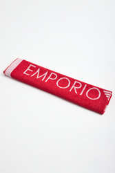 Ręcznik marki Emporio Armani Swimwear. Biało-czerwony z dużym napisem w postaci nazwy marki oraz logo. Wykonany z czystej, przyjemnej w dotyku, miękkiej bawełny.