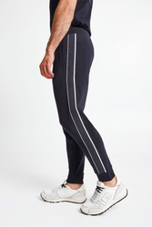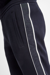 Granatowe spodnie dresowe marki Emporio Armani. Luźny fason ze ściągaczem w pasie regulowanym na wewnętrzne troczki w kontrastowym kolorze. Nogawki zakończone ściągaczem. Po bokach lampas w kolorze spodni z tłoczoną nazwą marki i kontrastowym wykończeniem. Całość wykonana z miękkiej, elastycznej bawełny. Model z trzema kieszeniami. Propozycja idealna do casualowych i sportowych stylizacji.