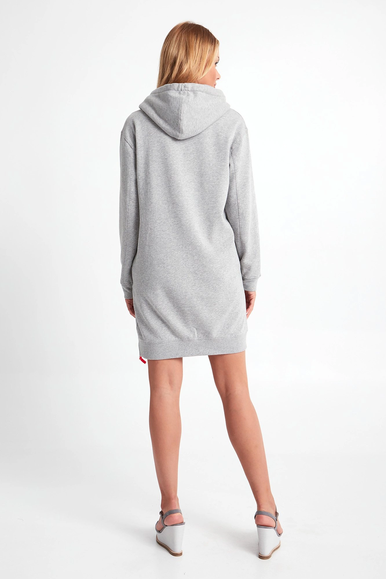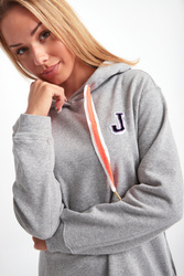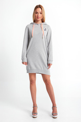 Sukienka marki Joop! w kolorze szarego melanżu. Luźny fason. Z kapturem regulowanym na szerokie biało-neonowe troczki. Z przodu haft i dwie niezapinane kieszenie. Z lewej strony złoty, ozdobny zamek błyskawiczny. Długi rękaw i dół wykończone elastycznym ściągaczem. Na linii karku niewielka aplikacja z tłoczonym logo i nazwą marki. Wykonana z ekologicznej bawełny. Sukienka nada sportowego charakteru stylizacji.