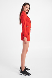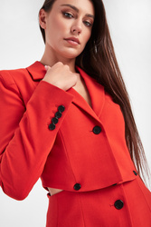 Marynarka marki Karl Lagerfeld w odcieniu makowej czerwieni. Model typu 3 w 1. Możliwość noszenia jako długa i krótka marynarka, plus jako spódnica mini. Zapinana na czarne, sygnowane guziki. W dolnej części po bokach niezapinane kieszenie. Z kołnierzem, klapami i dekoltem typu v-neck. Długi rękawy ozdobione czterema małymi guzikami. Wykonana z wysokiej jakości mieszanki materiałów w tym wełny. Niezwykle designerska i funkcjonalna propozycja, która swym krojem i kolorem nada nietuzinkowego charakteru stylizacji.
