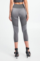 Szare legginsy marki Wolford. Długość 3/4. Na całości ozdobne wzory. W pasie szeroki ściągacz przytrzymujący legginsy, żeby nie spadały. Na prawej nogawce, u góry mały monogram marki. Elastyczne i komfortowe.