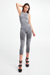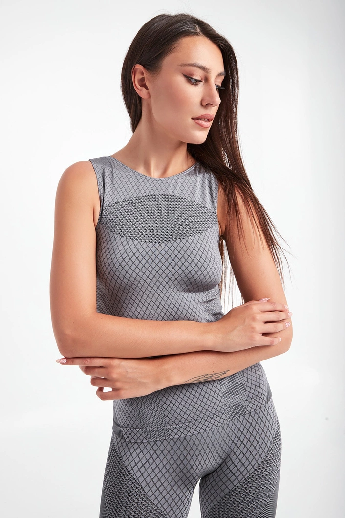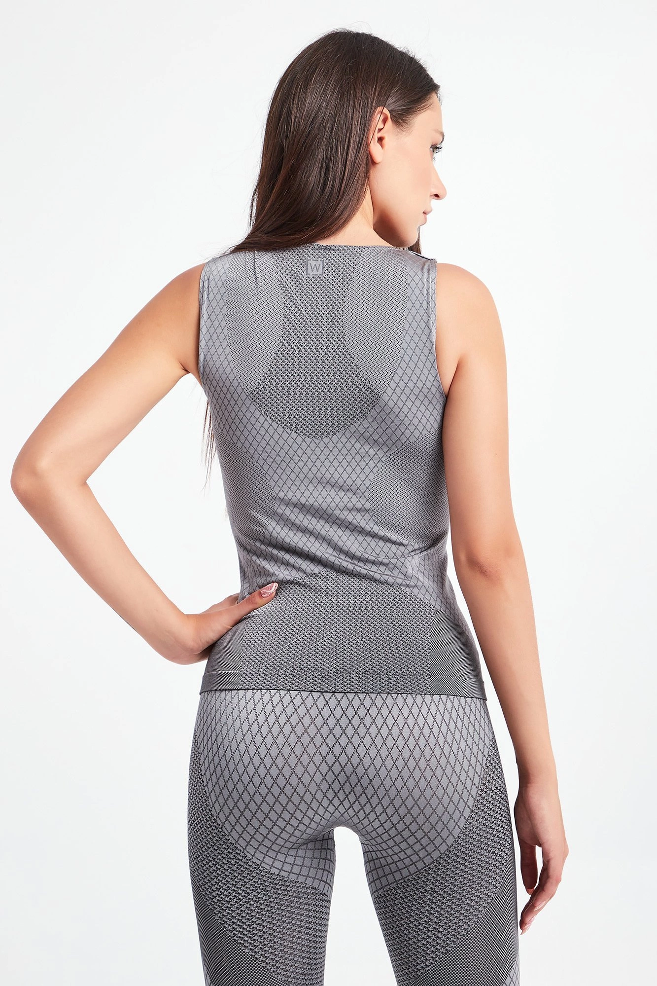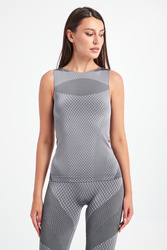 Szary top marki Wolford. Dopasowany krój slim fit. Bez rękawów, dekolt typu o-neck. Na całości ozdobne wzory. Z tyłu, na linii karku monogram marki. Wykonany z elastycznej, przylegającej tkaniny. Komfortowy i lekki.