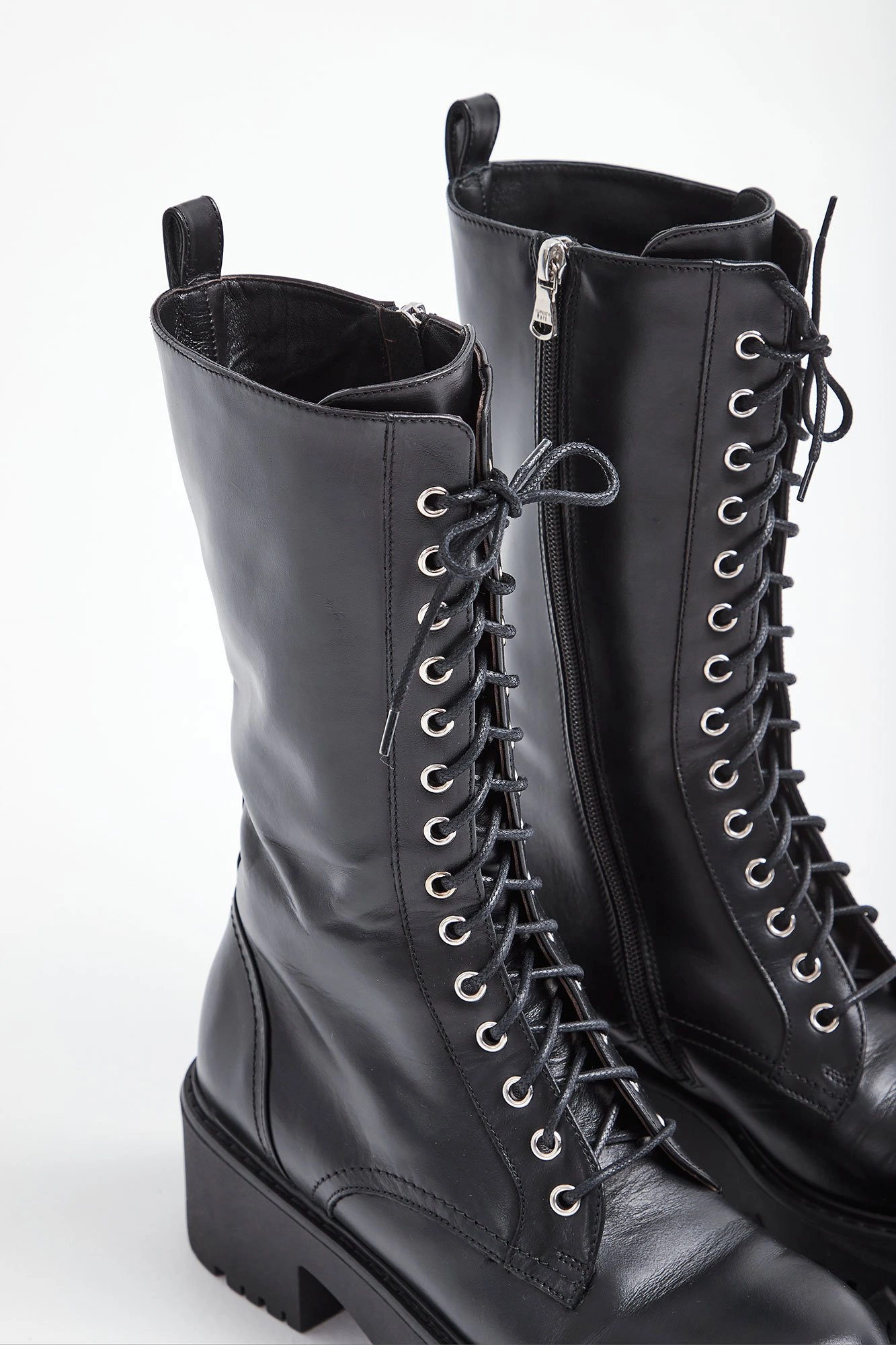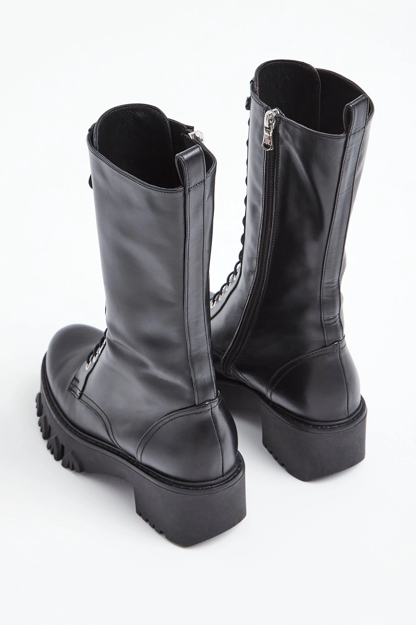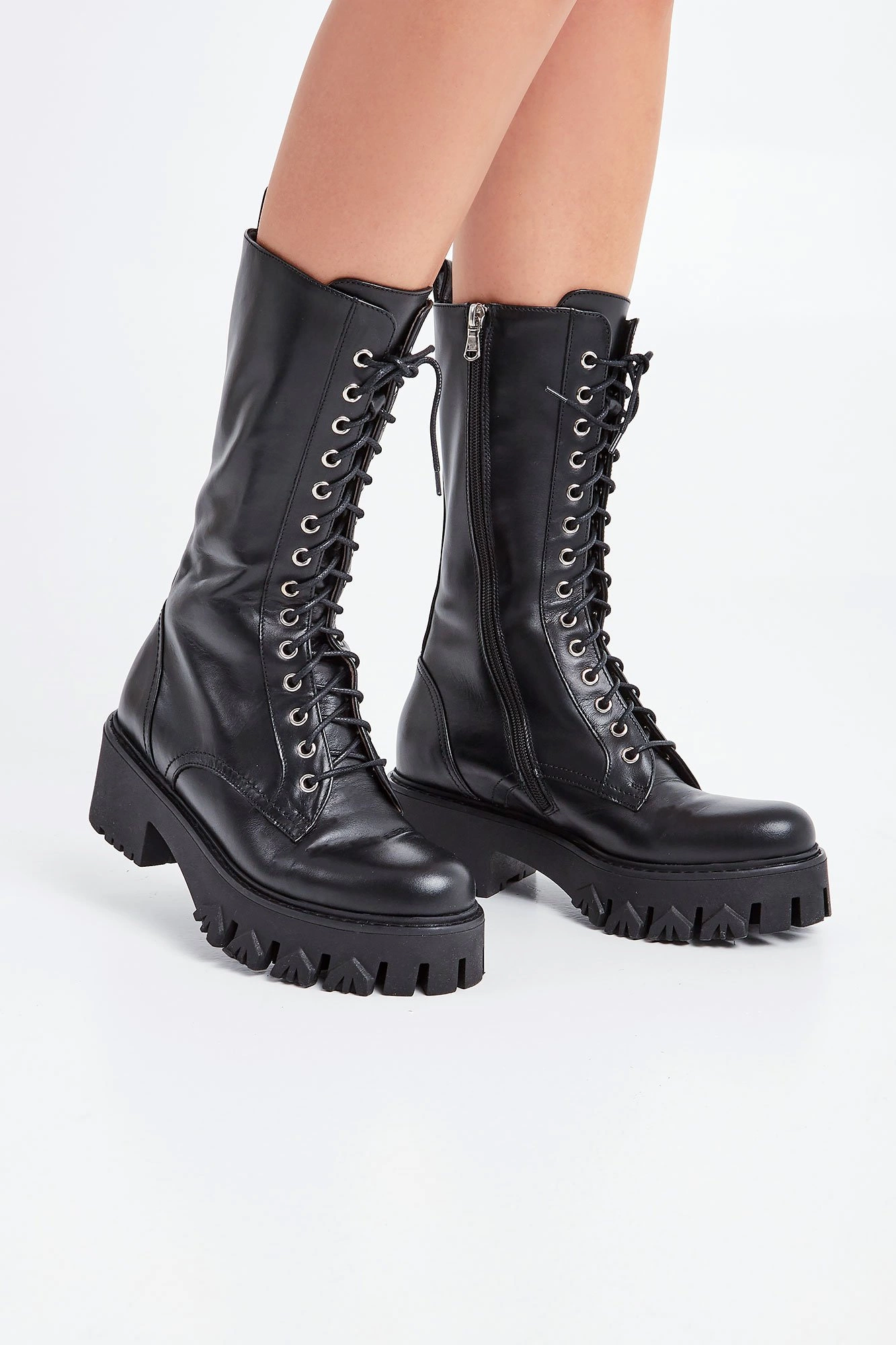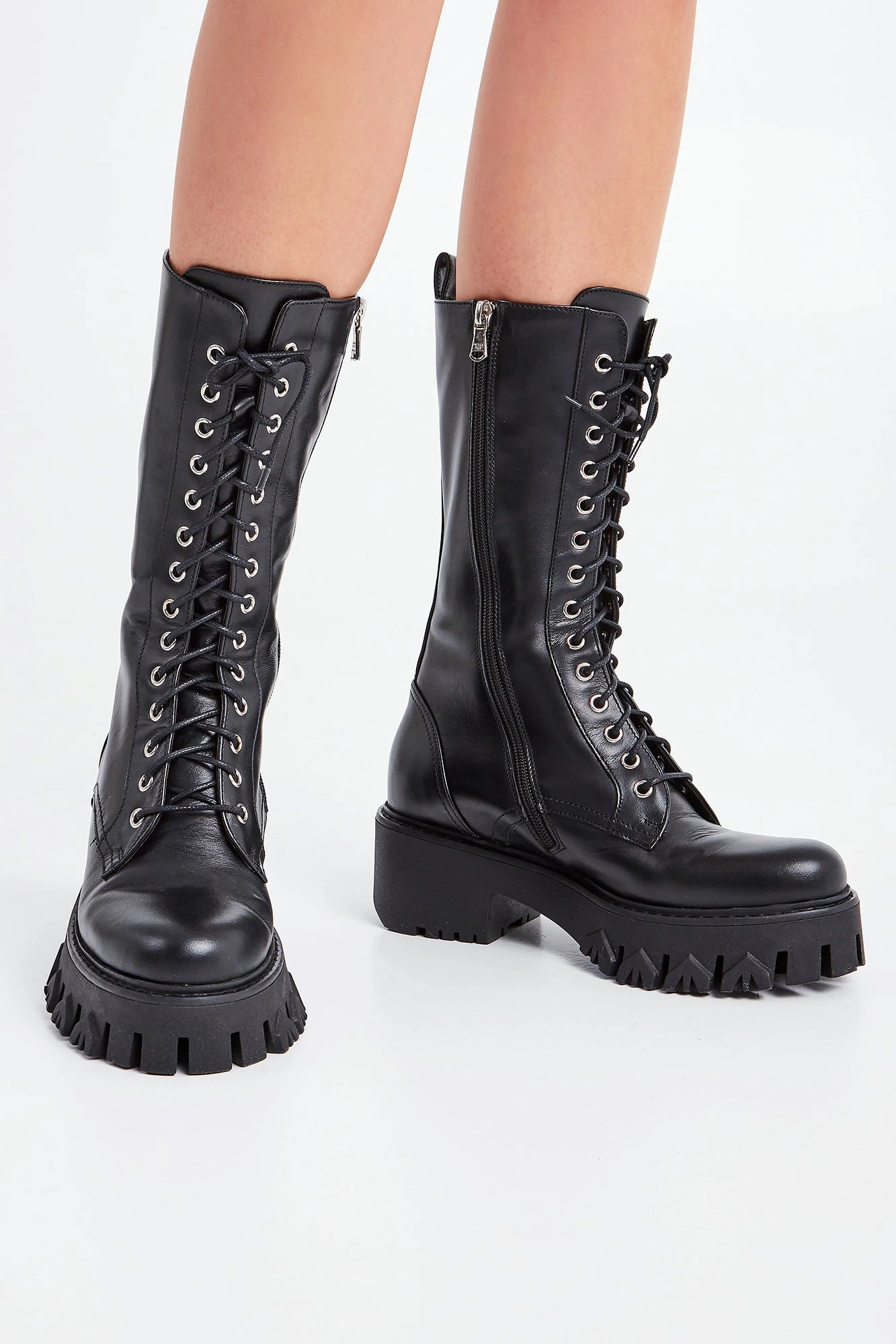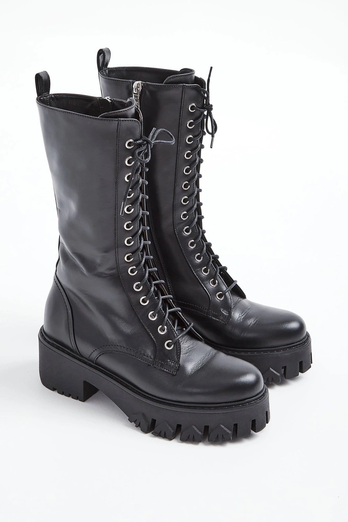 Trapery marki Patrizia Pepe w czarnym kolorze. Długa cholewka. Wiązane na sznurówki. Po bokach zapinane na zamek błyskawiczny. Wykonane z gładkiej skóry naturalnej. Lekkie, wygodne i ponadczasowe. Nadadzą rockowego charakteru każdej stylizacji. Fantazyjna podeszwa z tłoczeniem w postaci ważki. Wysokość podeszwy: 6 cm.