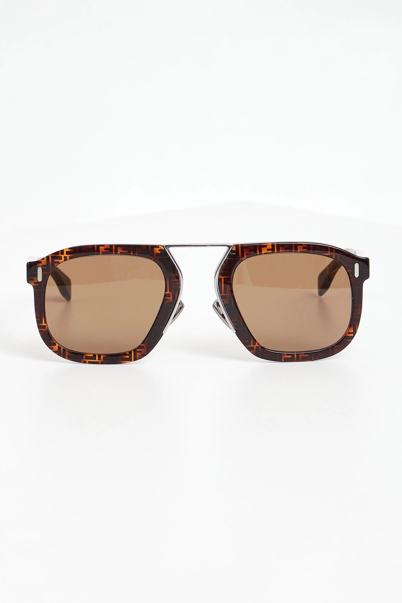 Okulary przeciwsłoneczne marki Fendi w brązowym kolorze. Na całości charakterystyczny dla marki wzór. Mostek w srebrnym kolorze, z tłoczoną nazwą marki. Zauszniki profilowane z tłoczoną nazwą marki w srebrnym kolorze. Brązowe szkła z filtrem UV kat.2.