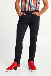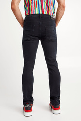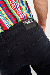 Klasyczne, granatowe jeansy marki Versace Jeans Couture. Fason slim fit. Zapinane za pomocą zamka i sygnowanego guzika. Model z pięcioma kieszeniami. Na przedniej czarna naszywka z logo. Z tyłu na pasie wstawka z białym napisem w postaci nazwy marki. W pasie szlufki. Wykonane z bawełny z domieszką elastanu.