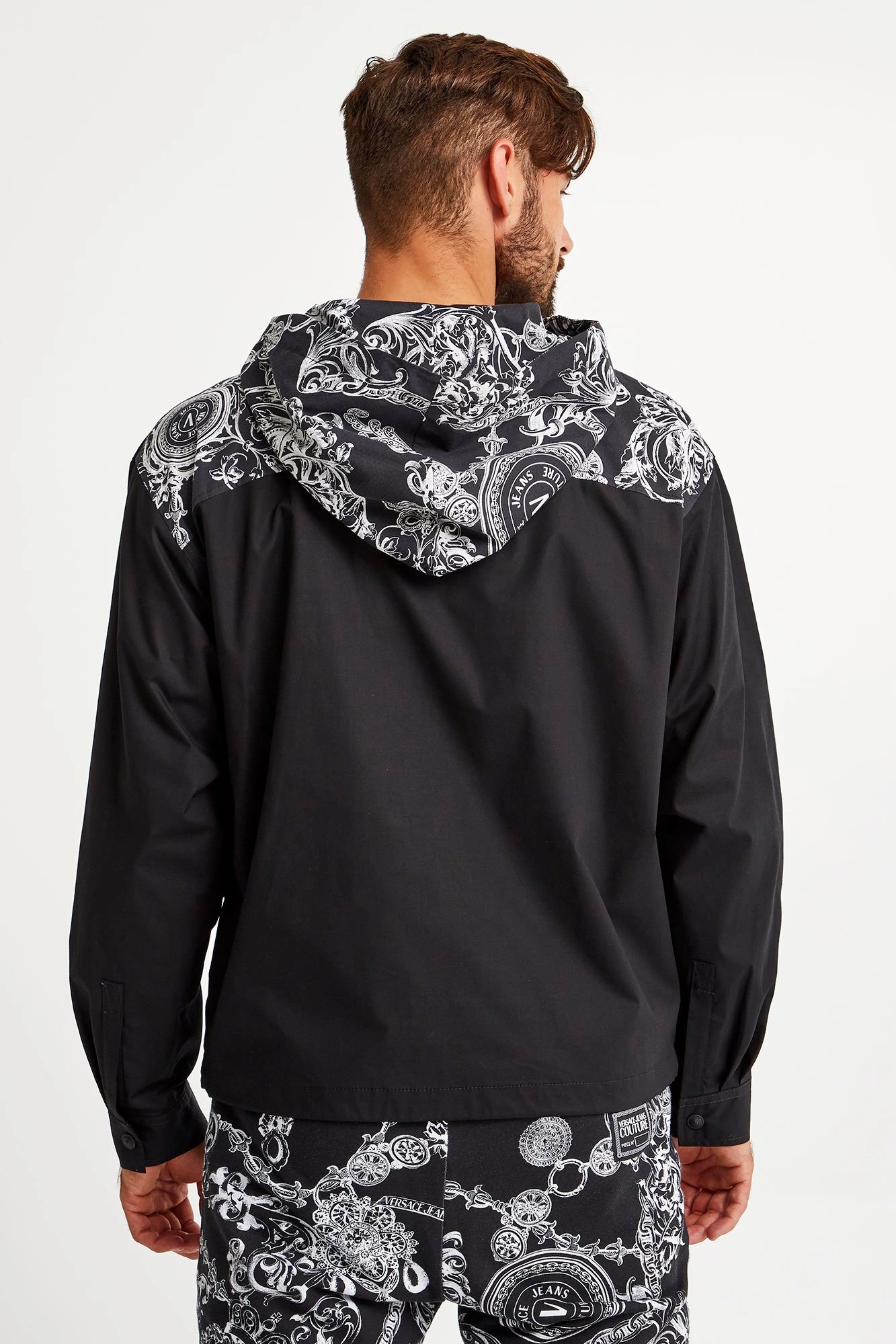 Czarna kurtka z kapturem Versace Jeans Couture. Na przedniej kieszeni i kapturze białe, barokowe wzory. Krój regular fit. Zapinana za pomocą sygnowanych nap. Kaptur regulowany za pomocą czarnych troczków. Rękawy z mankietami. U dołu ściągacz. Wykonana z bawełny z domieszką elastanu.