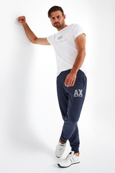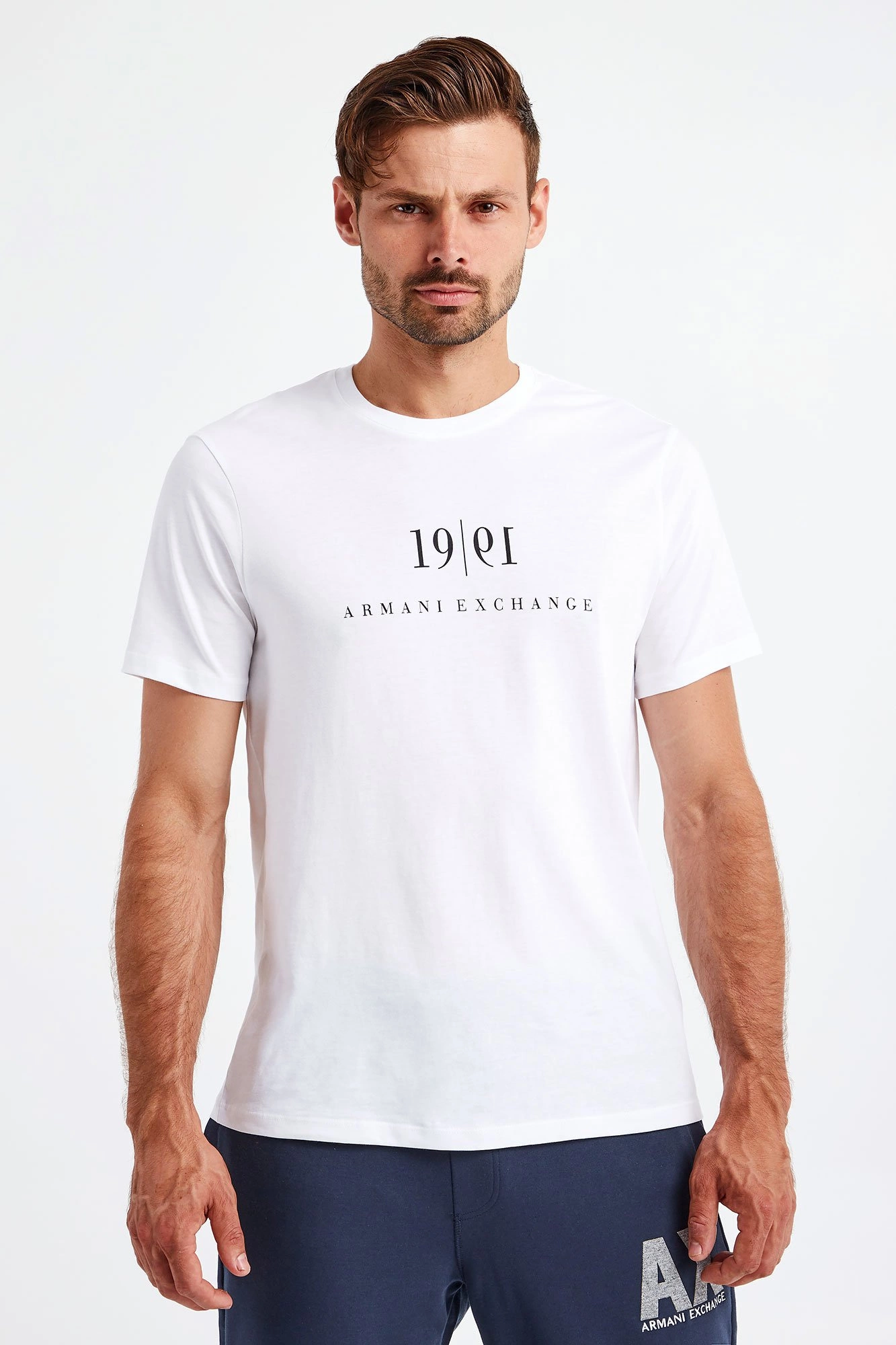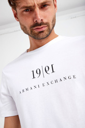 Biały t-shirt marki Armani Exchange. Krój slim fit. Z przodu czarne napisy w postaci nazwy marki oraz daty jej powstania. Dekolt typu o-neck zakończony ściągaczem. Krótkie rękawy oraz dół wykończone lamówką. Wykonany z czystej bawełny organicznej.