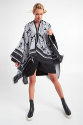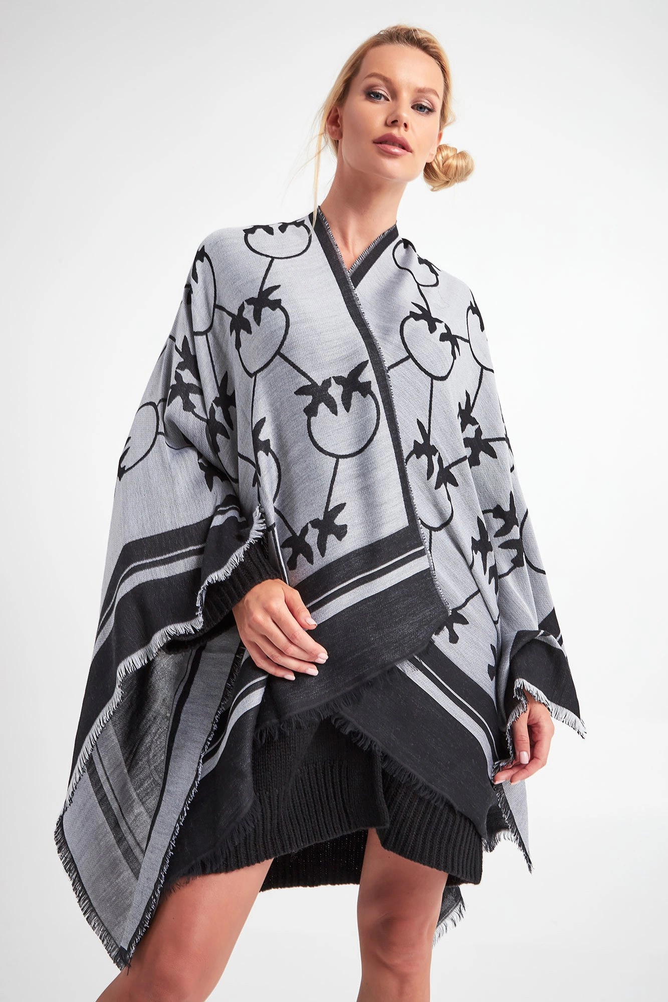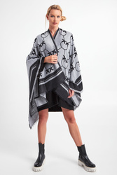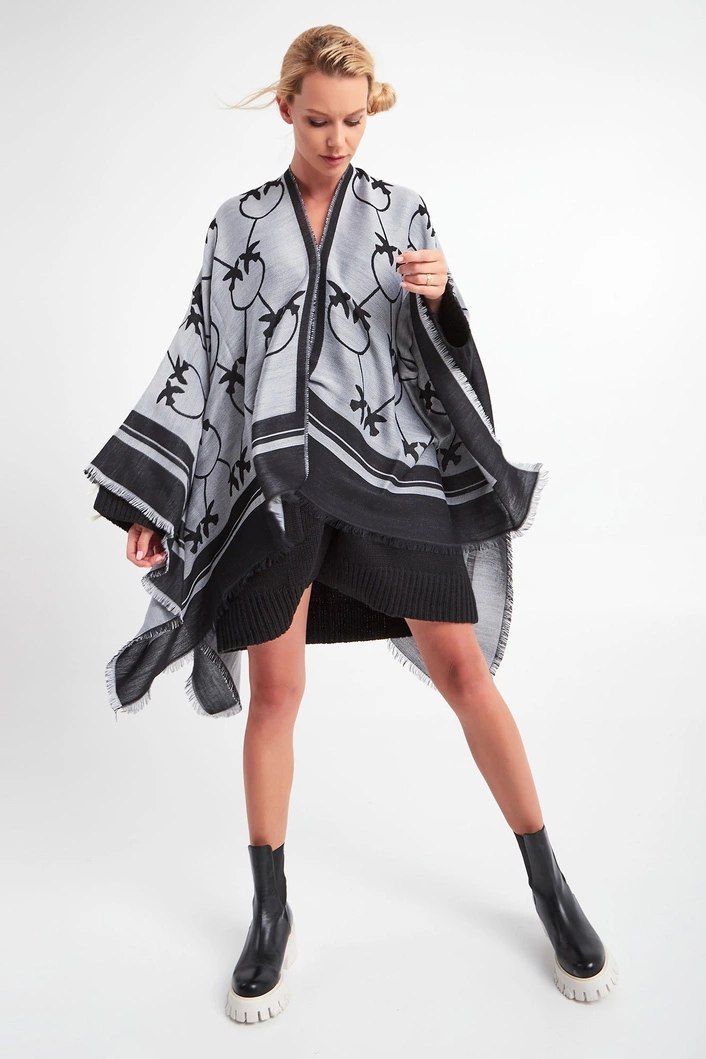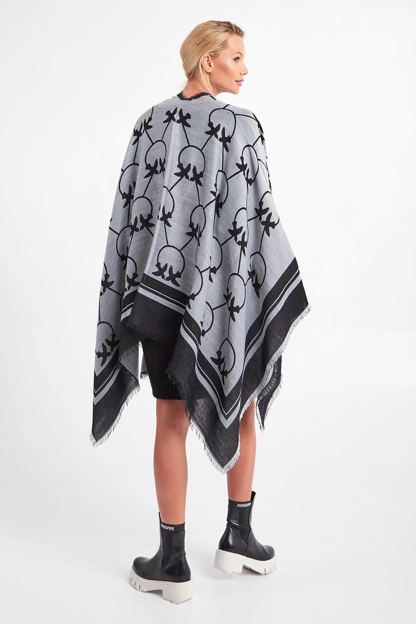 Ponczo marki Pinko, model Podor. W jasnoszaro-czarnym kolorze. Na całości nadruk w postaci logo marki. Wykończone ozdobnym strzępieniem. Wykonane z mieszanki wełny i modalu.
