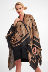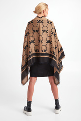 Ponczo marki Pinko, model Podor. W beżowo-czarnym kolorze. Na całości nadruk w postaci logo marki. Wykończone ozdobnym strzępieniem. Wykonane z mieszanki wełny i modalu.