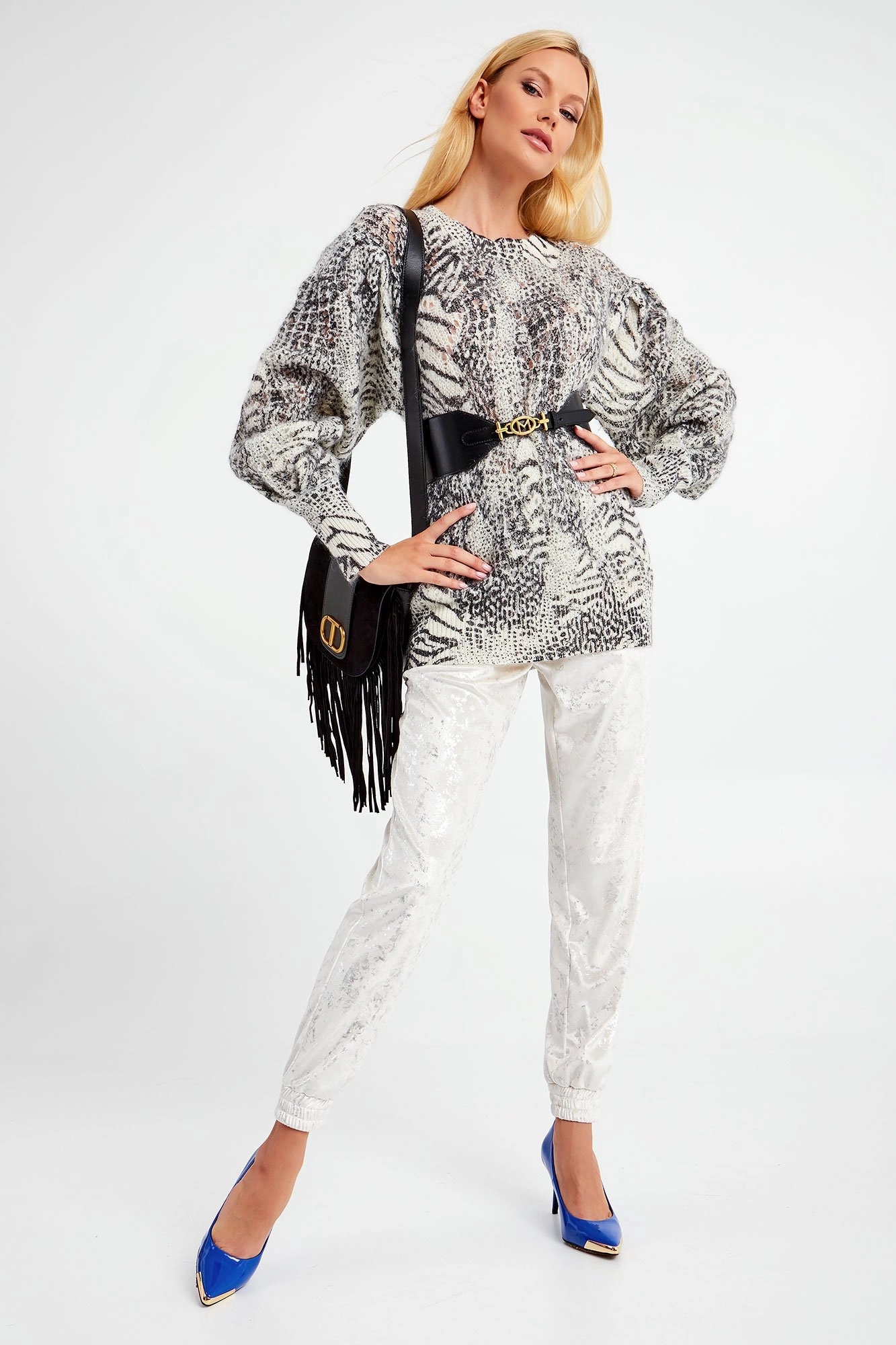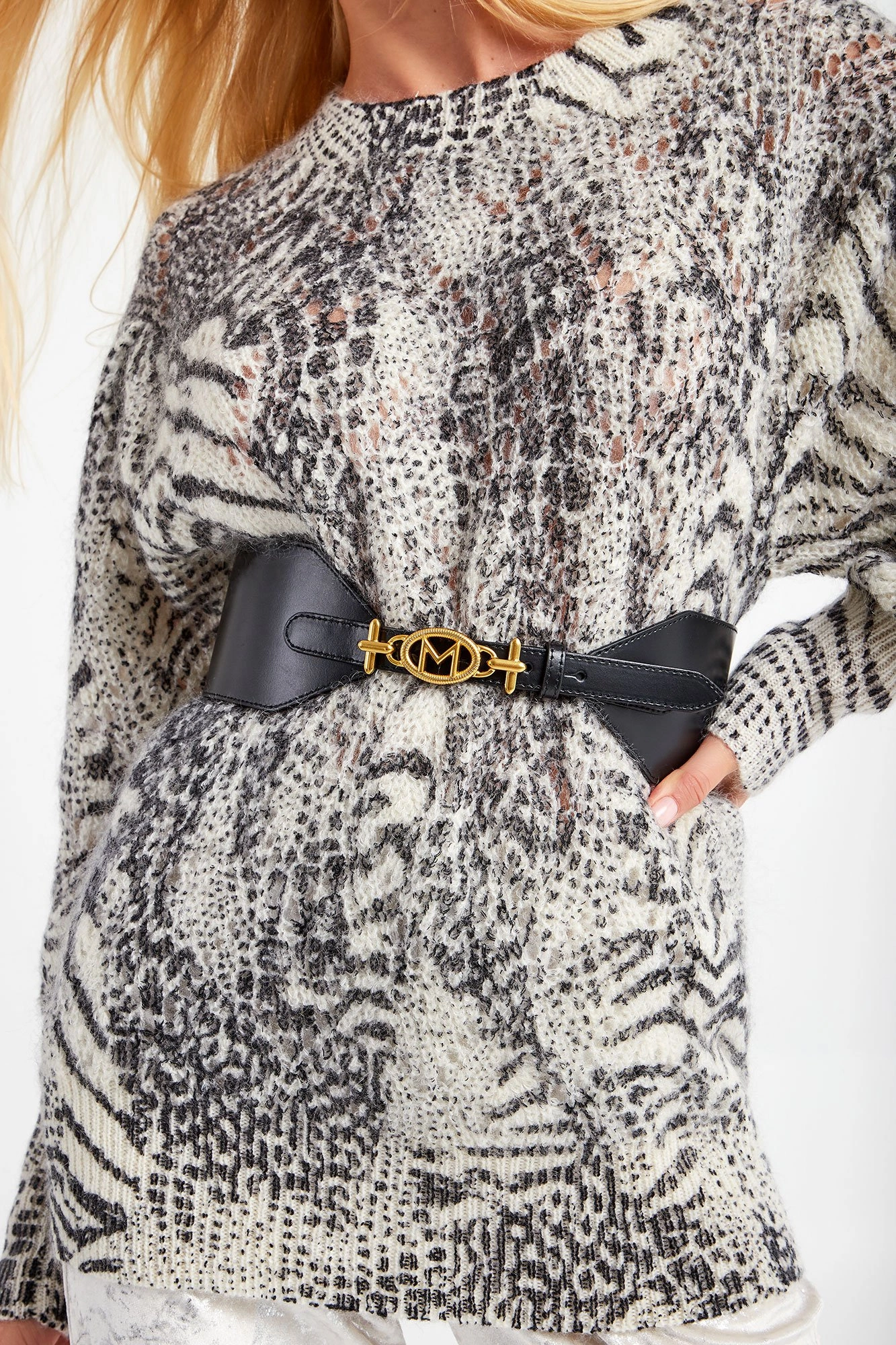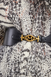 Szeroki pasek marki Marella w czarnym kolorze. Wykonany ze skóry naturalnej. Zapinany za pomocą sygnowanej, złotej klamry z bolcem w kształcie monogramu marki. Idealny do noszenia w talii, jako dodatek do sukienki lub swetra.