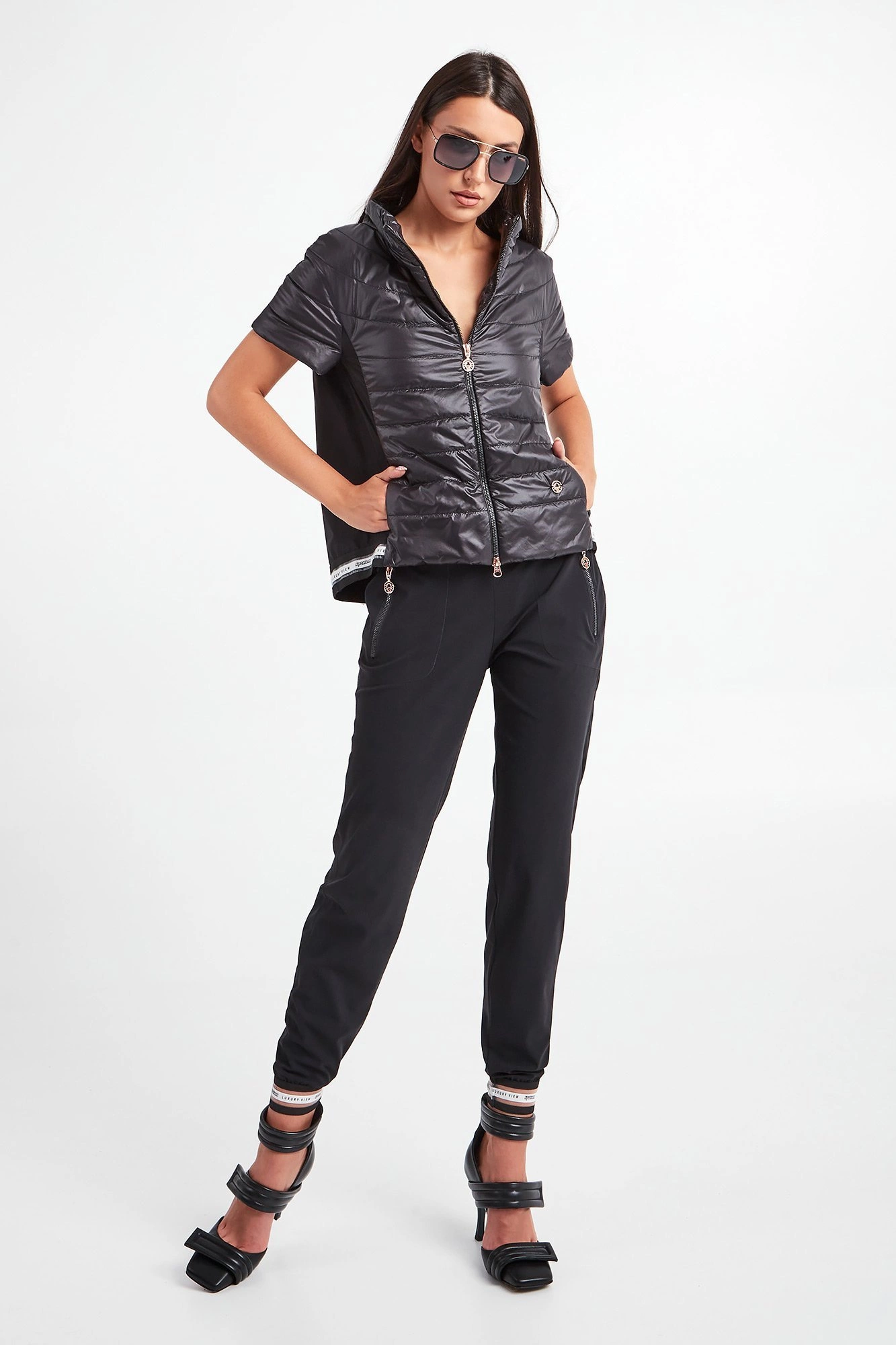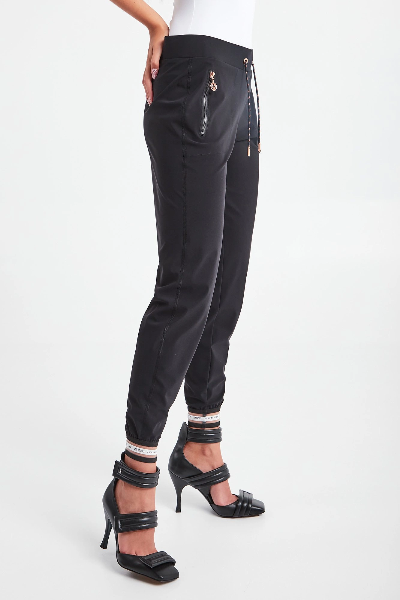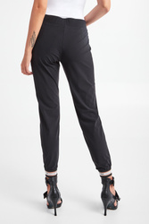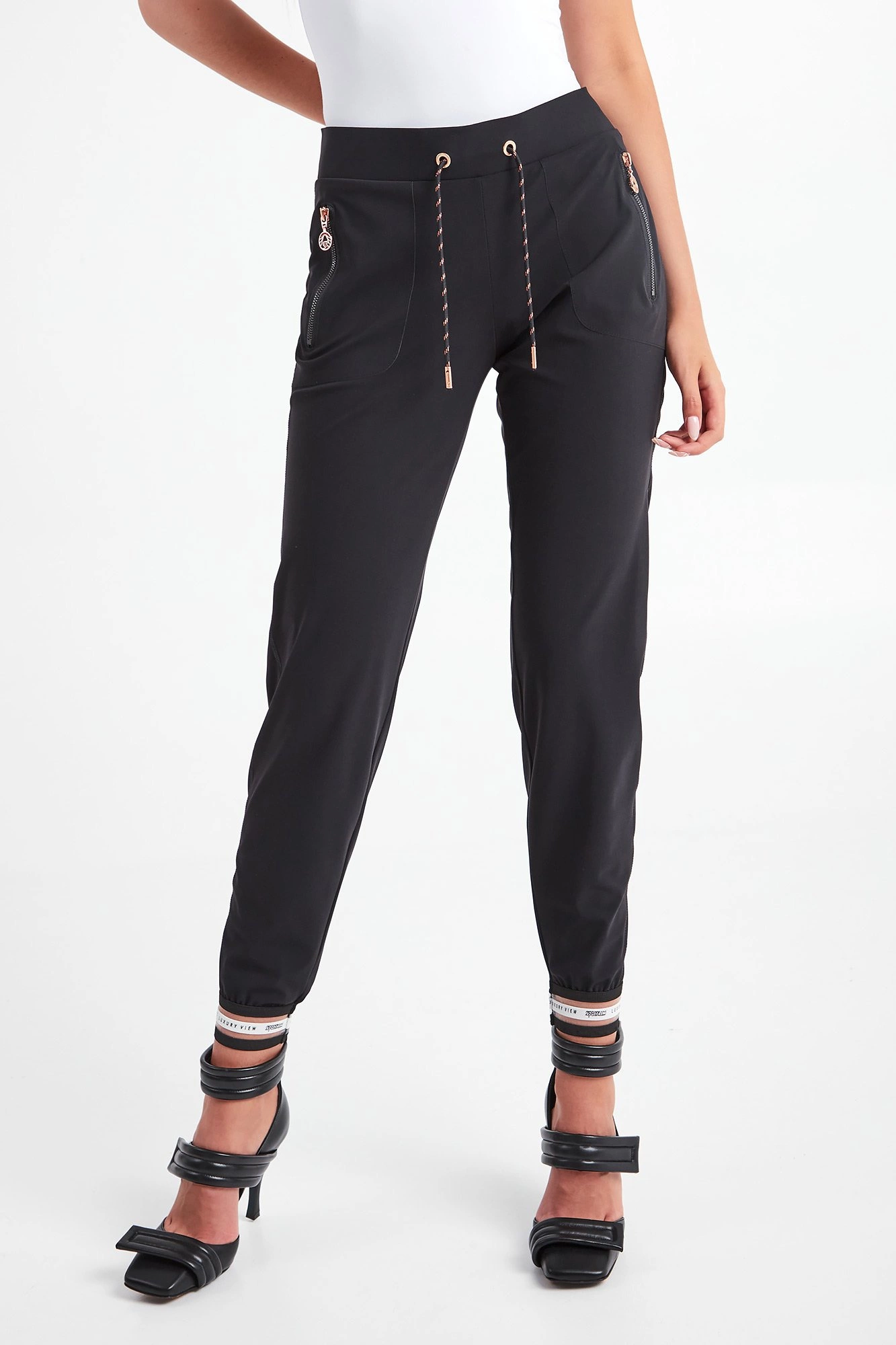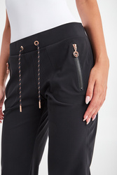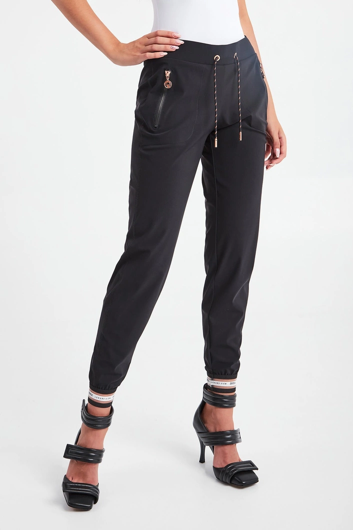 Spodnie marki Sportalm w czarnym kolorze. Fason regular fit. W pasie ściągacz regulowany za pomocą połyskujących troczków z ozdobnymi stoperami. Model z dwiema bocznymi kieszeniami zapinanymi za pomocą zamków z zawieszkami w kształcie logo w kolorze różowego złota. U dołu nogawek ażurowe, sygnowane ściągacze. Wykonane z przyjemnej w dotyku, elastycznej tkaniny.