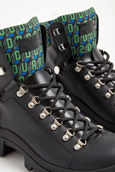 Trapery marki Dsquared2 w czarnym kolorze. Wykonane ze skóry naturalnej. Na całości przeszycia w czarnym kolorze. Cholewka i język wykończone niebiesko-zielonym nadrukiem ze skórzaną aplikacją z nazwa marki. Na Z tyłu z gumową aplikacją z logo marki. Wiązane za pomocą materiałowych sznurówek. Gumowa, sygnowana podeszwa podeszwa. W zestawie z workiem przeciwkurzowym.