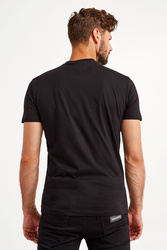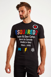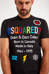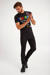 T-shirt w czarnym kolorze marki Dsquared2. Luźny fason regular fit. Krótkie rękawy i dół wykończony przeszyciem. Okrągły dekolt typu o-neck wykończony ściągaczem. Z przodu wielokolorowy nadruk. T-shirt wykonany z miękkiej w dotyku, czystej bawełny. Idealny jako baza casualowych stylizacji.