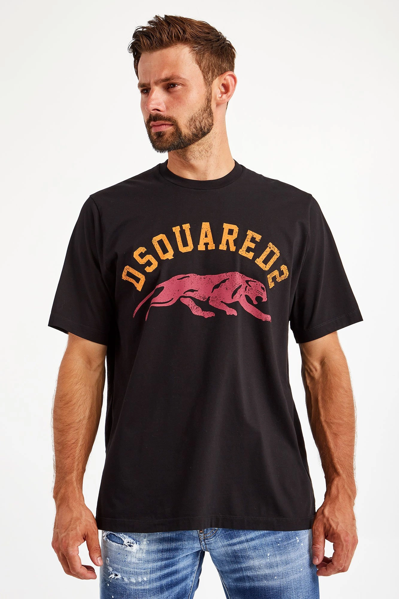 T-shirt Dsquared2 to klasyczny, świetny jakościowo T-shirt o prostym kroju. Czerń bawełny stanowi doskonałe tło dla żółtego logo marki. Dziki kot w odcieniu malinowej czerwieni podkreśla charakterystyczny dla marki styl - zdefiniowaną na nowo zadziorność i niepokorność. Czerwień i odcienie żółtego są również charakterystyczne dla Dsquared2 - tworzą przykuwający uwagę duet, obok którego nie sposób przejść obojętnie, podobnie jak obok mężczyzny w ubraniach tej włosko-kanadyjskiej marki.