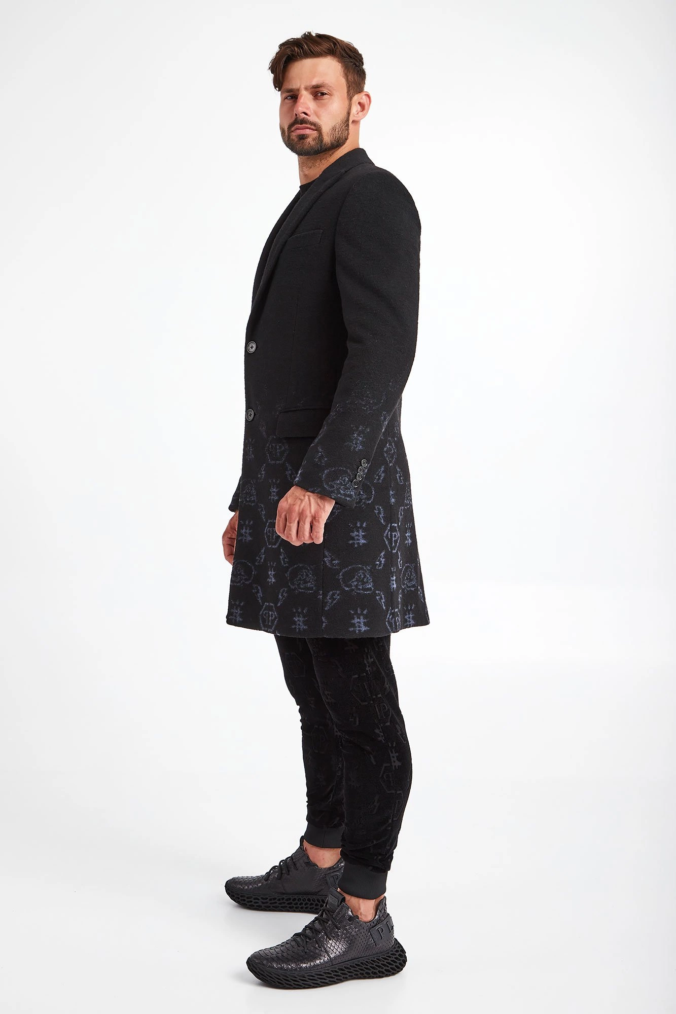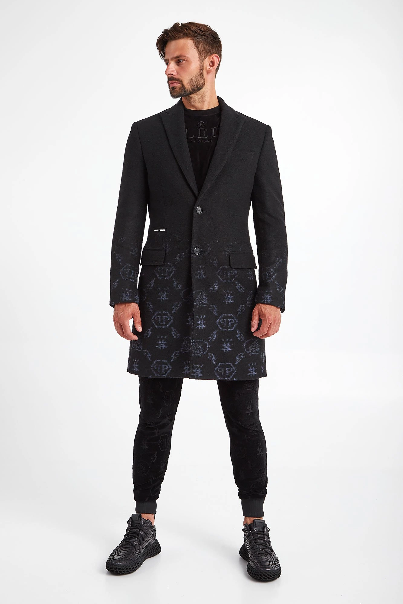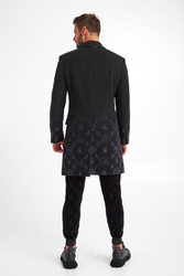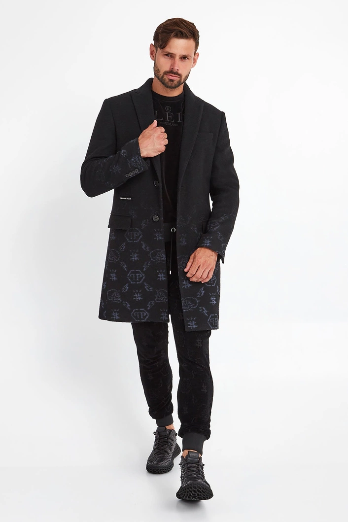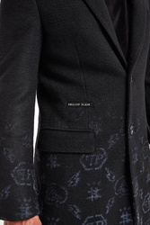 Płaszcz marki Philipp Plein w czarnym kolorze. Fason slim fit. Wykonany z wełnianej tkaniny. U dołu błękitne wzory. Zapinany za pomocą dwóch sygnowanych guzików. Z przodu dwie patki oraz srebrny, metalowy napis w postaci nazwy marki. Rękawy zapinane guzikami. Na linii karku srebrna, sygnowana zawieszka. Z tyłu rozcięcie. Pikowana podszewka. Stylowy, komfortowy i niepowtarzalny.