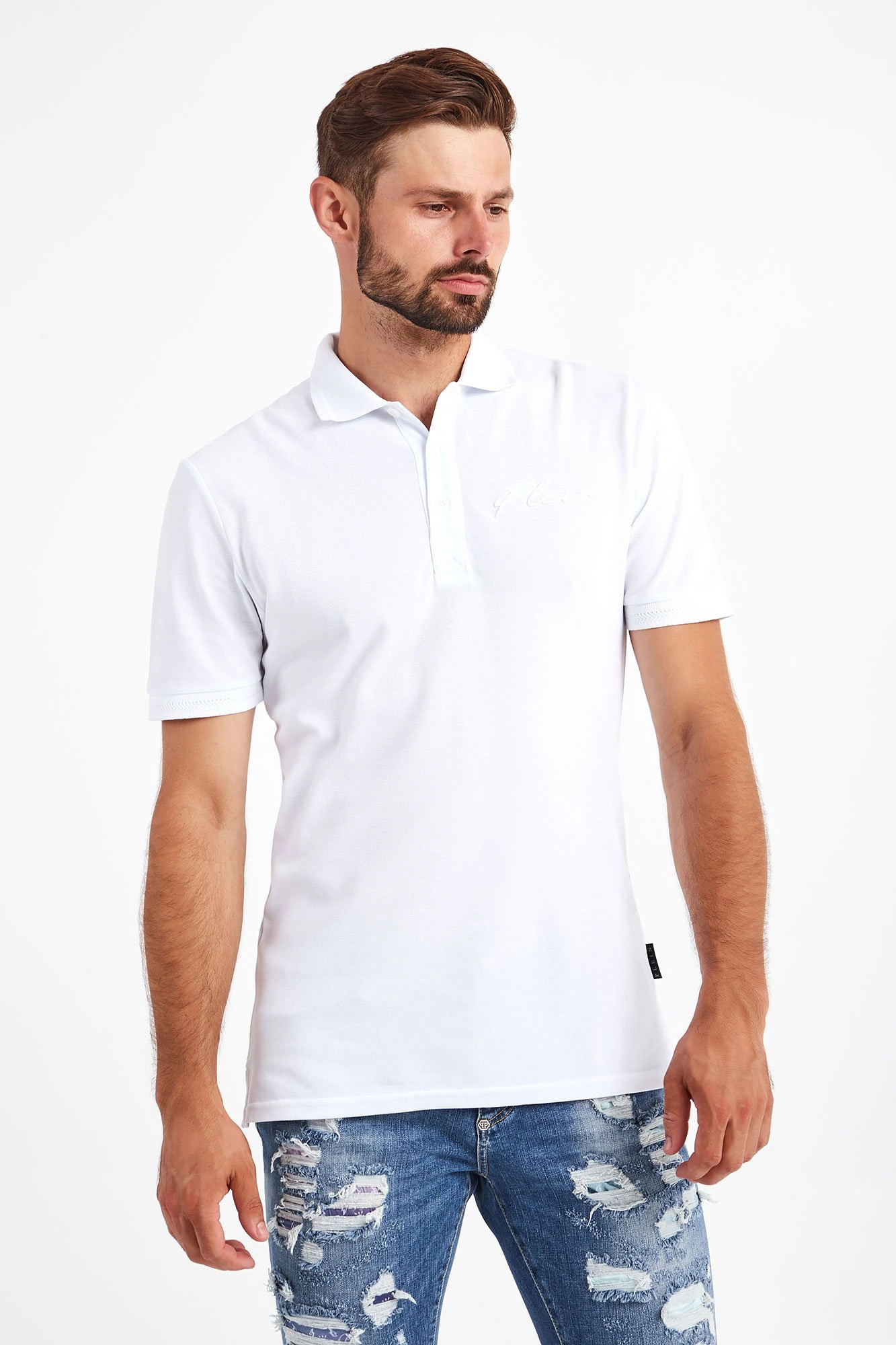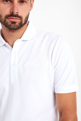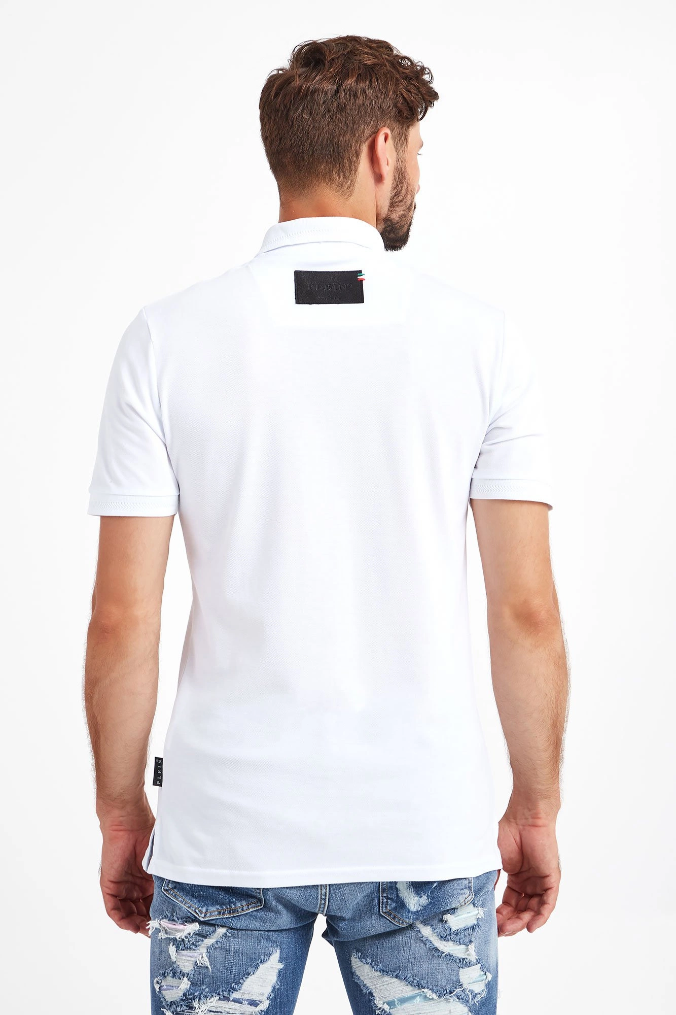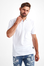 Polo marki Philipp Plein w białym kolorze. Fason regular fit. Zapinane za pomocą sygnowanych guzików. Na lewej piersi haftowane logo. Krótkie rękawy oraz klasyczny kołnierz zakończone ozdobnie przeszytą lamówką. U dołu, z boków rozcięcia. Z tyłu sygnowana, kontrastująca, skórzana naszywka z przeszyciem w kolorach flagi włoskiej. Wykonane z czystego, bawełnianego dżerseju.
