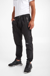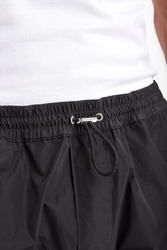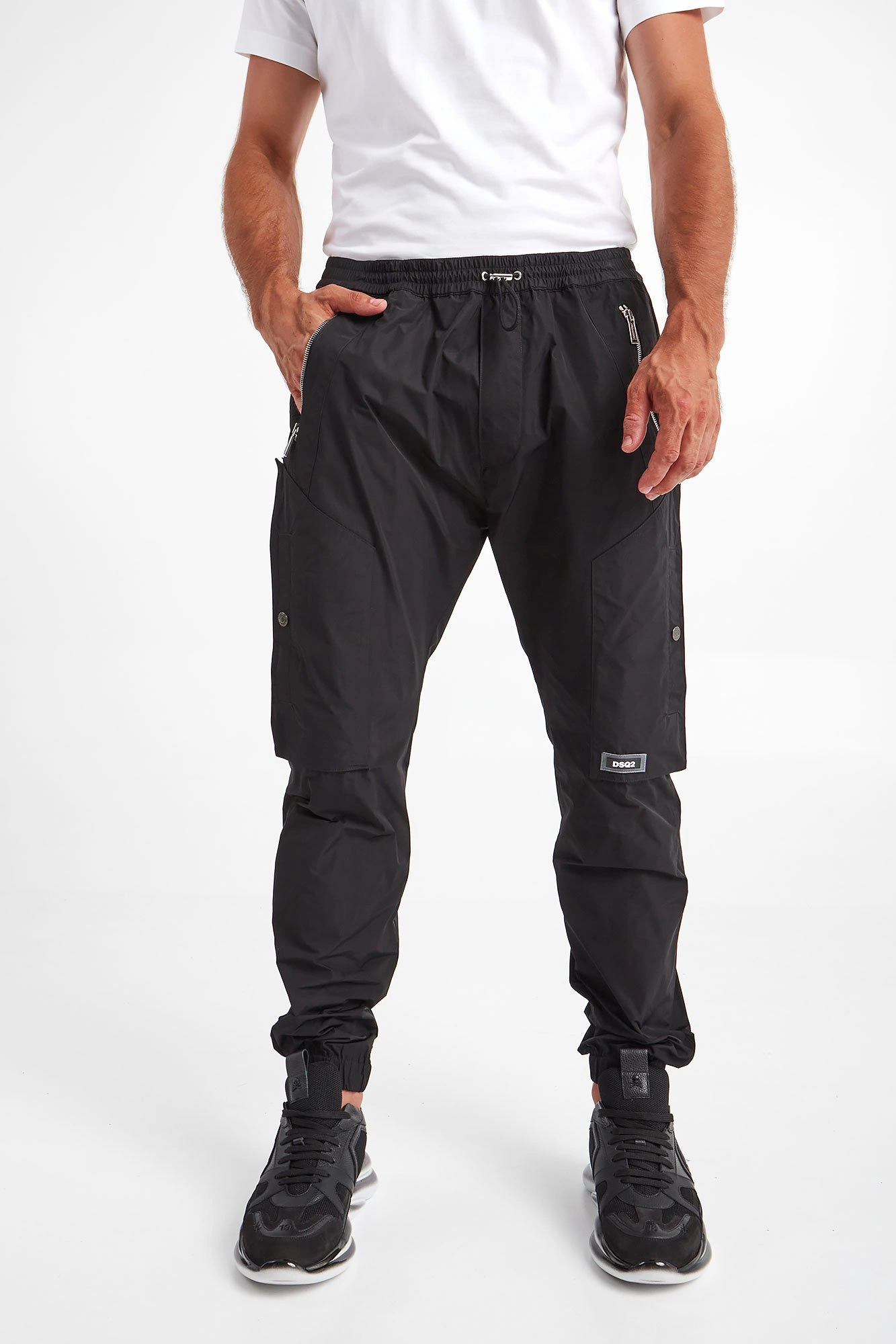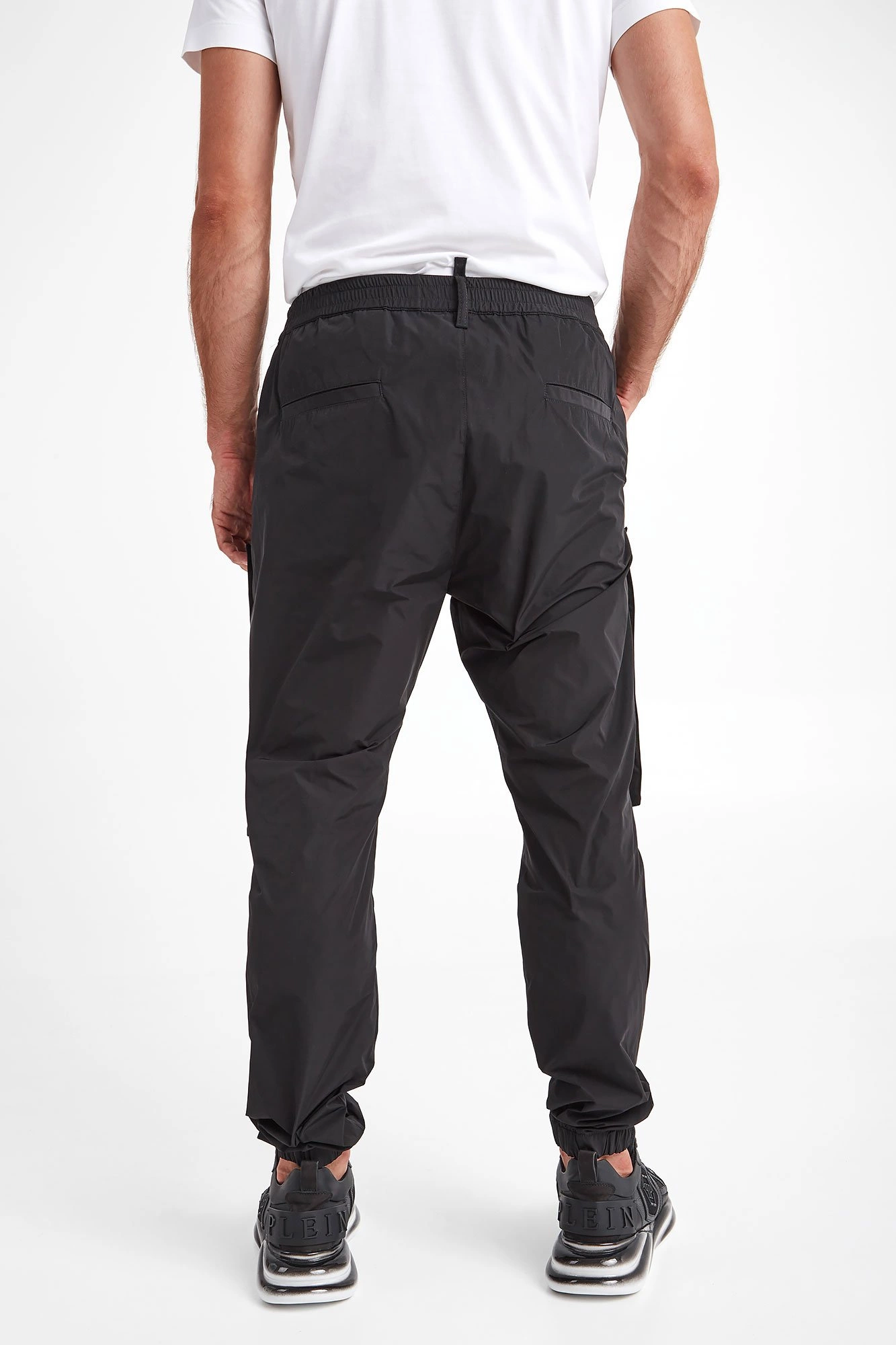 Spodnie cargo marki Dsquared2 w czarnym kolorze. Luźniejszy fason typu regular. Model z sześcioma kieszeniami zapinanymi na sygnowane zamki błyskawiczne i guziki. W pasie ze ściągaczem regulowanym za pomocą stopera. Z przodu z przeszyciami. Zwężające się ku dołowi nogawki zakończone ściągaczami. Wykonane ze śliskiego materiału.
