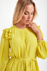 Sukienka Twinset w limonkowym kolorze. Fason typu regular fit. Przód z ozdobnymi zakładkami. Dół i linia ramion wykończone falbanami. Długie, lekko bufiaste rękawy zapinane na niewielki, sygnowany guzik. Dekolt typu o-neck zapinany z tyłu. Pod linią karku niewielka aplikacja z logo i nazwa marki w złotym kolorze. W zestawie z materiałowym paskiem dzięki, któremu można regulować talię. Całość wykonana z mieszanki jedwabiu i wiskozy.
