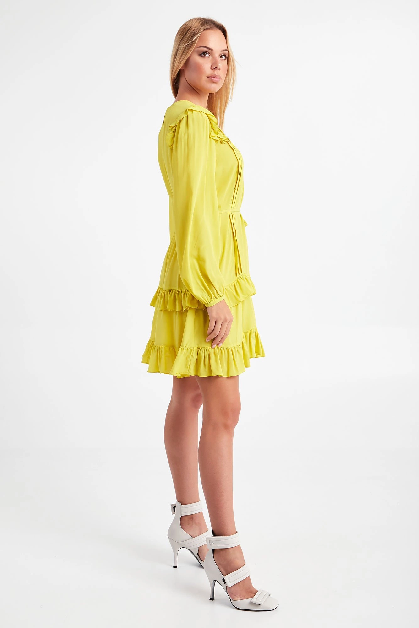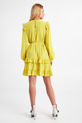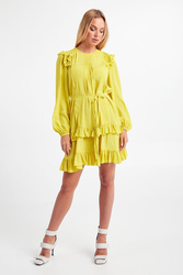 Sukienka Twinset w limonkowym kolorze. Fason typu regular fit. Przód z ozdobnymi zakładkami. Dół i linia ramion wykończone falbanami. Długie, lekko bufiaste rękawy zapinane na niewielki, sygnowany guzik. Dekolt typu o-neck zapinany z tyłu. Pod linią karku niewielka aplikacja z logo i nazwa marki w złotym kolorze. W zestawie z materiałowym paskiem dzięki, któremu można regulować talię. Całość wykonana z mieszanki jedwabiu i wiskozy.