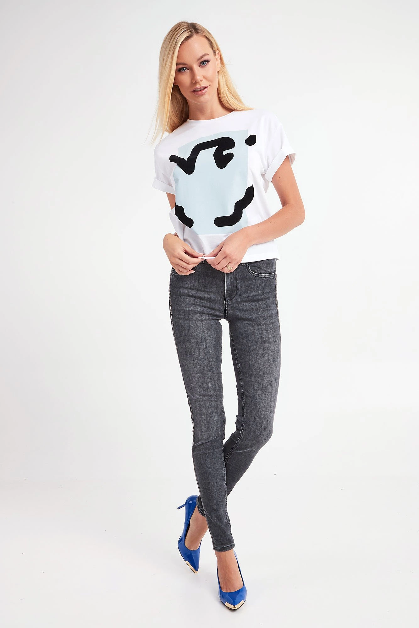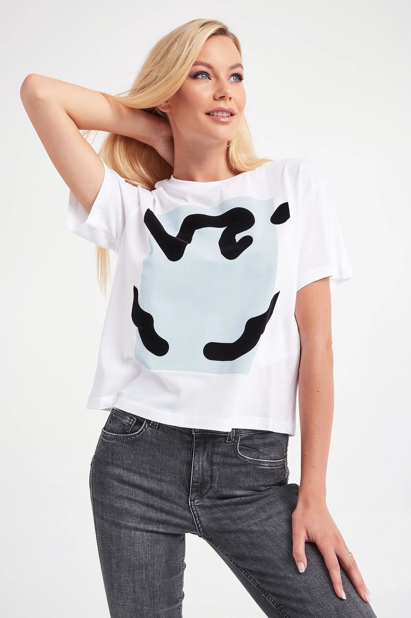 Biały t-shirt marki Emporio Armani. Luźny, krótszy nowoczesny fason. Z przodu duży nadruk z logiem marki. Dekolt typu o-neck zakończony ściągaczem. Obniżona linia ramion. Krótkie rękawy oraz dół wykończone lamówką. Wykonany z czystej, przyjemnej w dotyku bawełny.