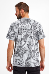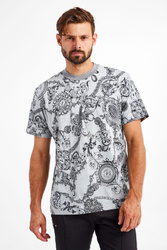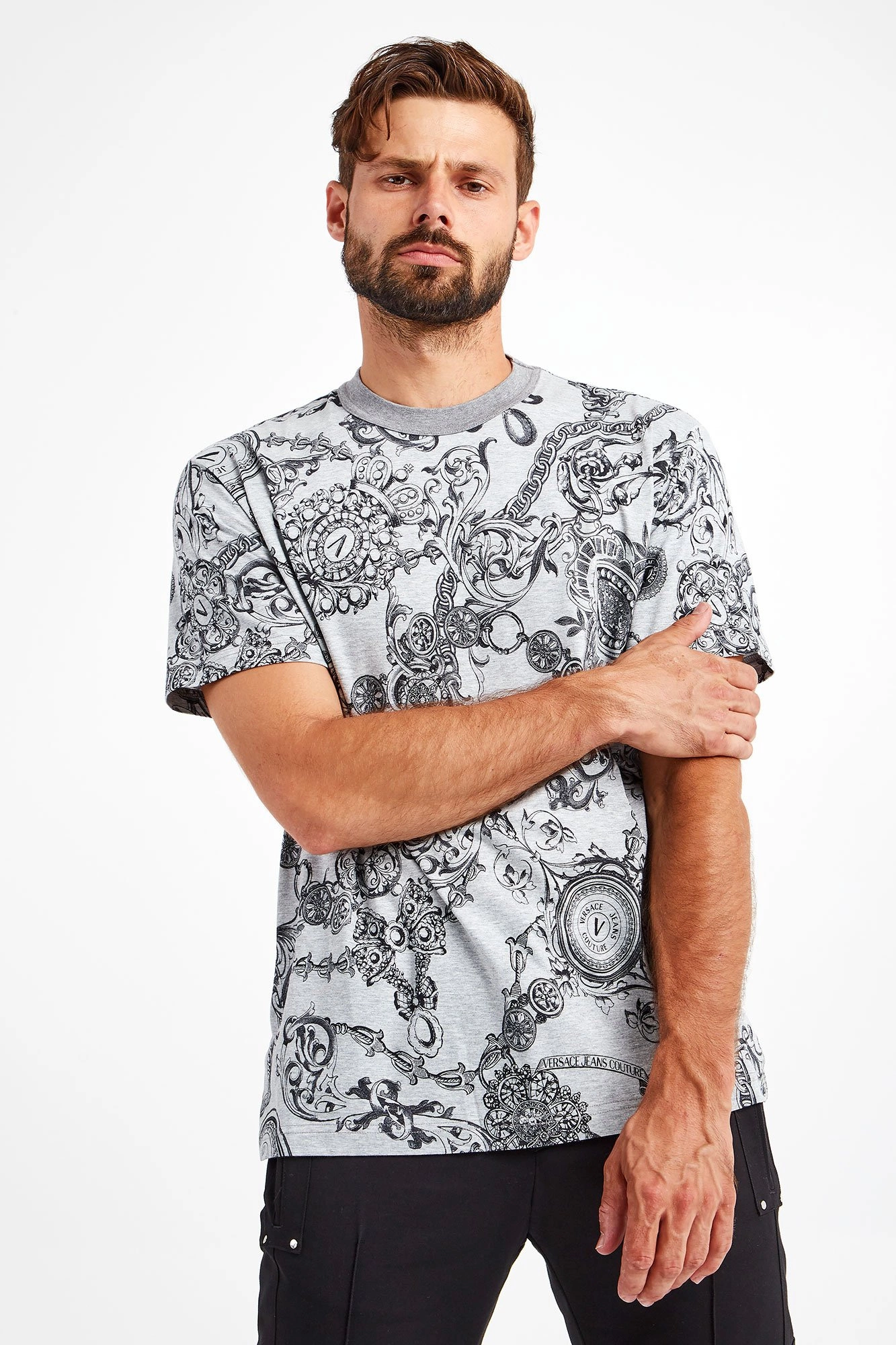 Szary t-shirt marki Versace Jeans Couture. Na całości czarne, charakterystyczne dla marki, barokowe wzory. Krój regular fit. Dekolt typu o-neck zakończony szerokim ściągaczem. Krótkie rękawy oraz dół wykończony lamówką. Wykonany z czystej bawełny.