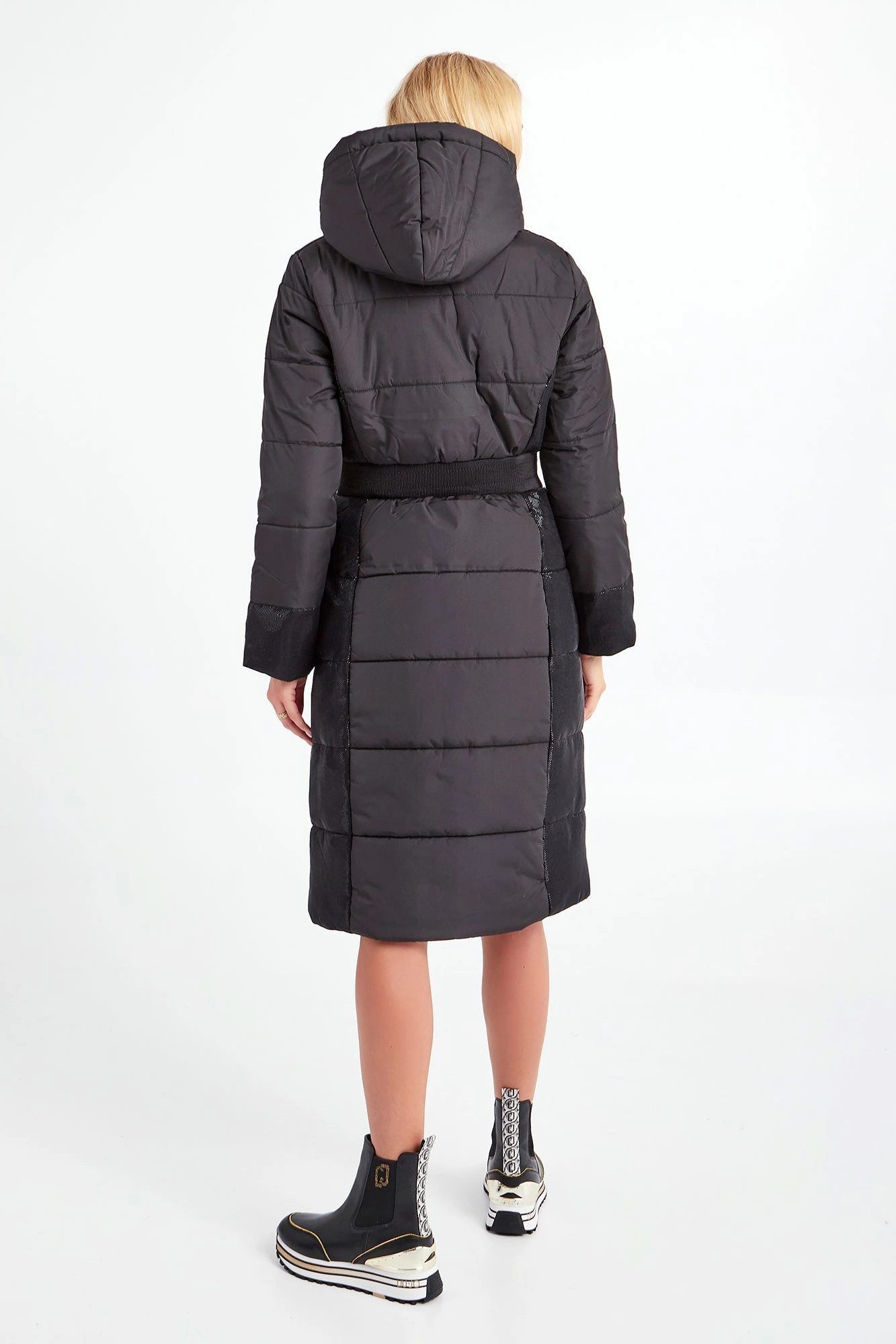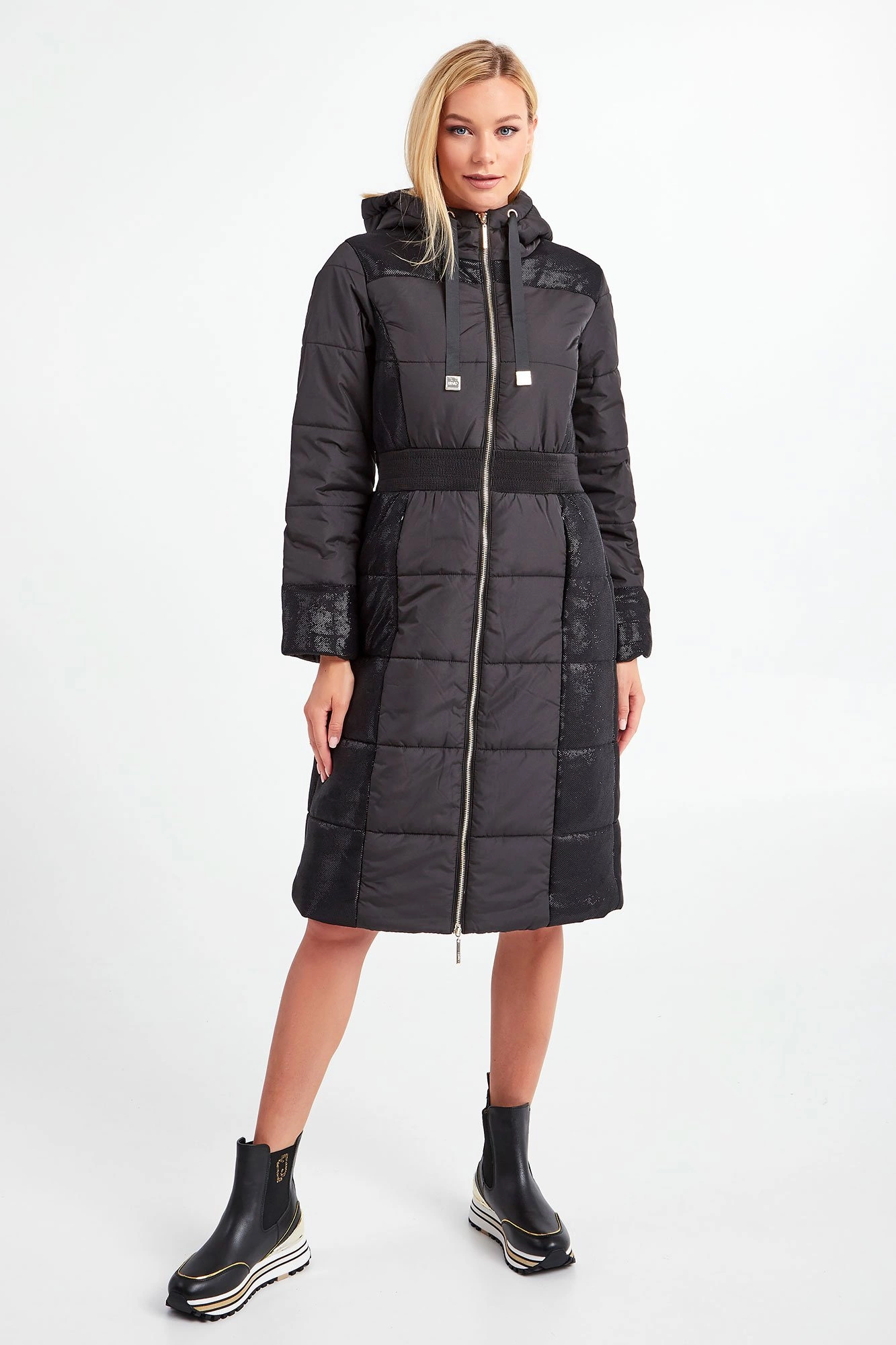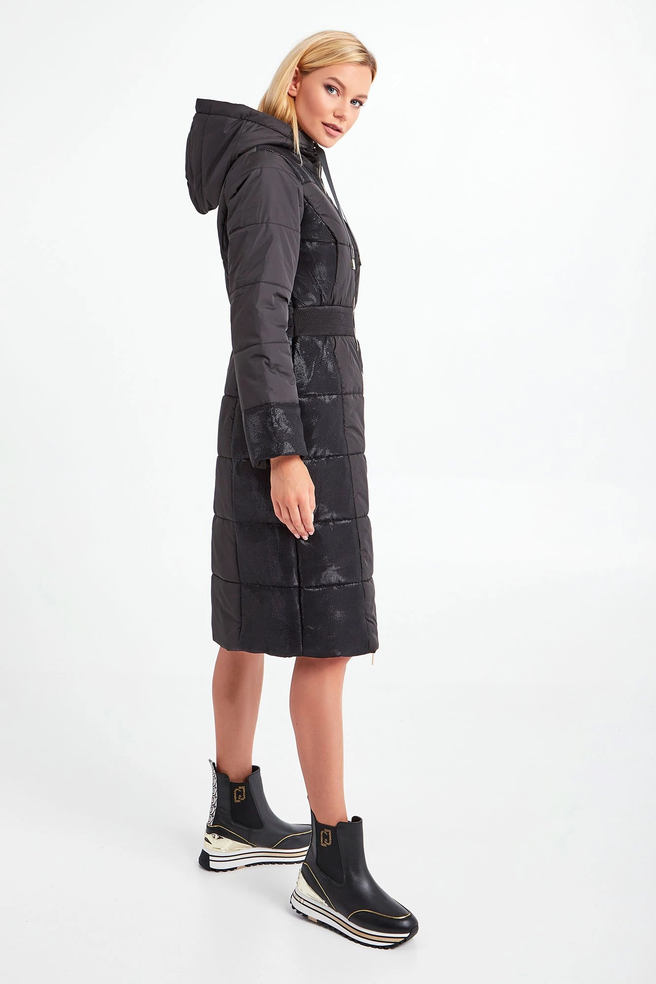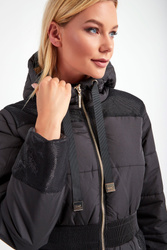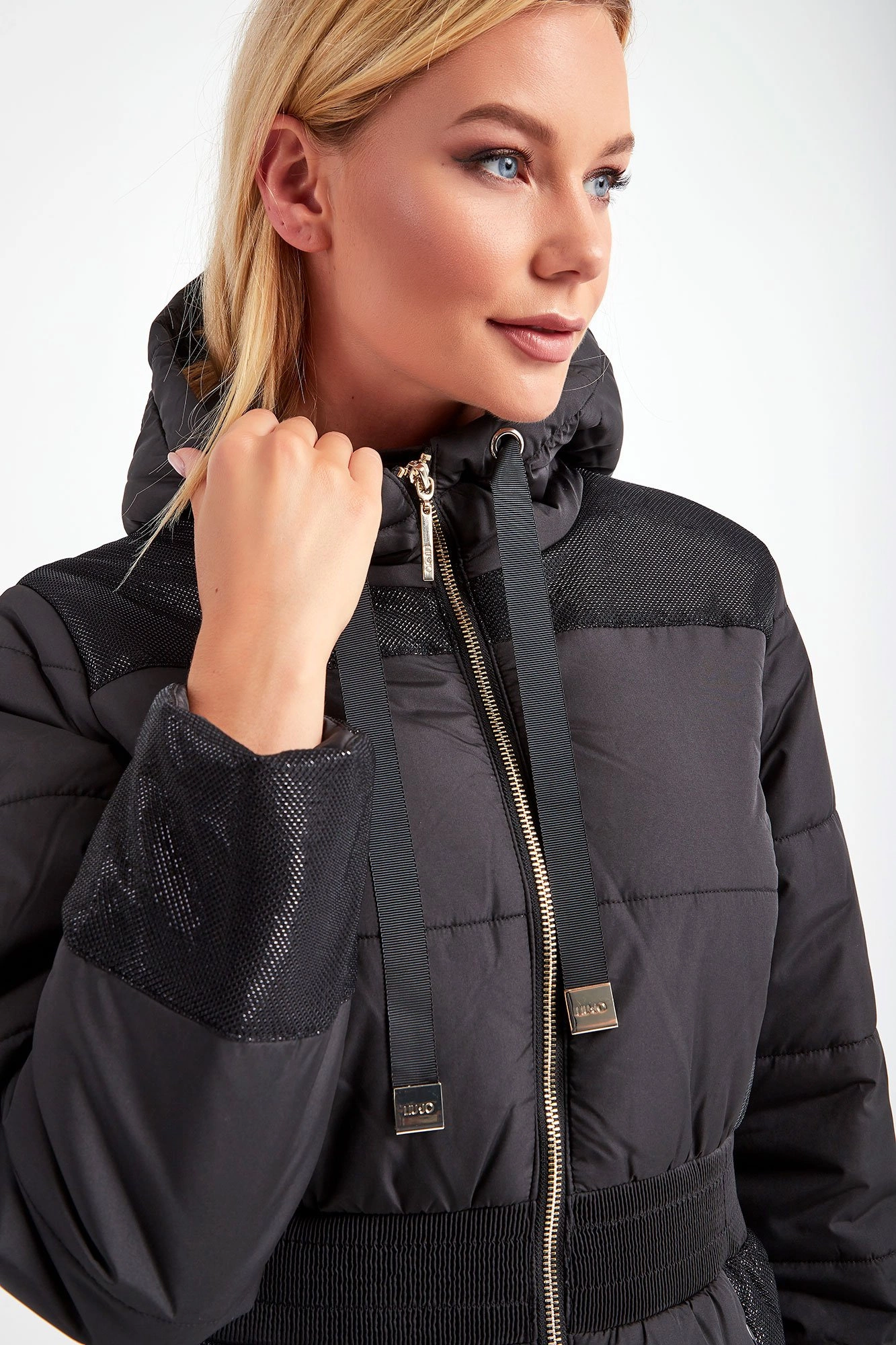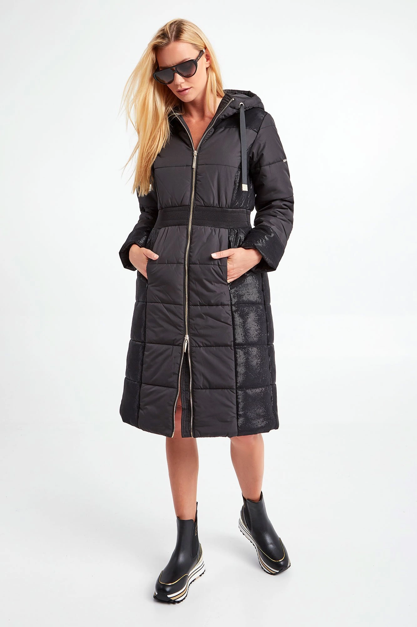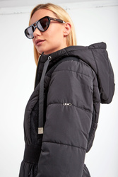 Płaszcz z kapturem marki Liu Jo Sport w czarnym kolorze. Fason oversize. Na całości pikowany. Ozdobiony połyskującym, srebrnym przeszyciem. Zapinany za pomocą dwustronnego, złotego zamka z sygnowanymi zawieszkami. Dwie boczne, zamykane kieszenie. W pasie szeroki ściągacz. Kaptur regulowany za pomocą tasiemek ze złotymi, ozdobnymi, logowanymi stoperami. Na lewym rękawie metalowa zawieszka w kształcie logo.