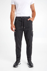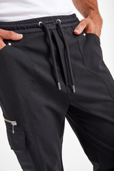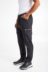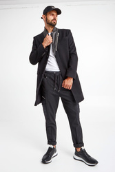 Czarne spodnie marki Les Hommes. Prosty fason regular fit. Zapinane na kryty zamek. Pas elastyczny, regulowany za pomocą grubych troczków ze srebrnymi stoperami. Liczne kieszenie. Niektóre zapinane na masywne, srebrne zamki z logowanymi zawieszkami. Zdobienie w postaci dżetów z tłoczeniem nazwy marki. Na tylnej kieszeni srebrna aplikacja. Spodnie wykonane z połączenia lekkich włókien wełnianych z nieciągłymi włóknami poliestrowymi i elastanem. Baza dodająca charakteru miejskim i casualowym stylizacjom.