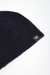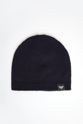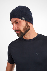 Czapka marki Emporio Armani w granatowym kolorze. Z boku naszywka z monogramem marki. Wykonana z czystej, kaszmirowej tkaniny.