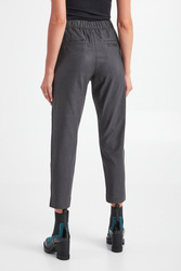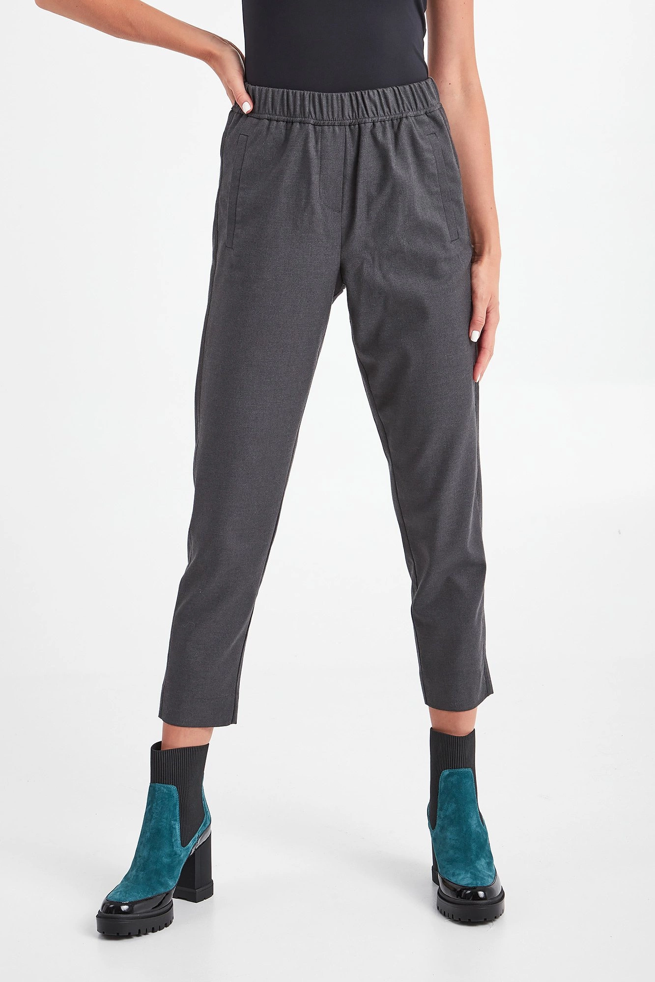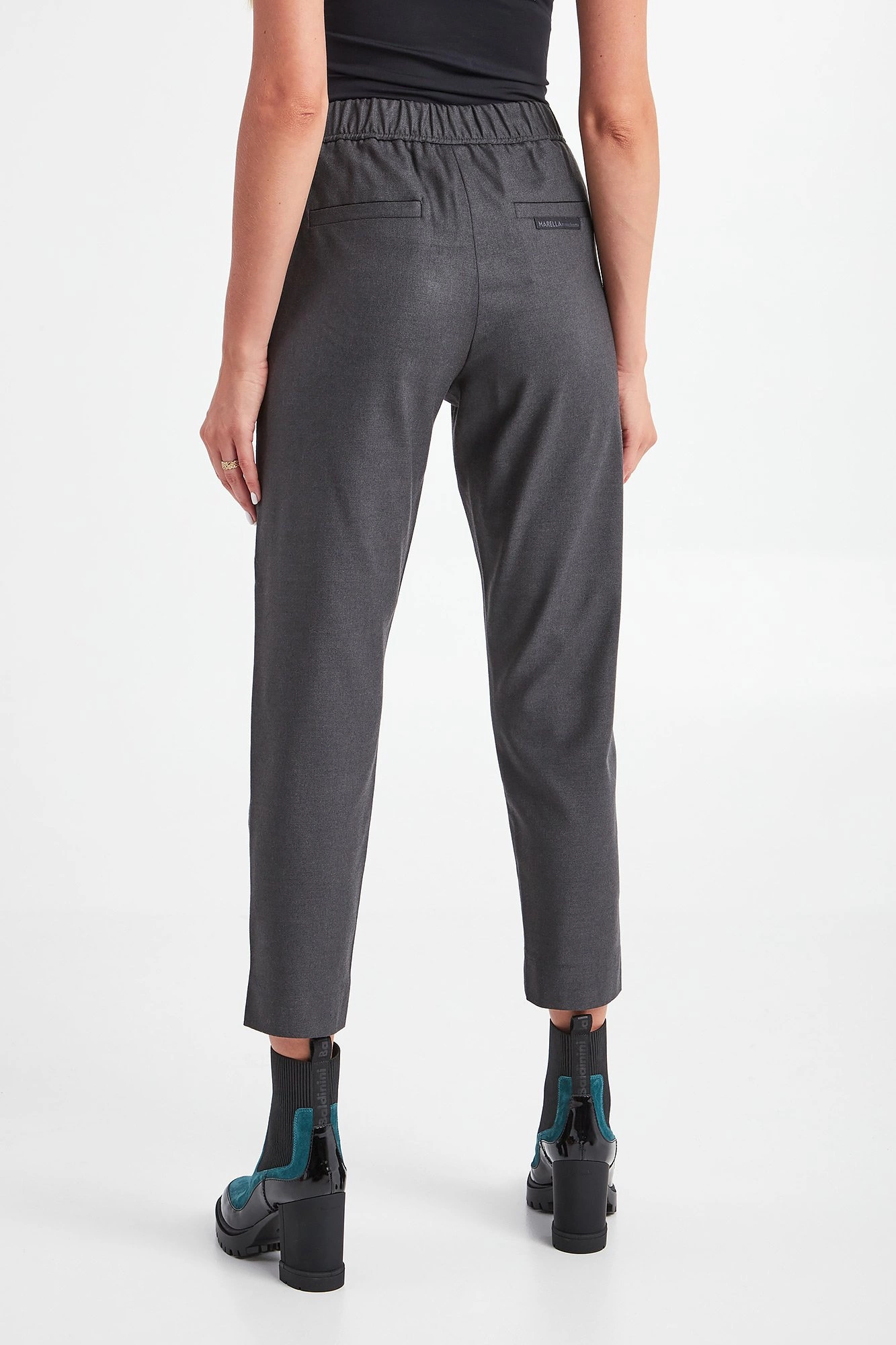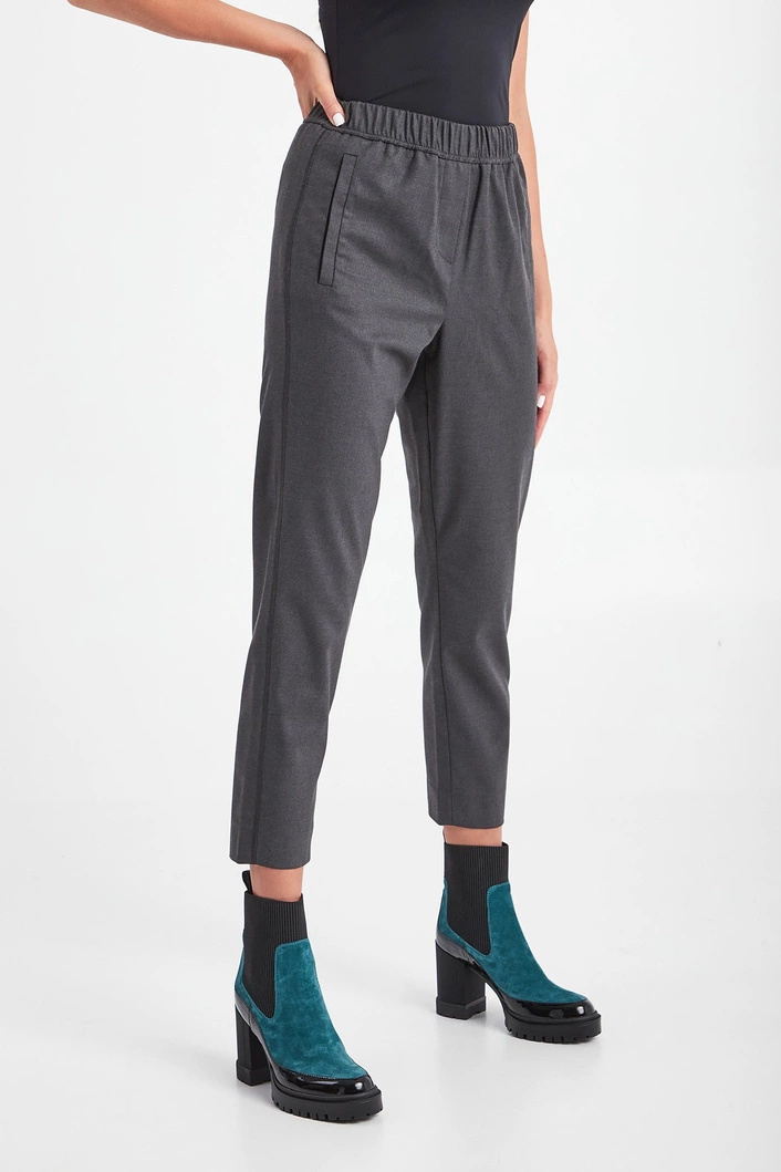 Spodnie marki Marella w grafitowym kolorze. Spodnie są częścią projektu Marella Monochrome - jednokolorowe style ze starannie dobranych materiałów. Fason typu regular fit. Zwężane ku dołowi nogawki. Model z dwoma kieszeniami z przodu oraz imitacją kieszeni z tyłu. W pasie elastyczny ściągacz. Wykonane z delikatnej i miękkiej wiskozy.