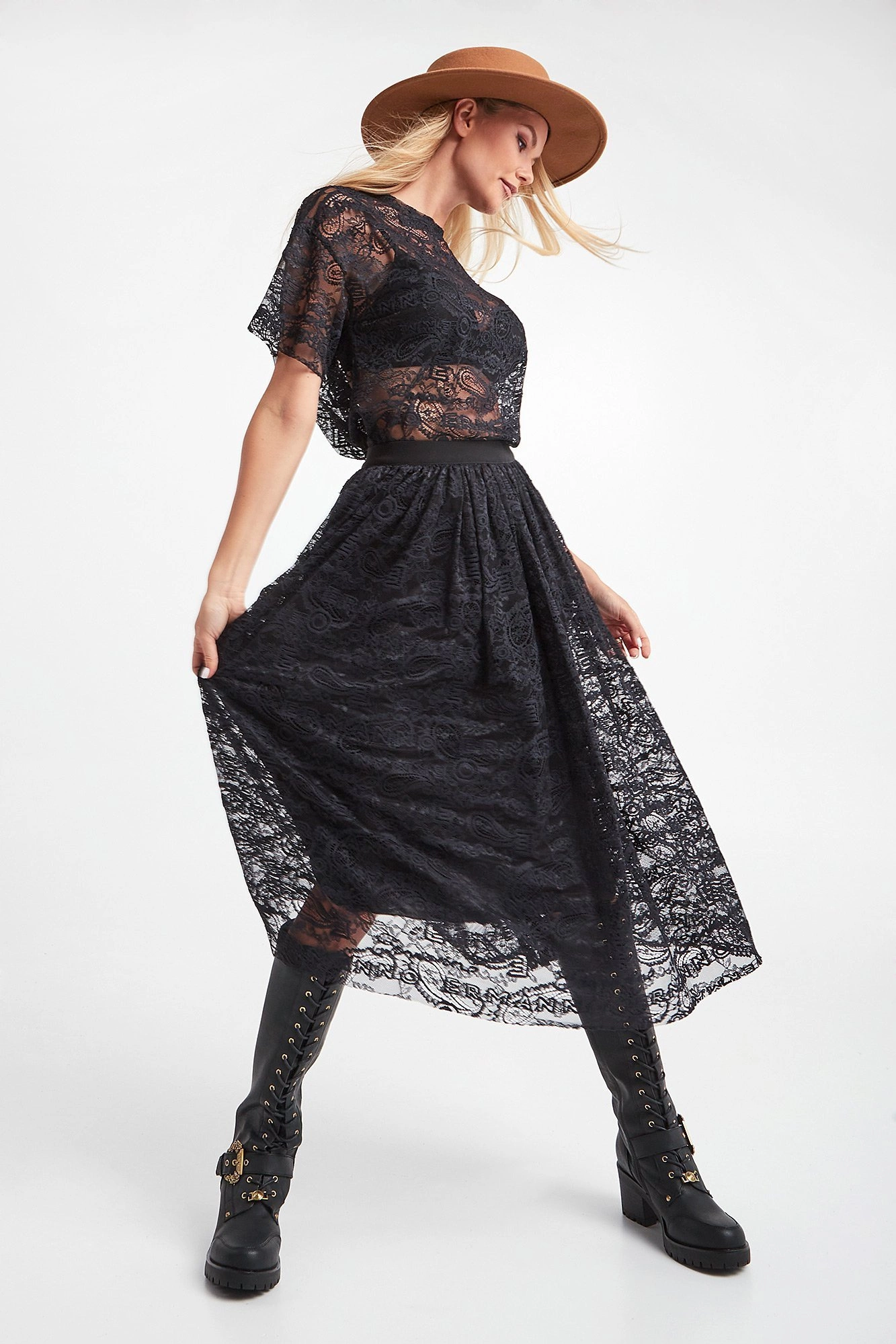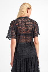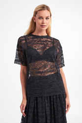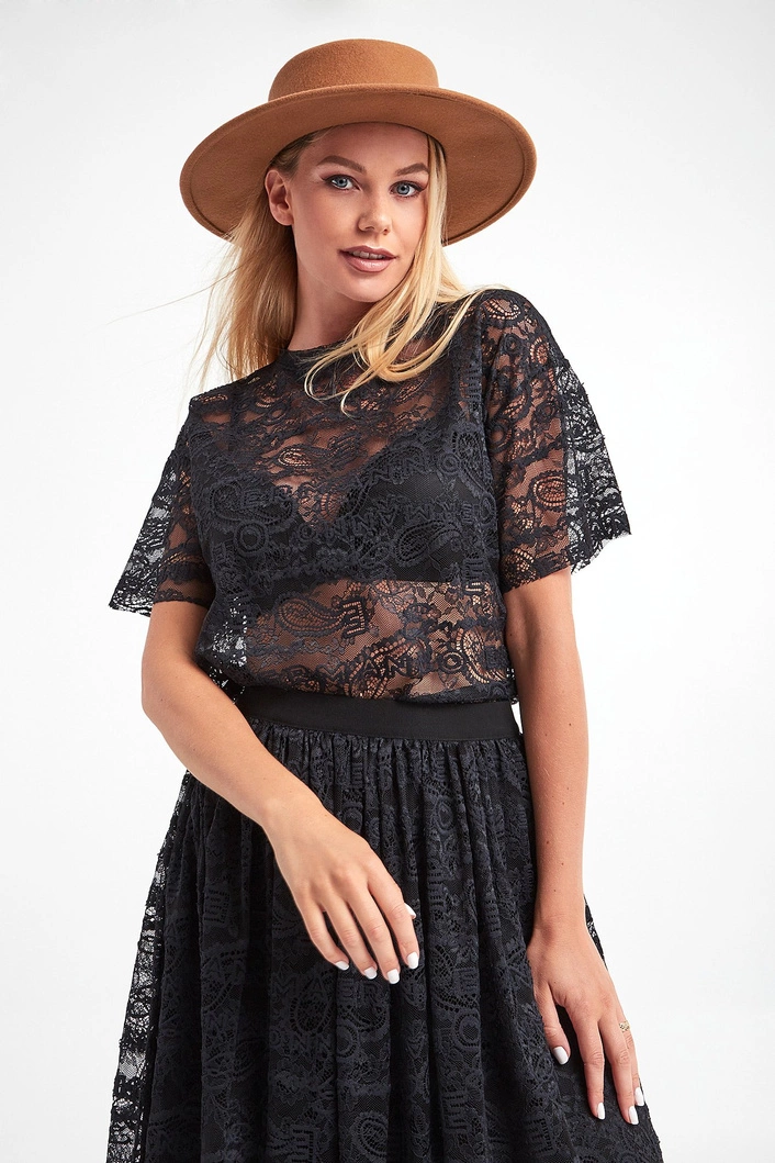 Bluzka marki Ermanno Firenze w czarnym kolorze. Krój typu regular fit. Wykonana z półtransparentnej koronki z haftowanymi monogramami oraz logo. Dekolt typu o-neck zakończony lamówką. Krótkie, proste rękawy. Klasyczna i bardzo kobieca.
