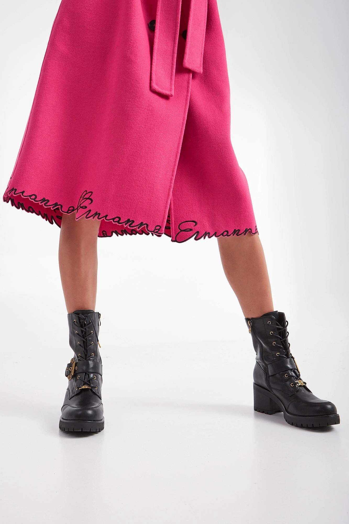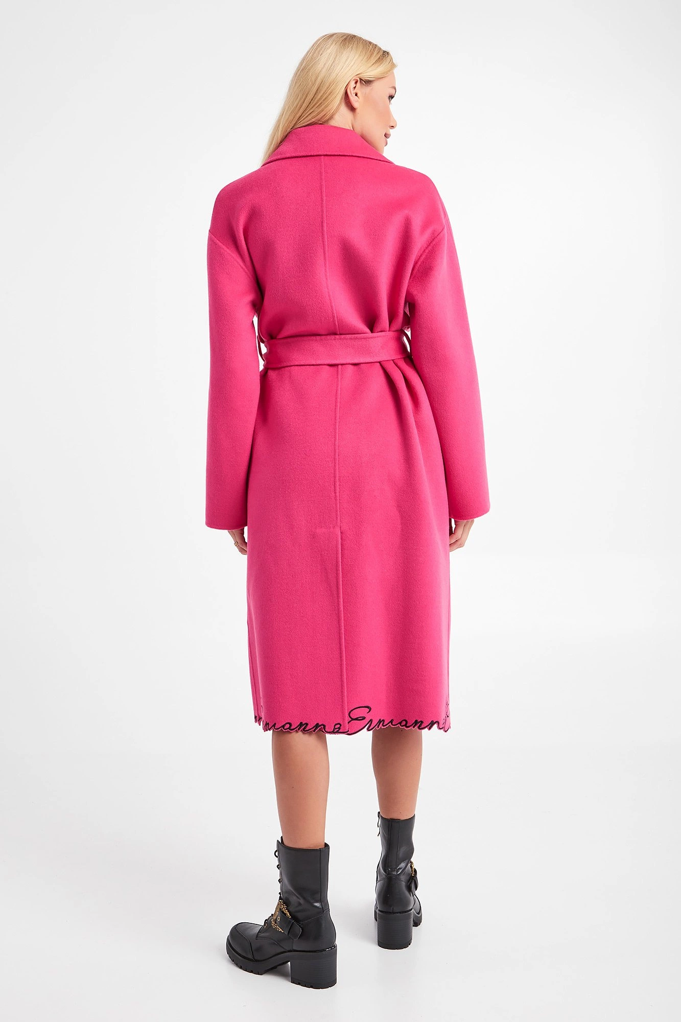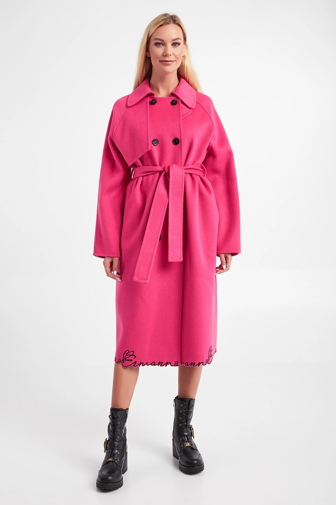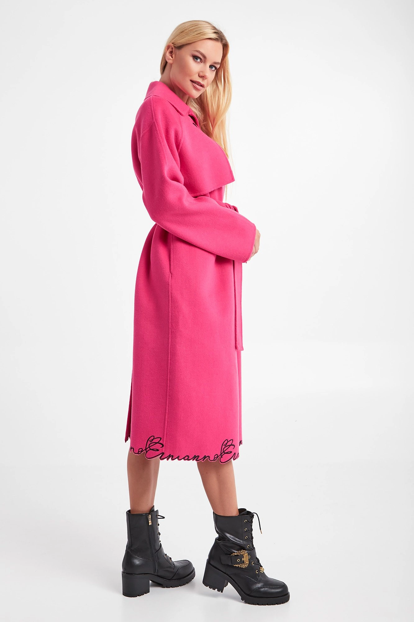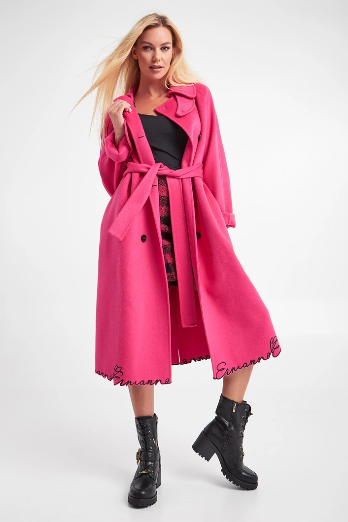 Płaszcz marki Ermanno Firenze w intensywnym, różowym kolorze. Krój regular fit. Zapinany za pomocą dwurzędowych guzików, w talii dodatkowo pasek w kolorze płaszcza. Przy dekolcie kołnierz. Dwie boczne, wpuszczane, niezamykane kieszenie. Wykończony haftowaną, czarną, kontrastującą lamówką układającą się w nazwę marki. Wykonany z czystej wełny.