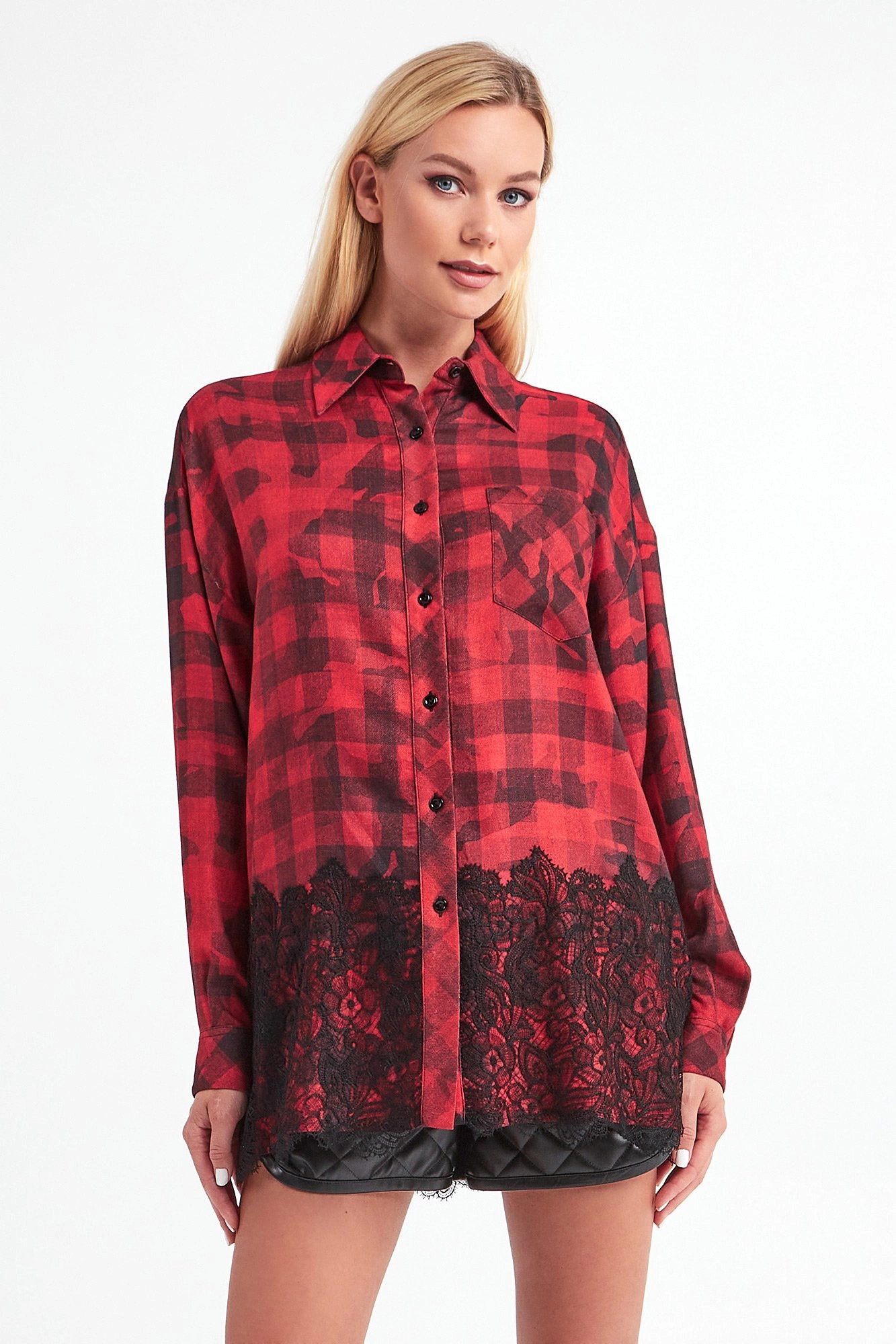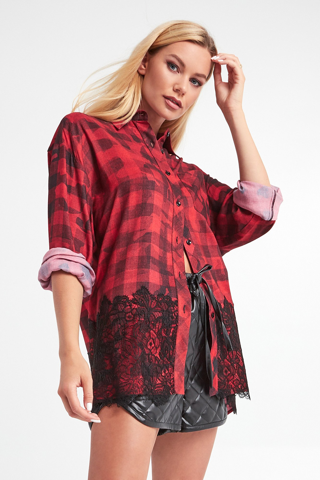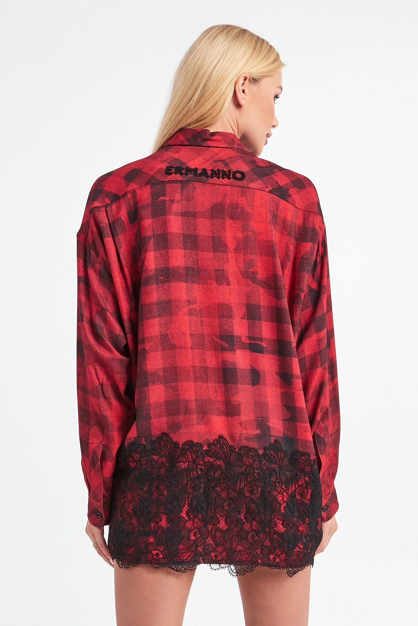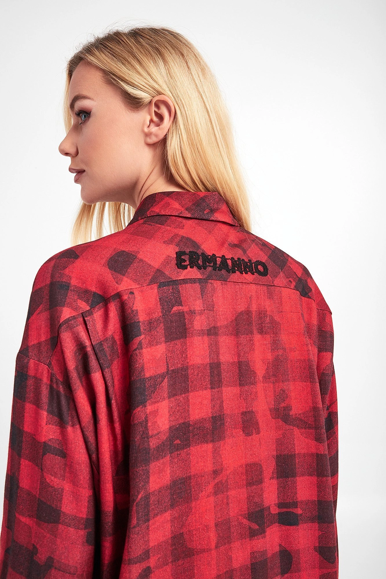 Koszula marki Ermanno Firenze w czerwonym kolorze. Na całości nadruk w postaci kratki z elementami kamuflażu. Luźny fason typu oversize. Zapinana na niewielkie, czarne guziki. Z przodu na piersi z niewielka niezapinana kieszeń. Z klasycznym kołnierzykiem. Długie rękawy zakończone mankietami zapinanymi na guzik. Dół wykończony naszytą czarną koronką. Z tyłu haft z nazwą marki. Wykonana z przyjemnej w dotyku mieszanki rayonu i wełny.